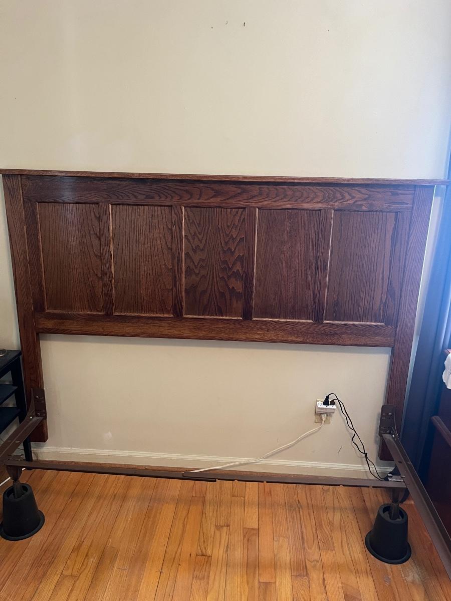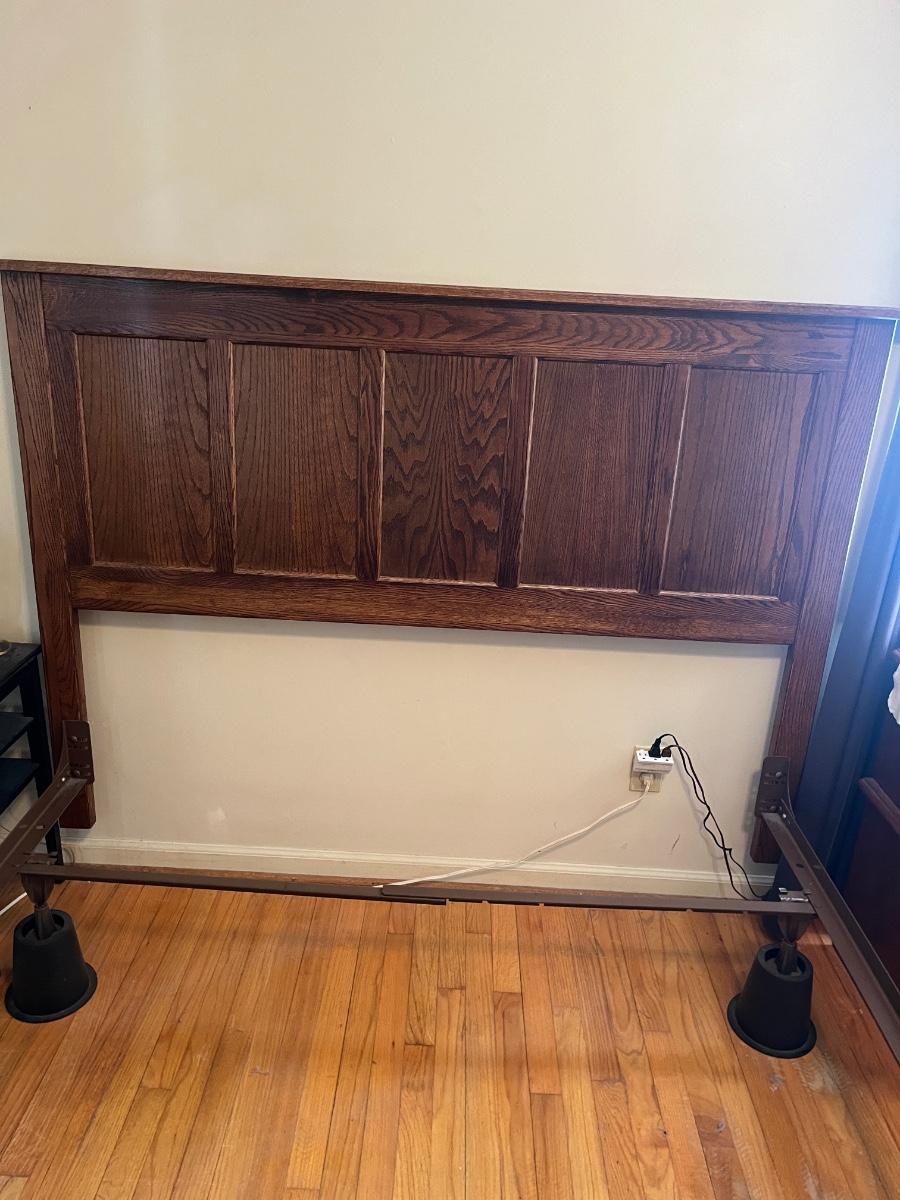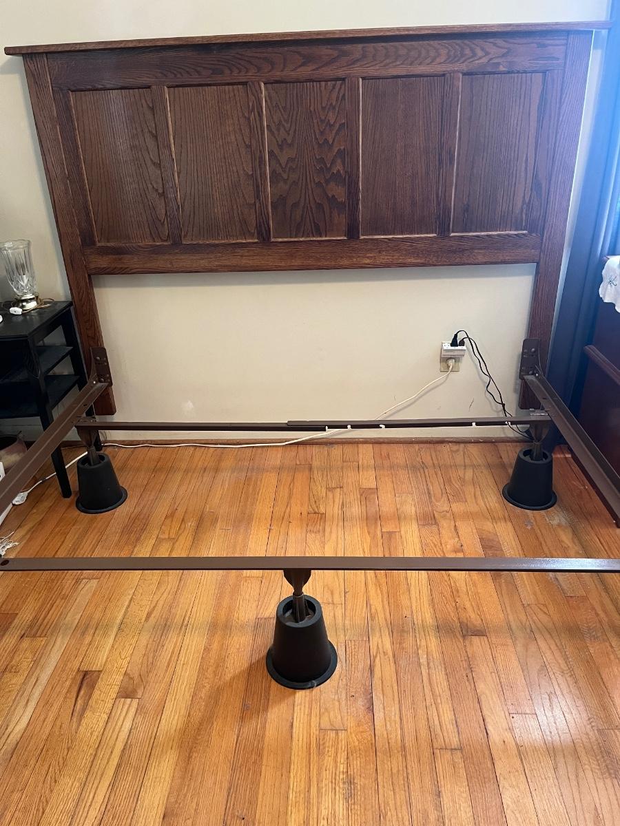 Lot includes a wooden headboard and metal bed frame and five 5"H risers. Headboard measures 66” x 3.5” x 46”H.