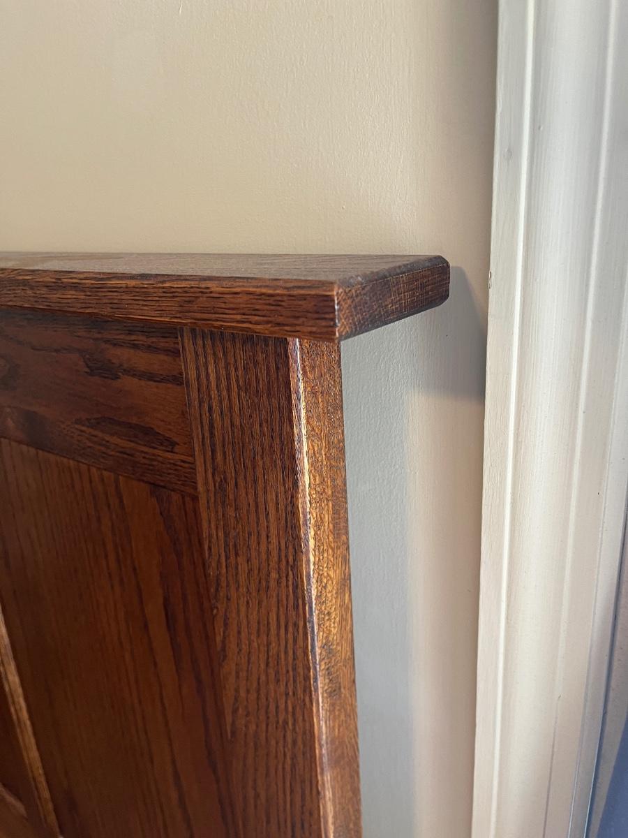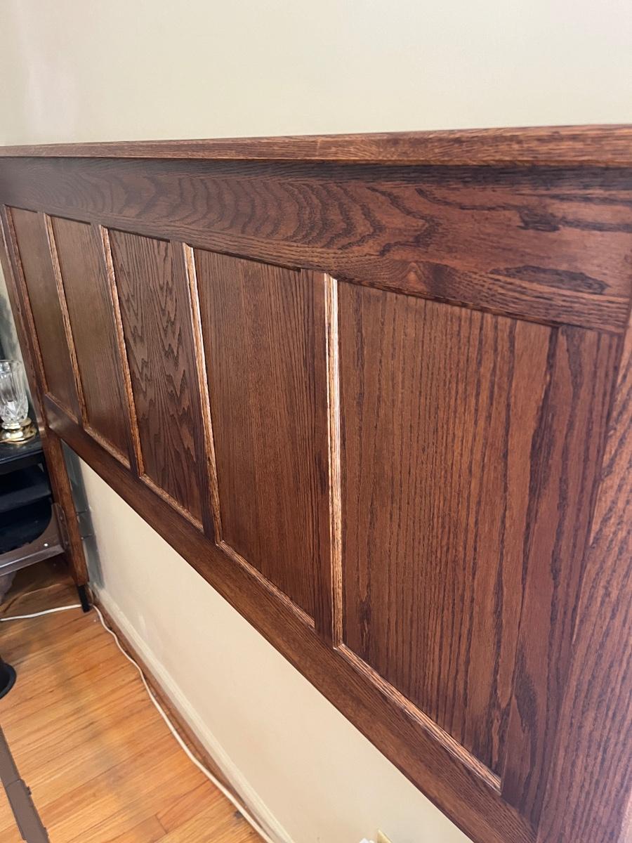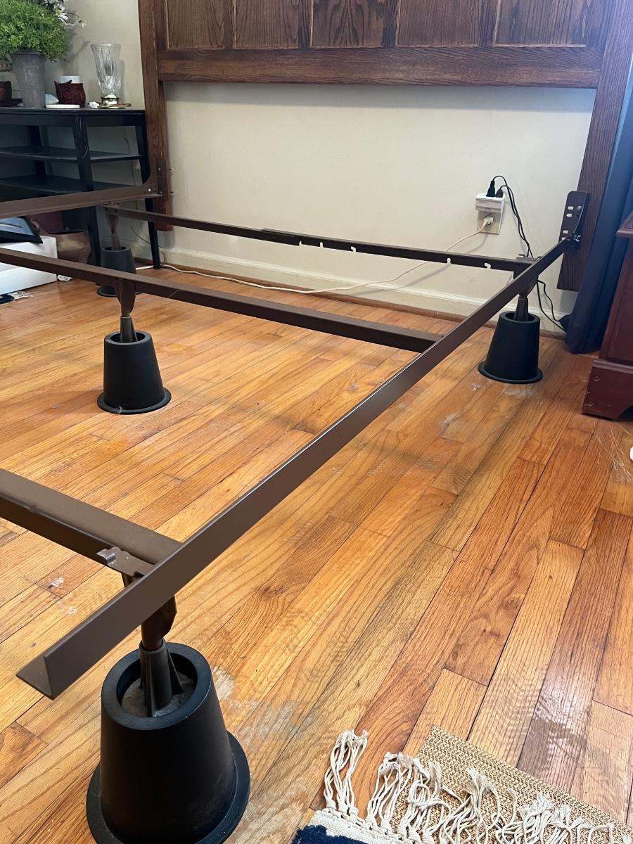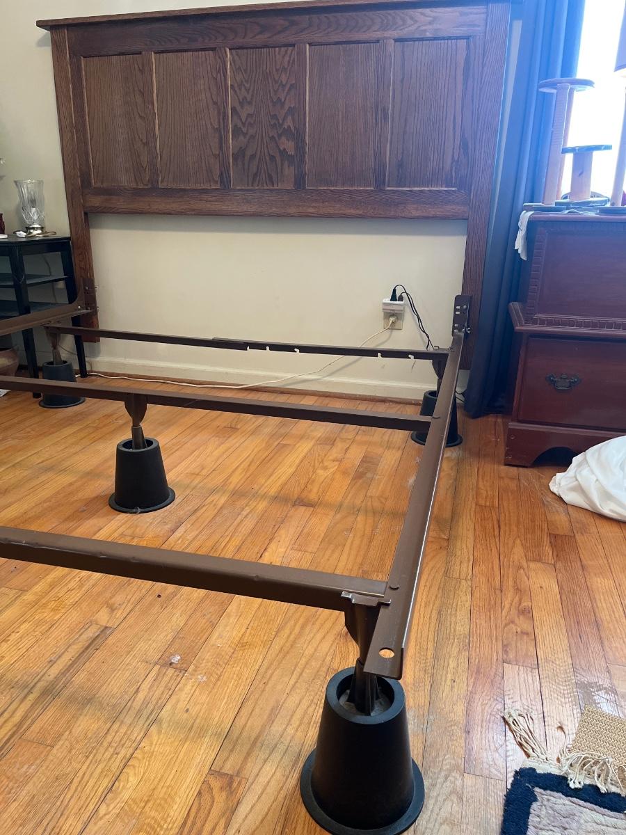 Lot includes a wooden headboard and metal bed frame and five 5"H risers. Headboard measures 66” x 3.5” x 46”H.