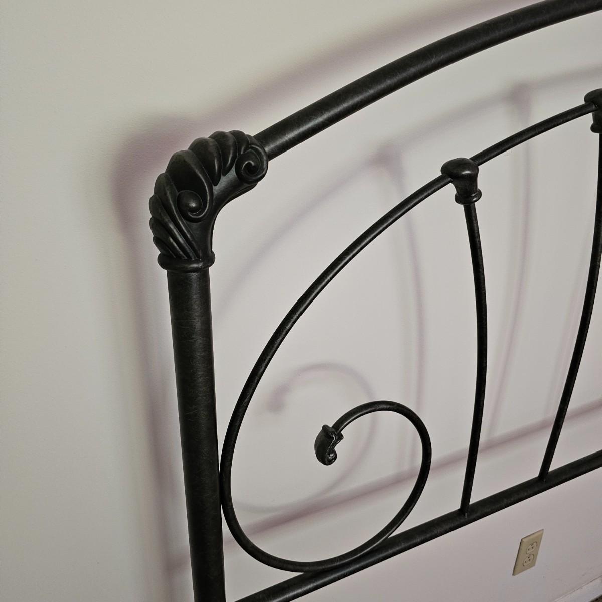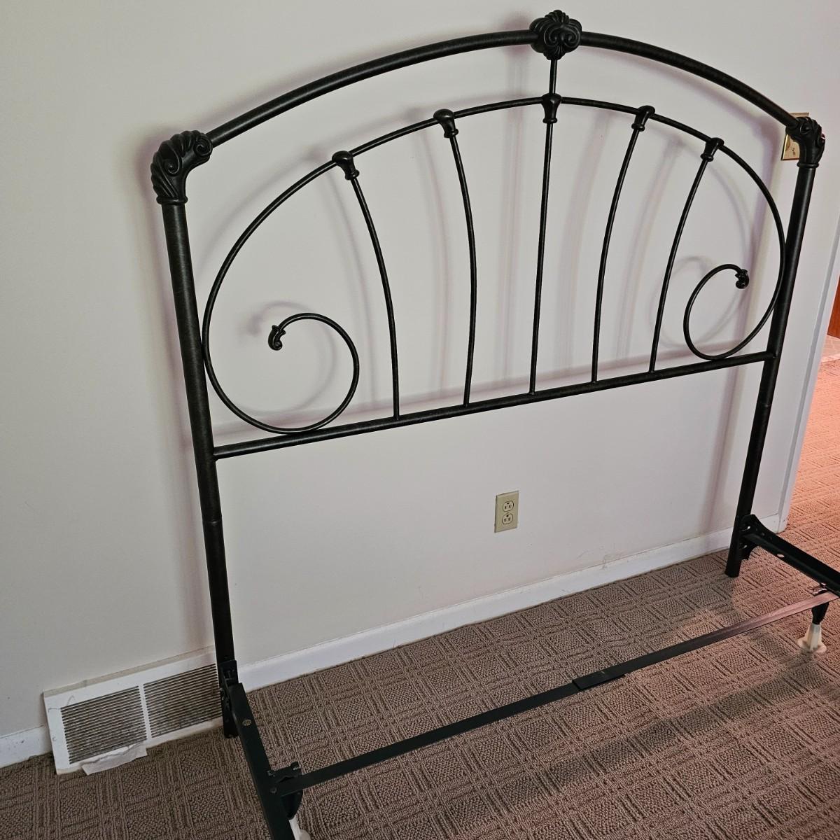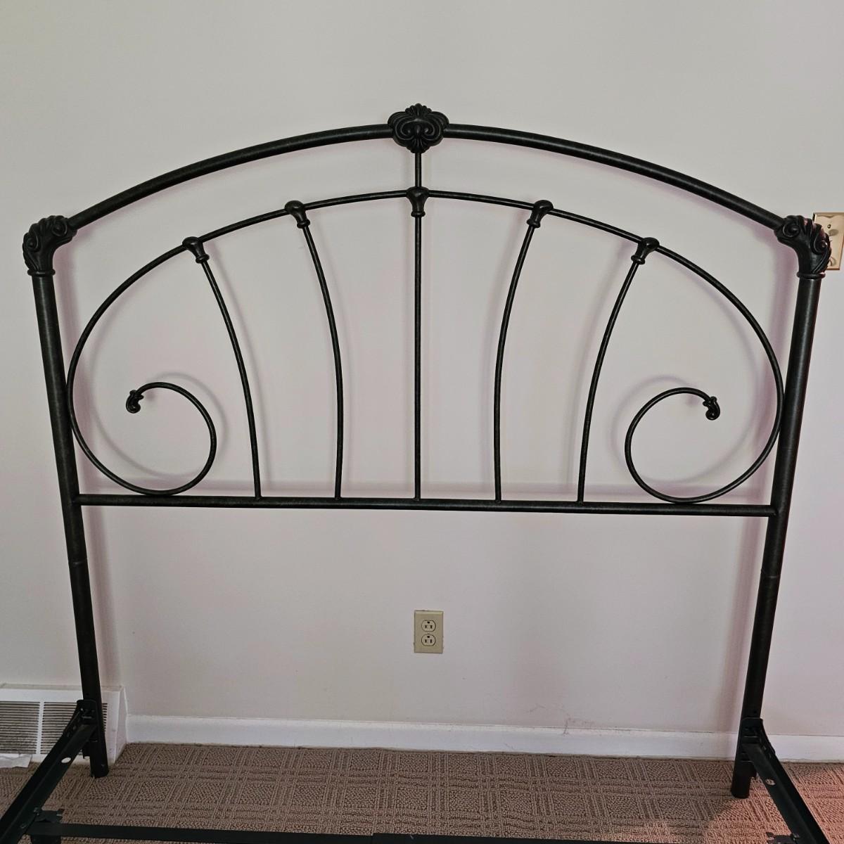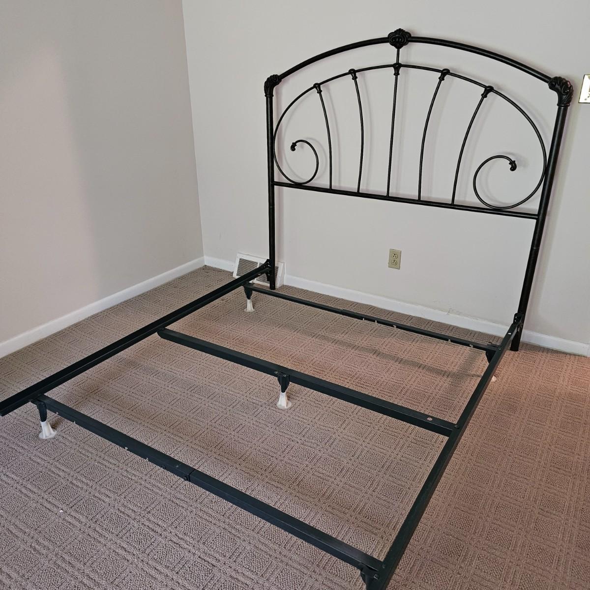 A metal queen size frame with decorative headboard. Frame has five support feet that raise base to 6.5"H. Self supporting cross braces. Entire frame measures 60" x 72"x 59"H. See photos for details. Local pickup only.