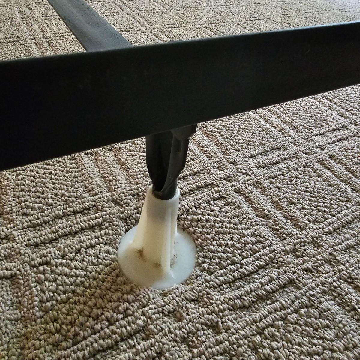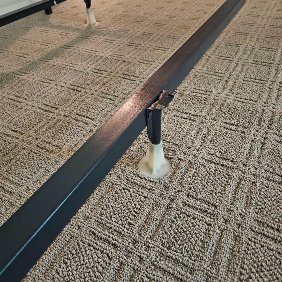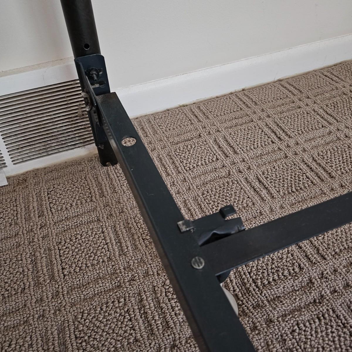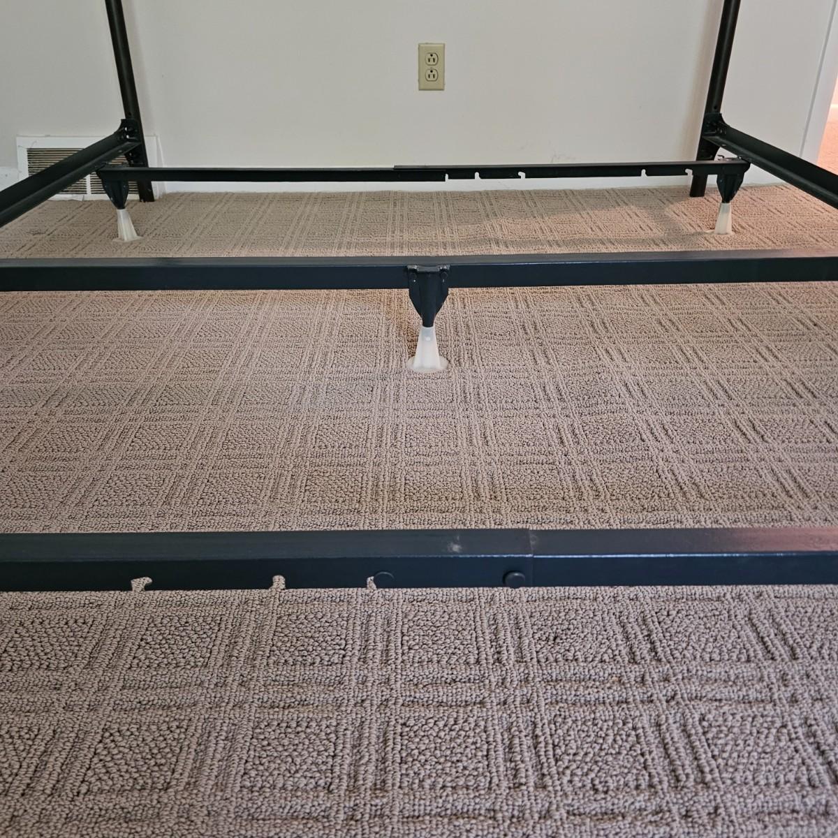 A metal queen size frame with decorative headboard. Frame has five support feet that raise base to 6.5"H. Self supporting cross braces. Entire frame measures 60" x 72"x 59"H. See photos for details. Local pickup only.