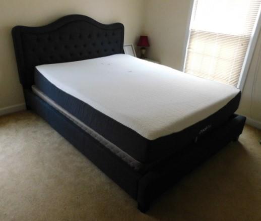 Queen Size Padded Head Board Bed with Memory Foam Mattress seems to be in good condition. Mattress has a few unidentified make up or blood spots but should clean up fine