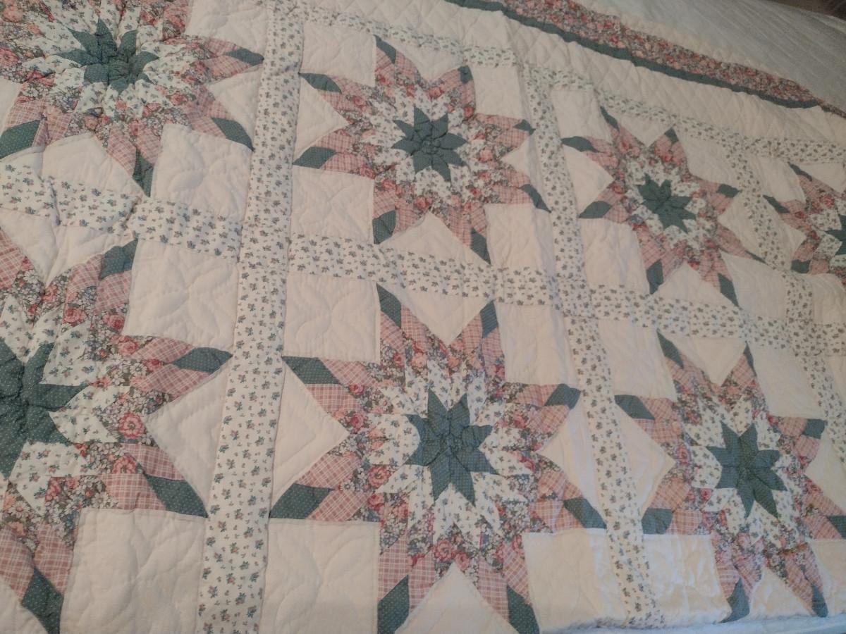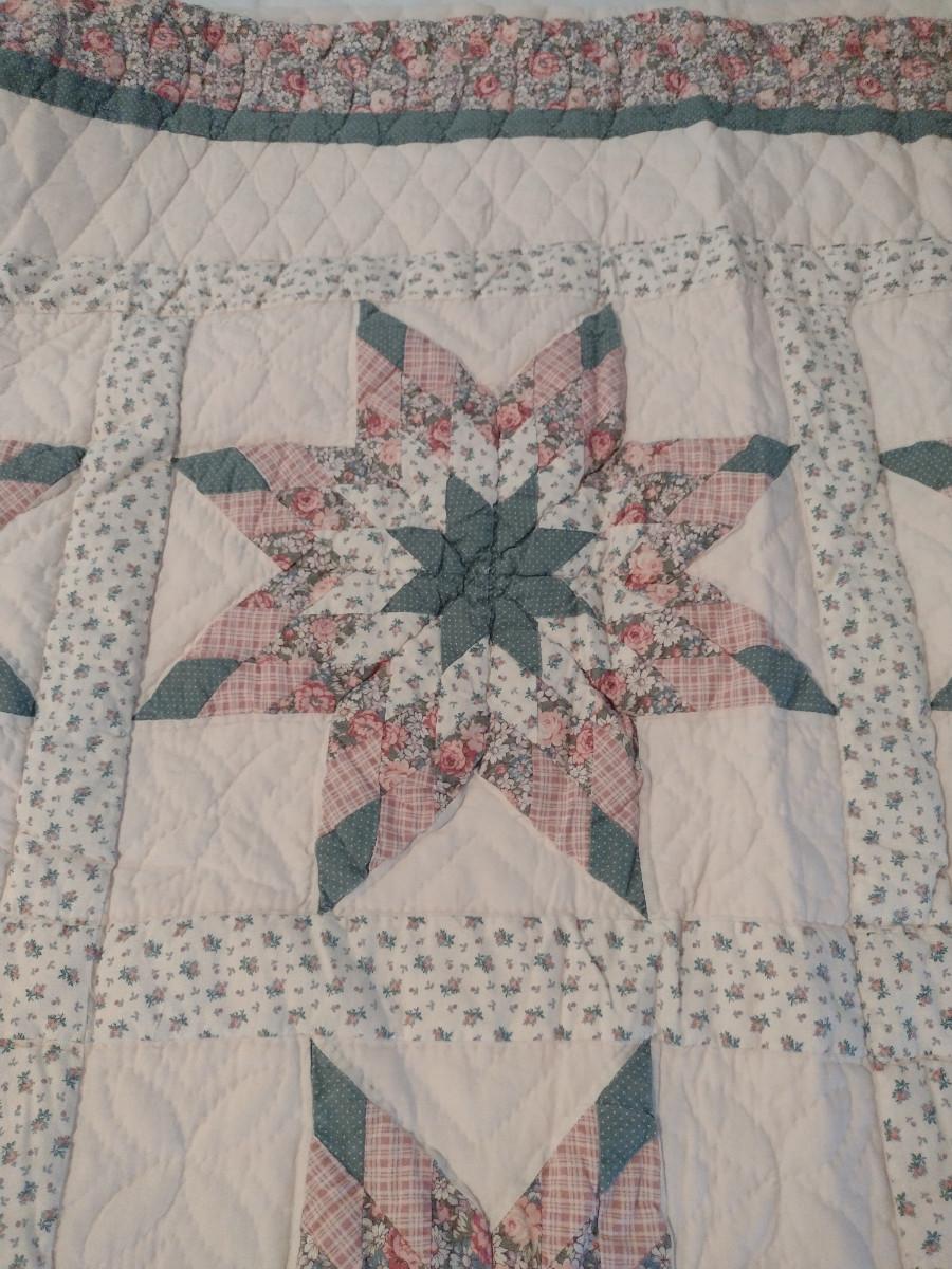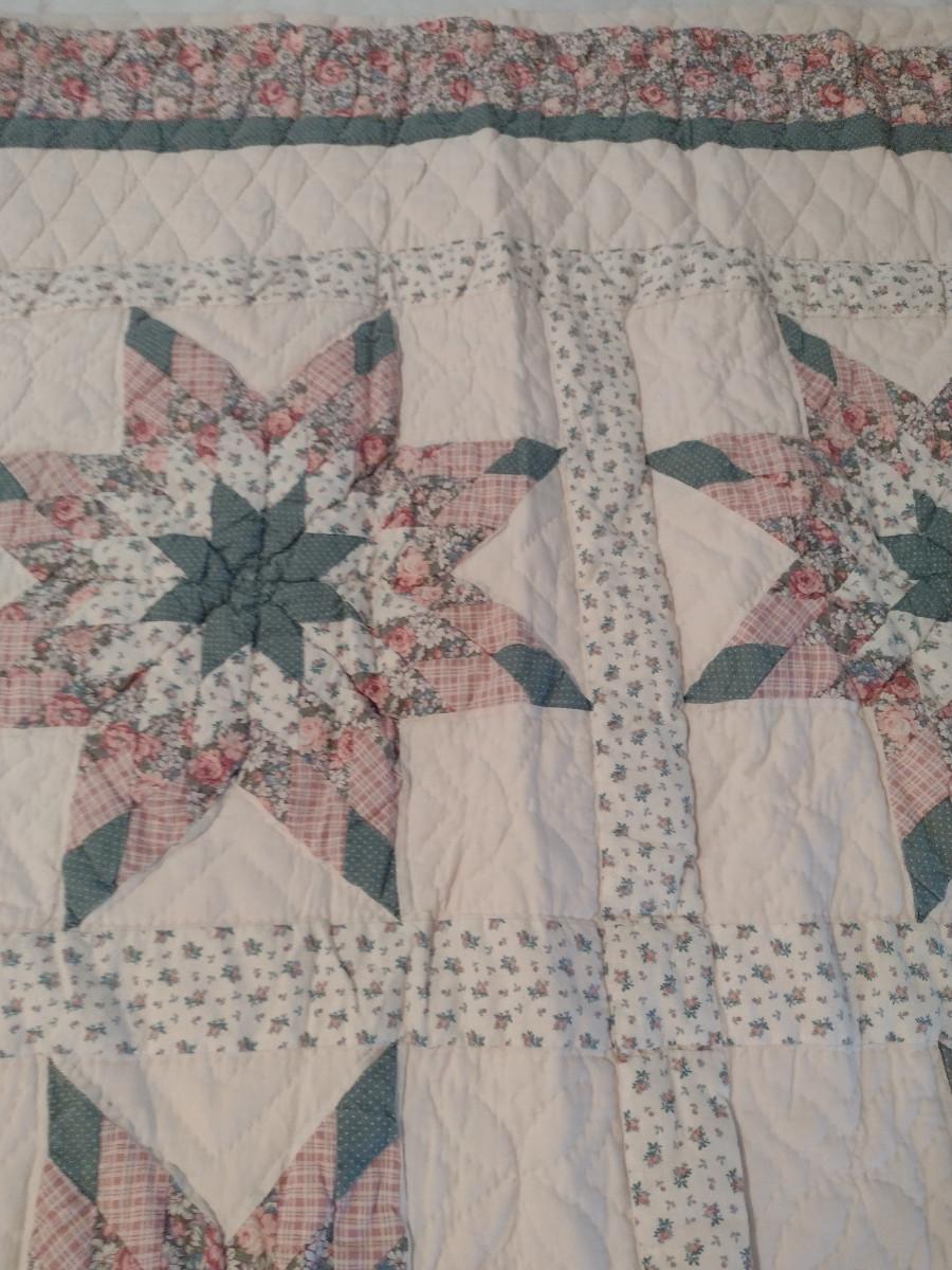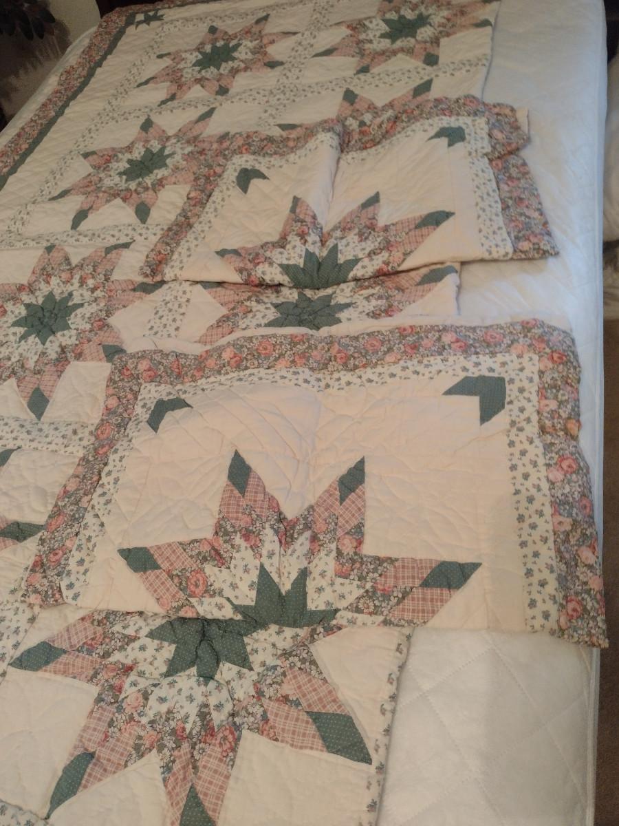 Queen Size Quilt/Coverlet with Two Pillow Shams- Approx 78" x 80". Item is in used condition and may have signs of wear.