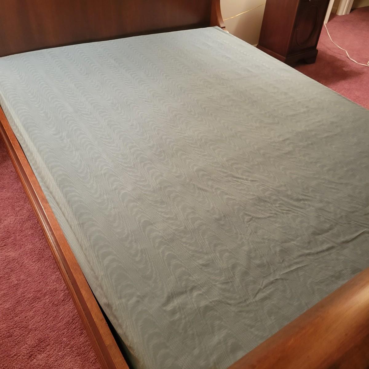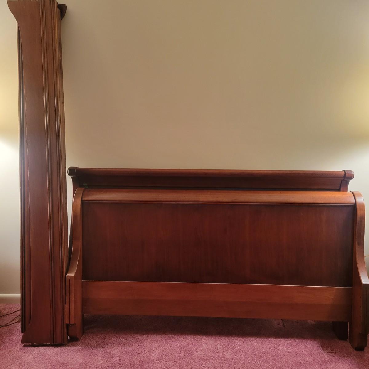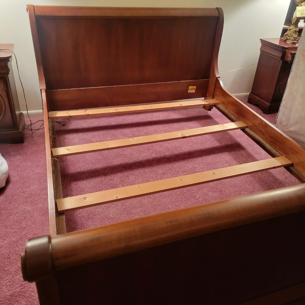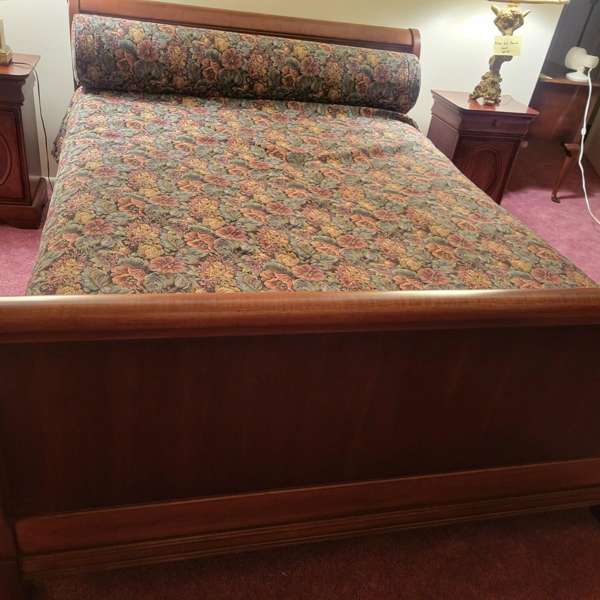 A queen size solid wood sleigh bed, comforter and accent pillow in good condition with no damage. This bedframe has a rich dark brown stain color with slot assembly for the rails and small carved details on the outside edge of the head and foot boards. Includes a floral comforter and accent pillow that is a tapestry type fabric. Winning bidder has the option of taking the SertaPedic mattress and boxspring if desired. The are in good condition. Bed Frame measures approximately 87" x 64" x 37". Winning bidder should bring assistance to move this piece up a flight of stairs. Local pickup only.