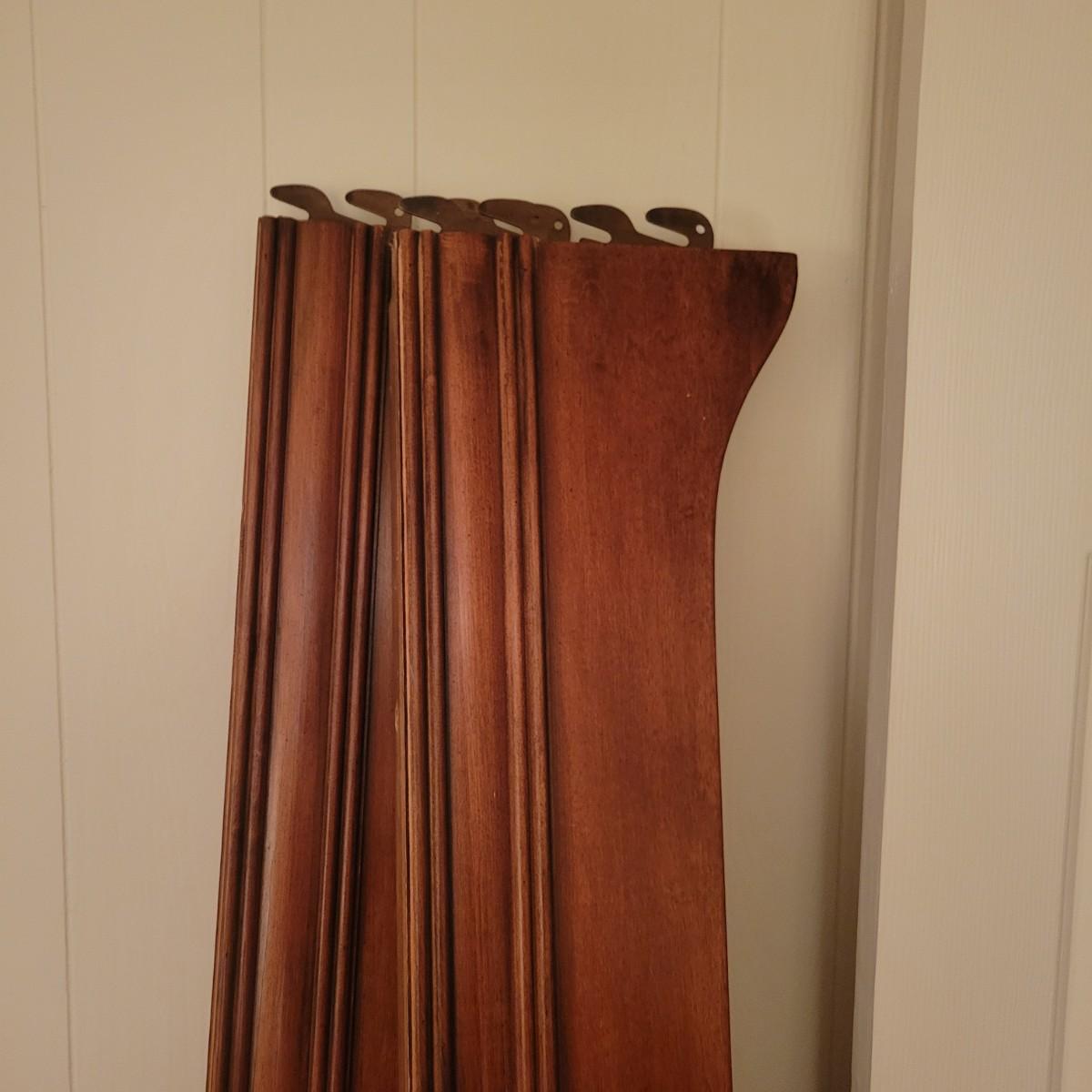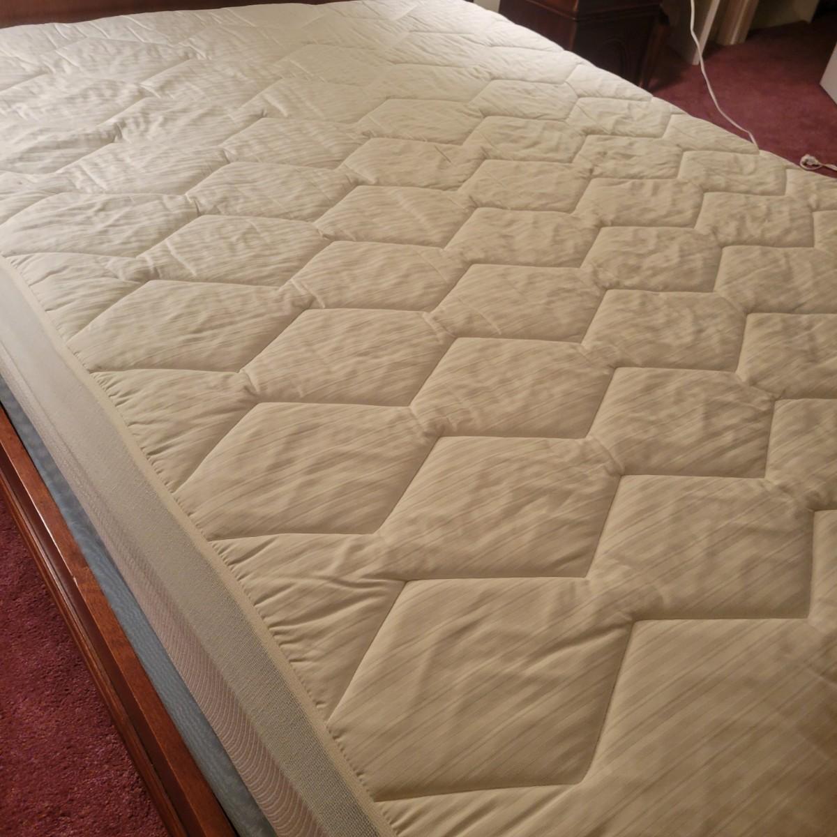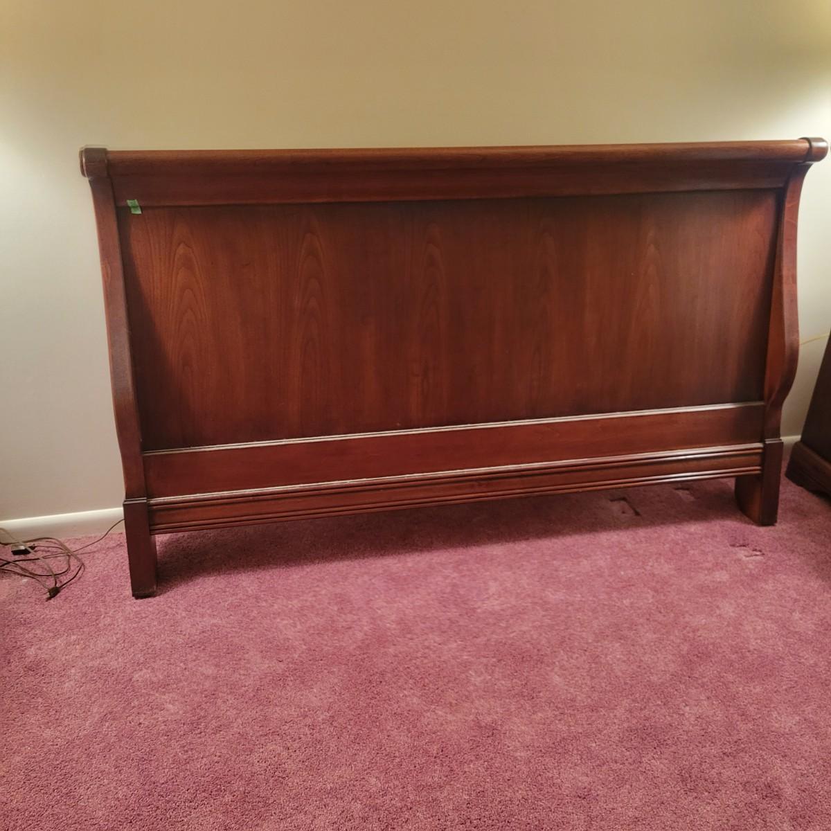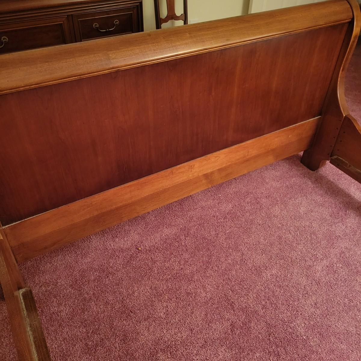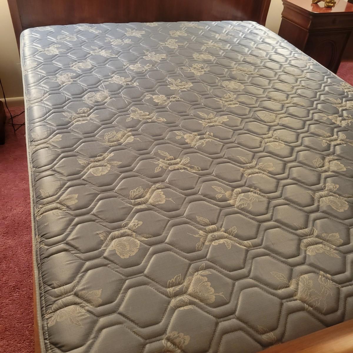 A queen size solid wood sleigh bed, comforter and accent pillow in good condition with no damage. This bedframe has a rich dark brown stain color with slot assembly for the rails and small carved details on the outside edge of the head and foot boards. Includes a floral comforter and accent pillow that is a tapestry type fabric. Winning bidder has the option of taking the SertaPedic mattress and boxspring if desired. The are in good condition. Bed Frame measures approximately 87" x 64" x 37". Winning bidder should bring assistance to move this piece up a flight of stairs. Local pickup only.
