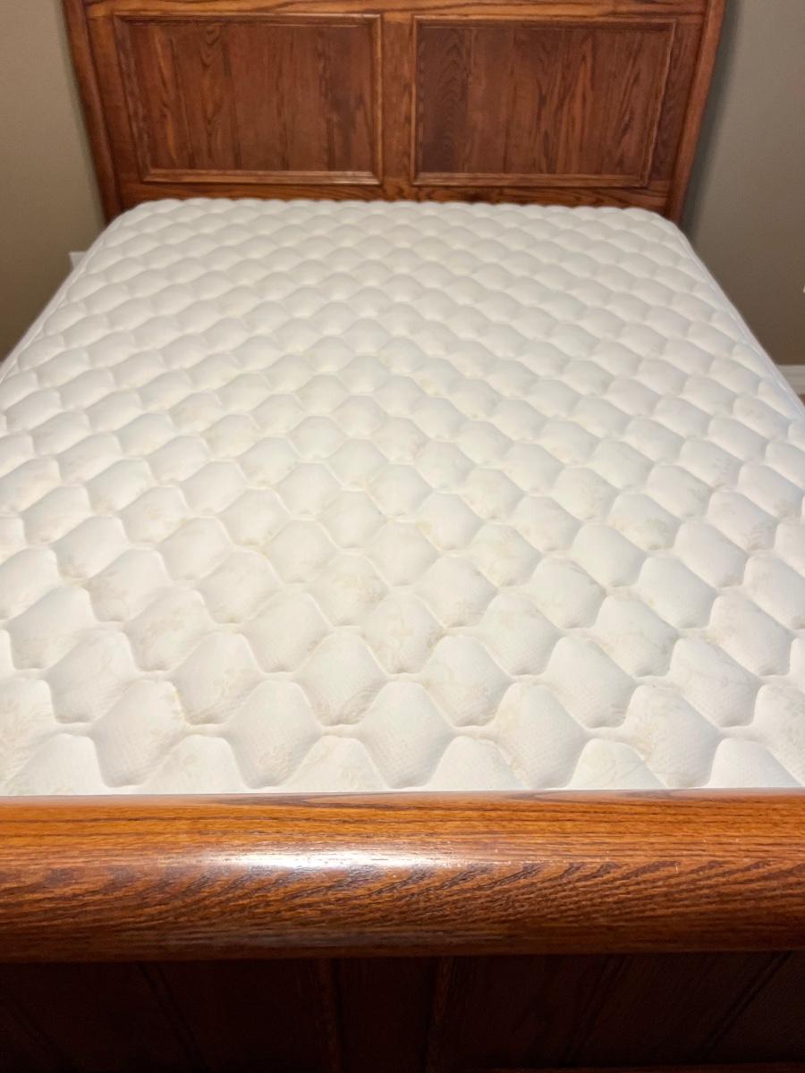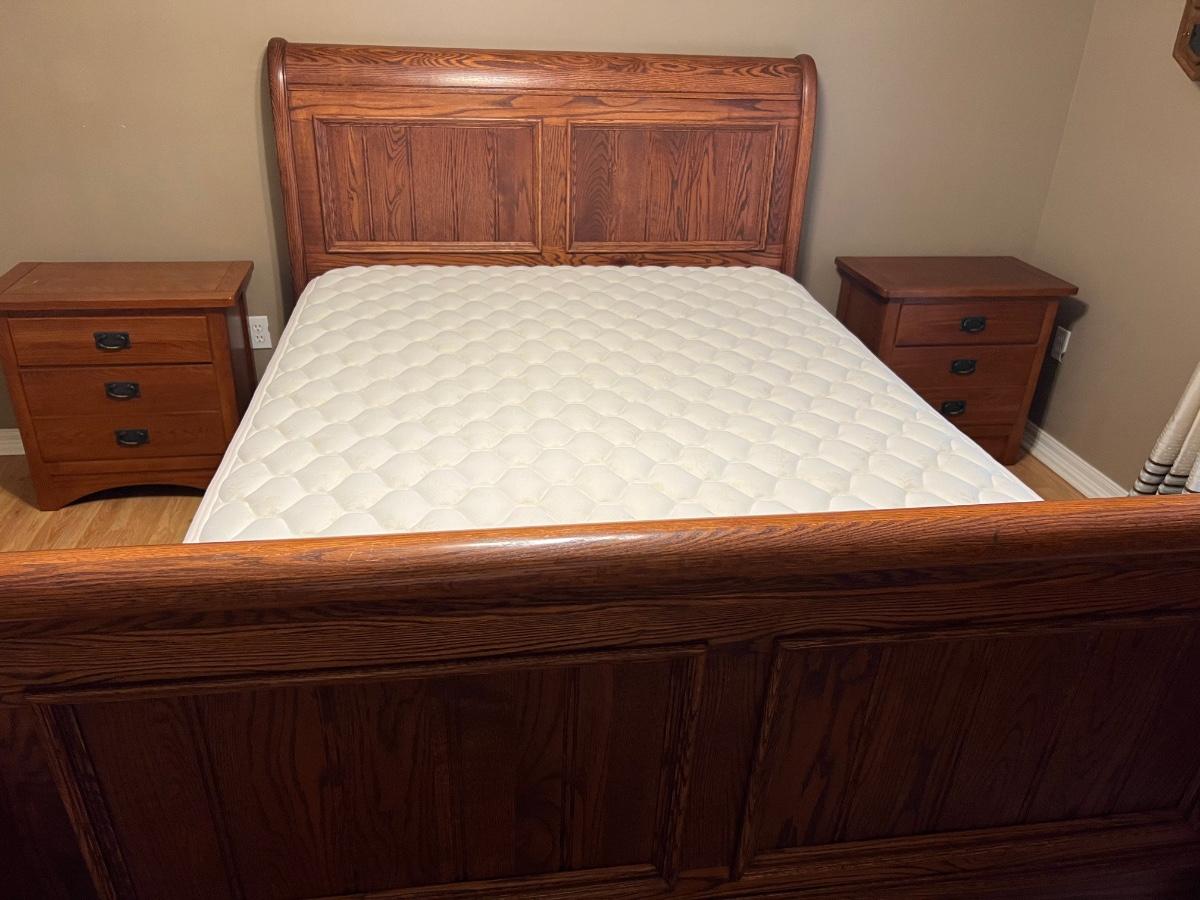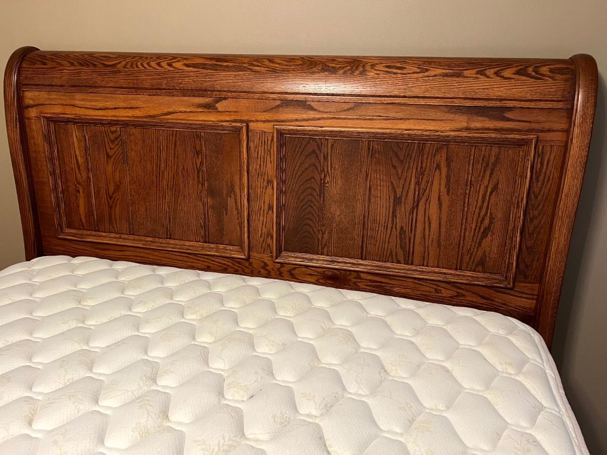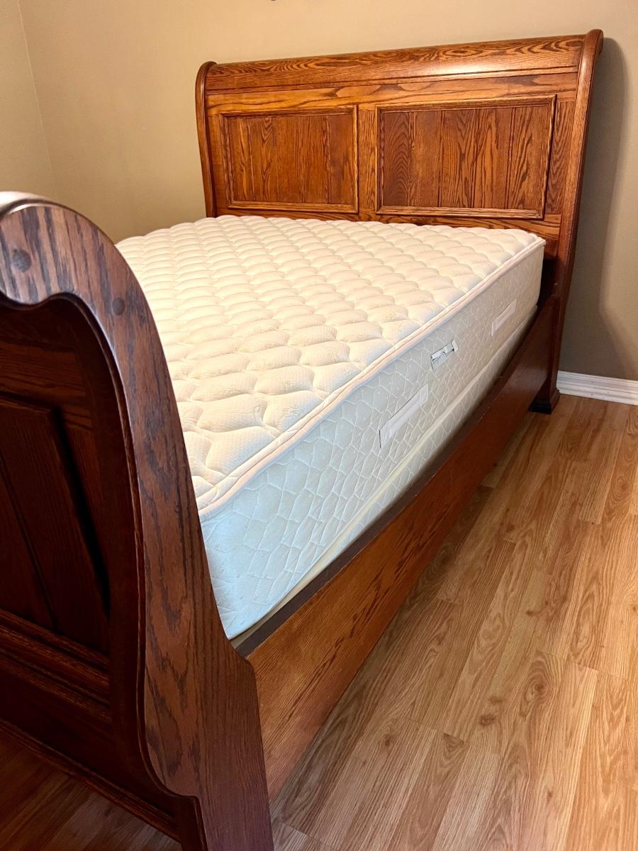 Queen size Solid wood sleigh bed with mattress & box spring. Mattress is firm, and is clean. Winning bidder can chose to leave the mattress and box spring if desired.