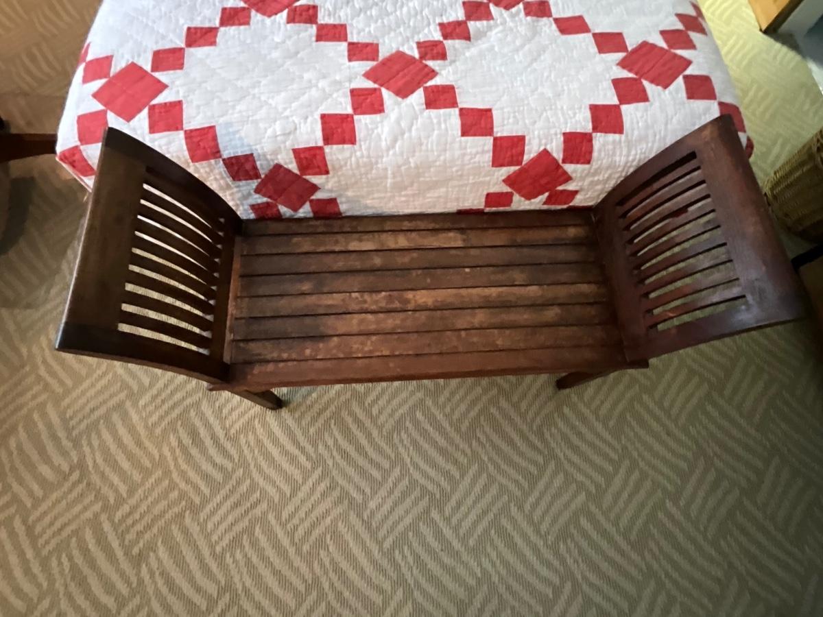 Bench is 44 inches wide, 15.5 inches deep, 29 inches tall. have some staining, etc