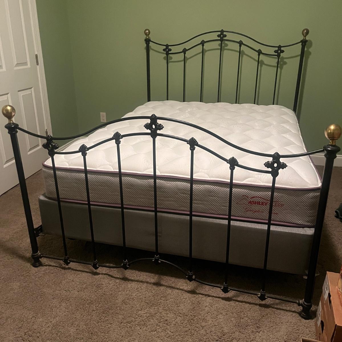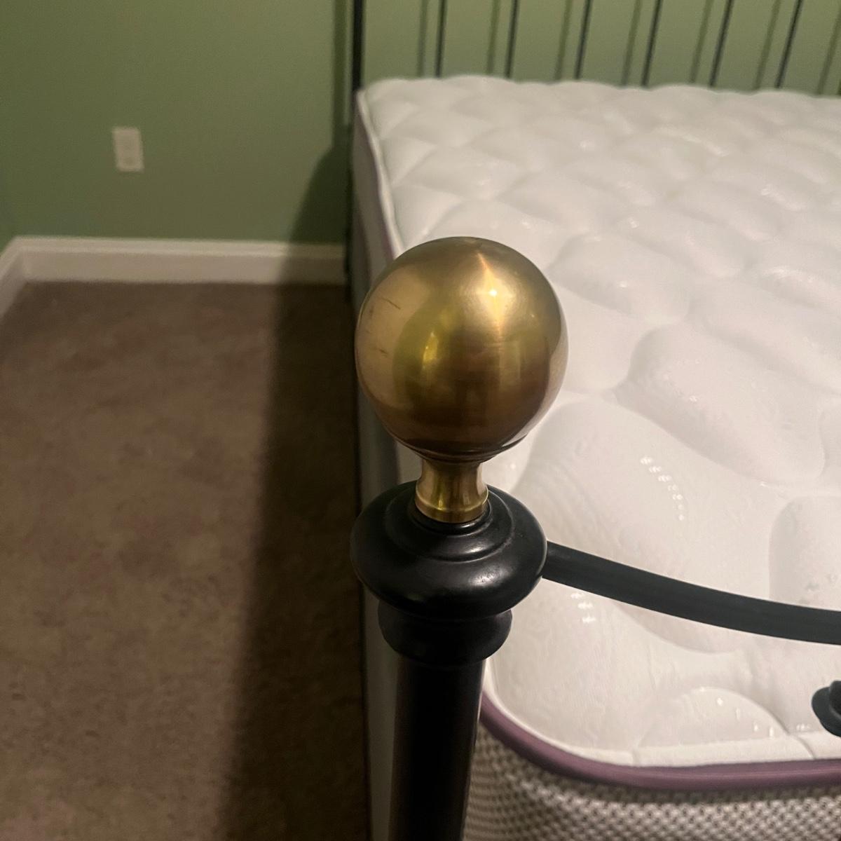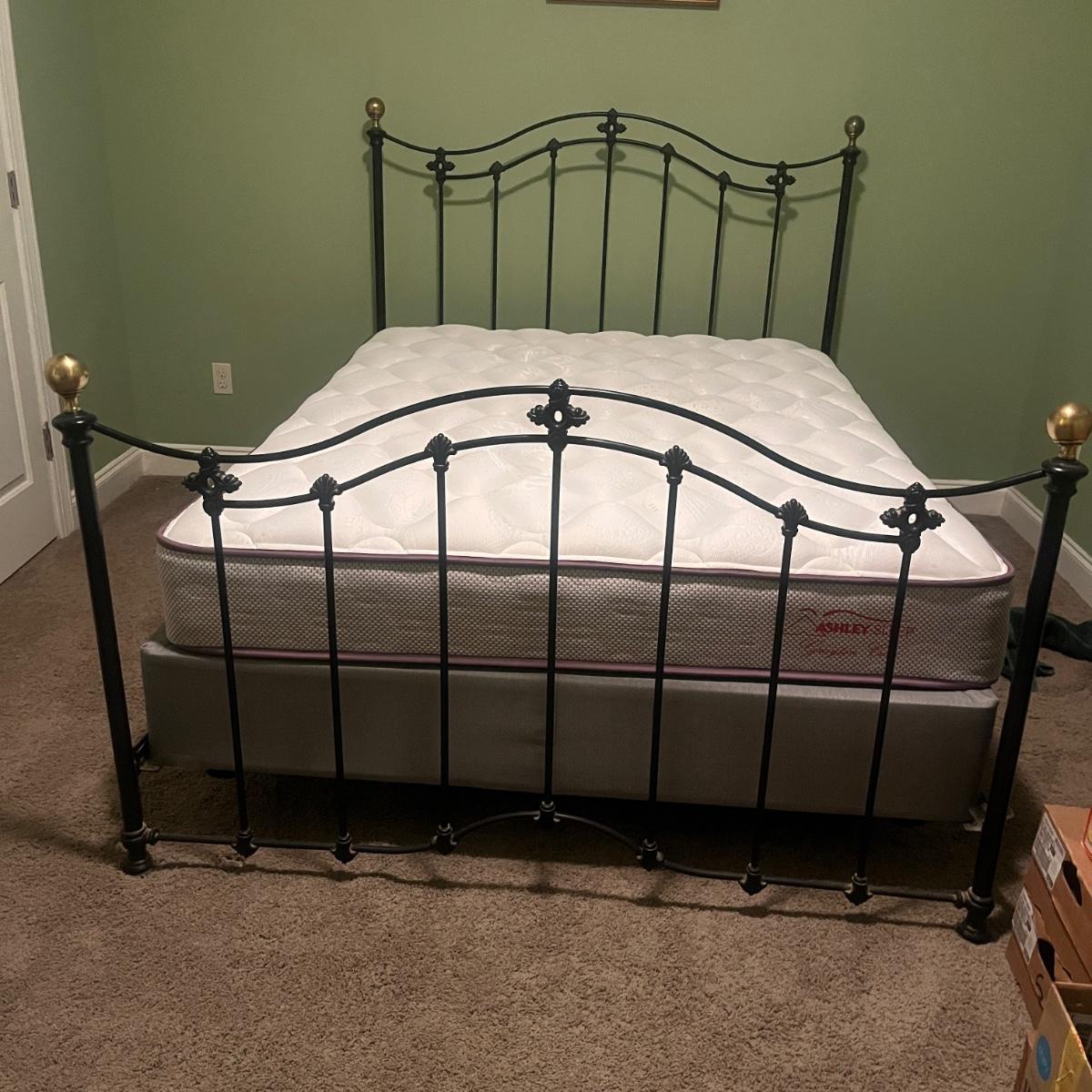 Lot includes a queen-sized black metal bed with brass finials. Bed measures 85” x 61” x 53”H. Queen mattress and box spring are available to winning bidder if desired but not required. Winning bidder will need to dismantle bedframe, and it appears to need an Allen wrench for that. Local pickup only. Winning bidder must bring assistance to help move and load this item due to its weight and/or size. This lot is located in the basement and will need to be either moved up a flight of stairs to the main level and then down a few stairs at the entry, or it can be moved out the back door of the basement and carried up an incline on the side of the house.