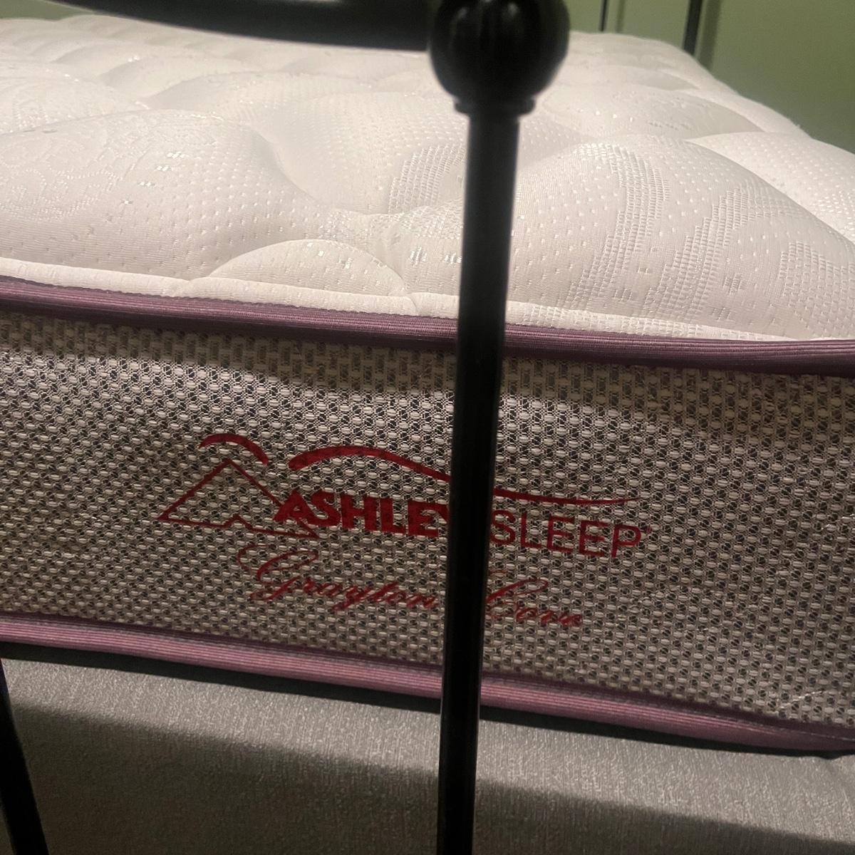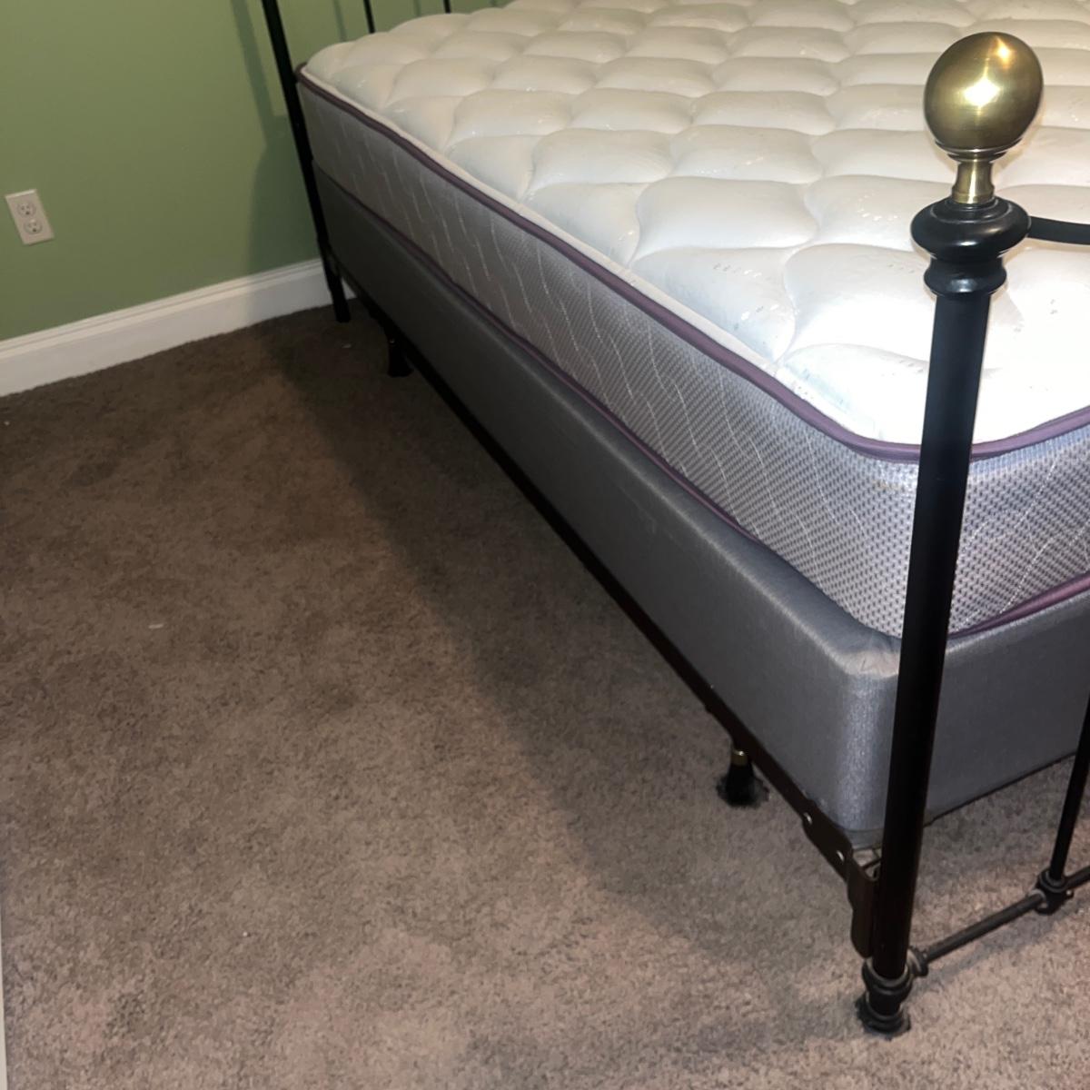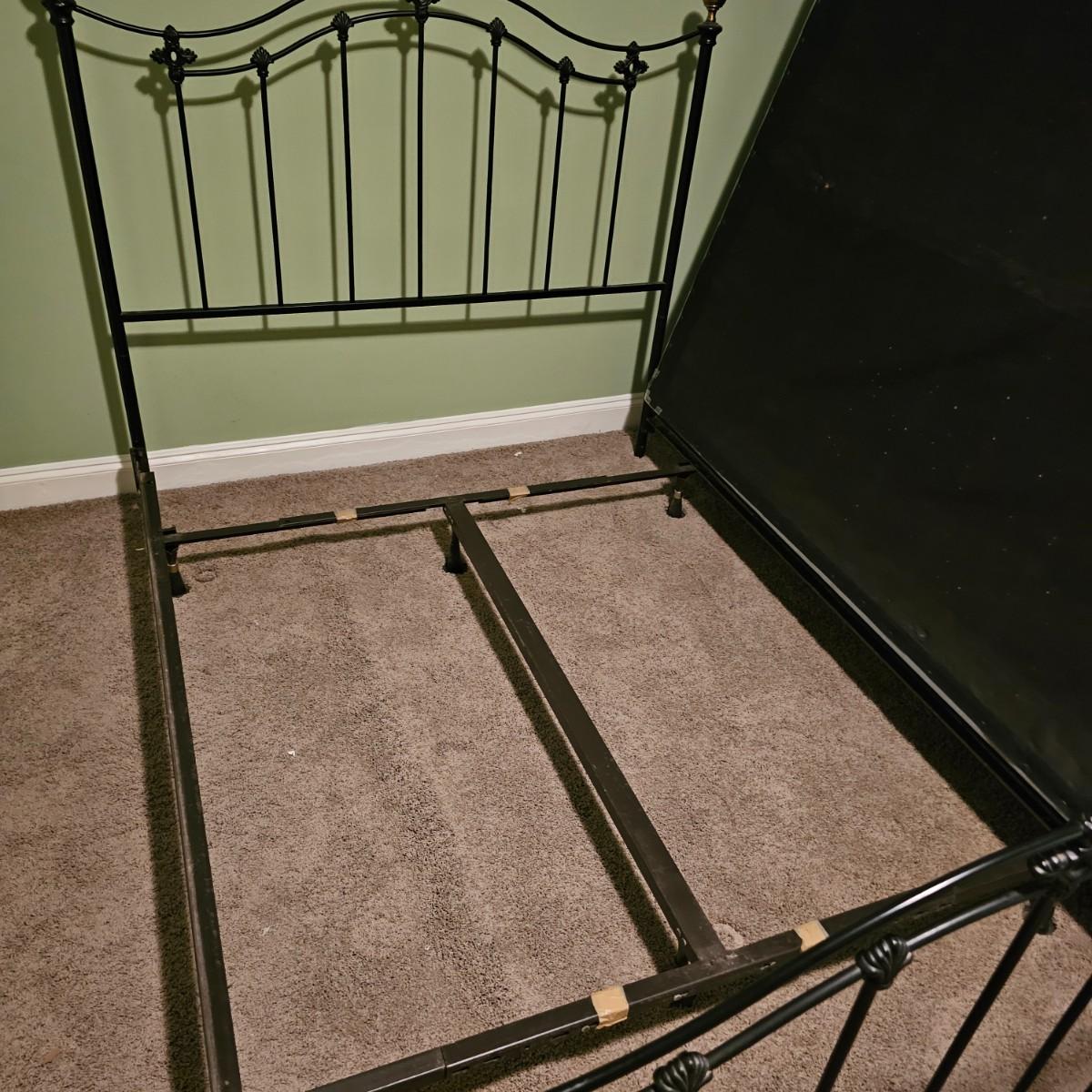 Lot includes a queen-sized black metal bed with brass finials. Bed measures 85” x 61” x 53”H. Queen mattress and box spring are available to winning bidder if desired but not required. Winning bidder will need to dismantle bedframe, and it appears to need an Allen wrench for that. Local pickup only. Winning bidder must bring assistance to help move and load this item due to its weight and/or size. This lot is located in the basement and will need to be either moved up a flight of stairs to the main level and then down a few stairs at the entry, or it can be moved out the back door of the basement and carried up an incline on the side of the house.