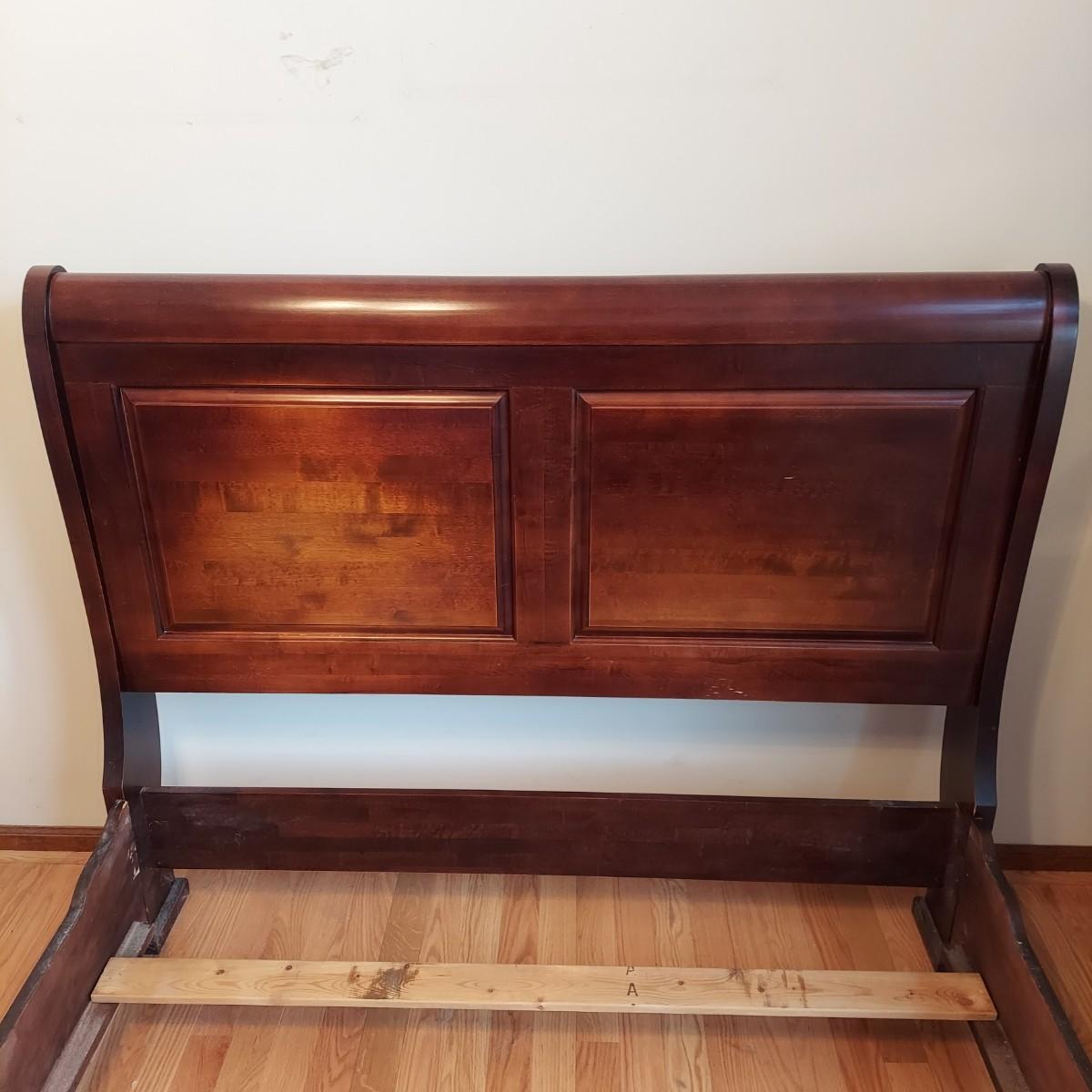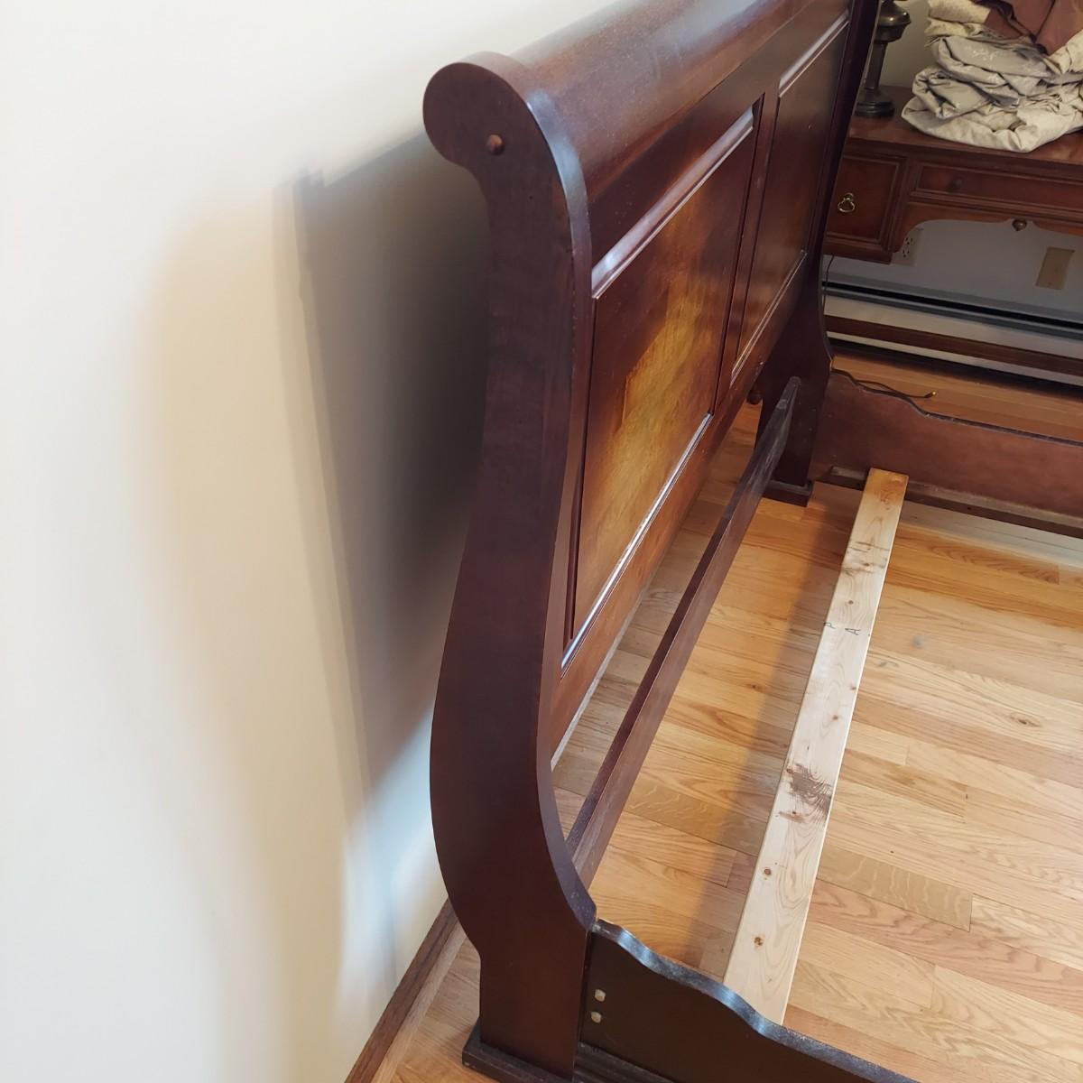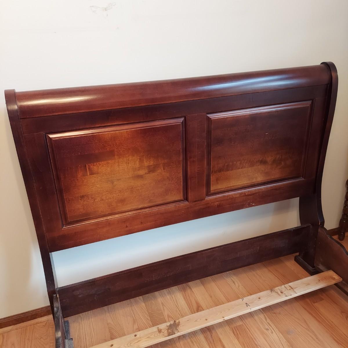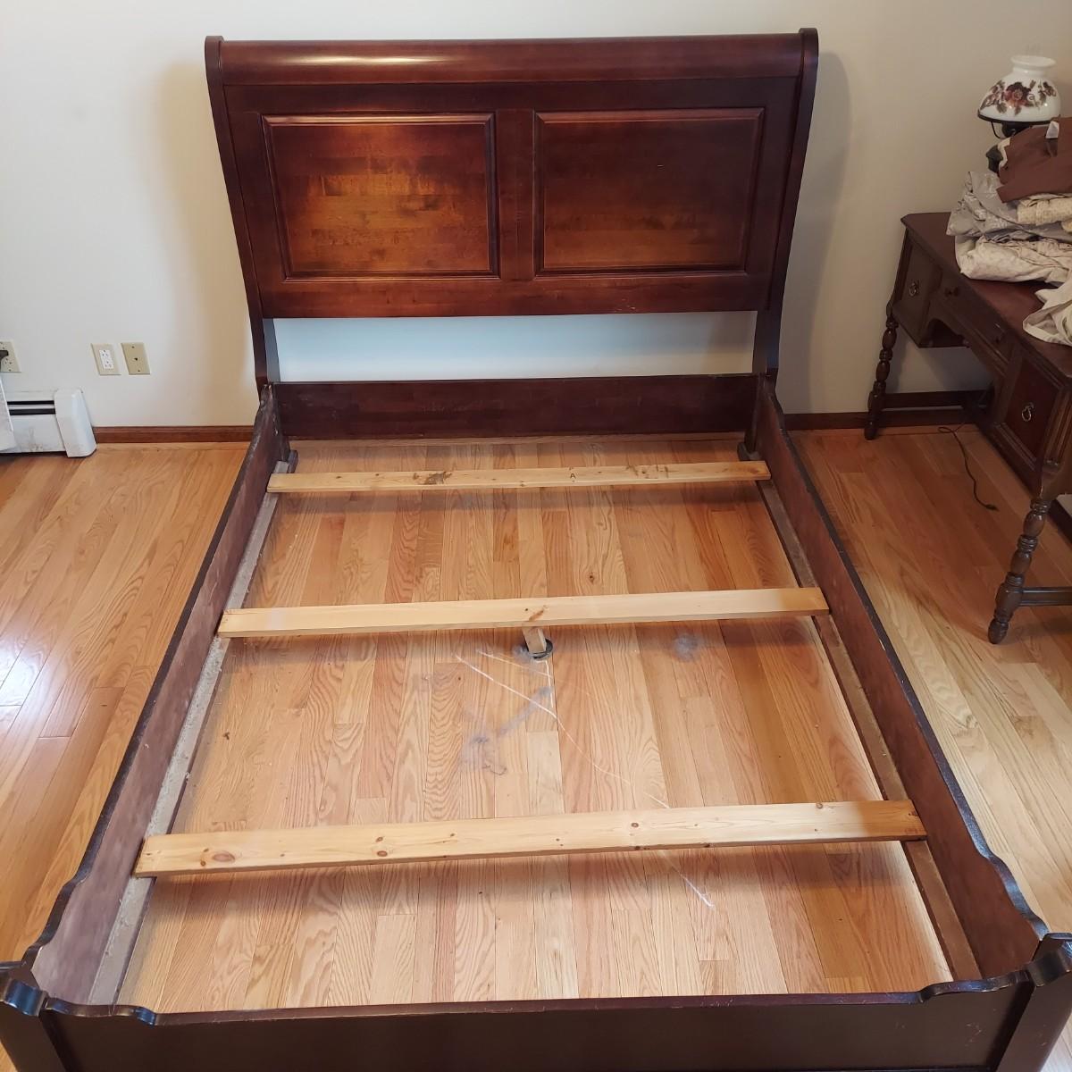 Wooden bed frame with Sleigh style headboard. Measures approximately 63” x 88” x 51"H. There are a few scratches on the surface; see photos. Please see photos for details. Bed is disassembled and does not come with a mattress. Local Pickup Only. Winning bidder must bring assistance to help move and load this item due to its weight and/or size.