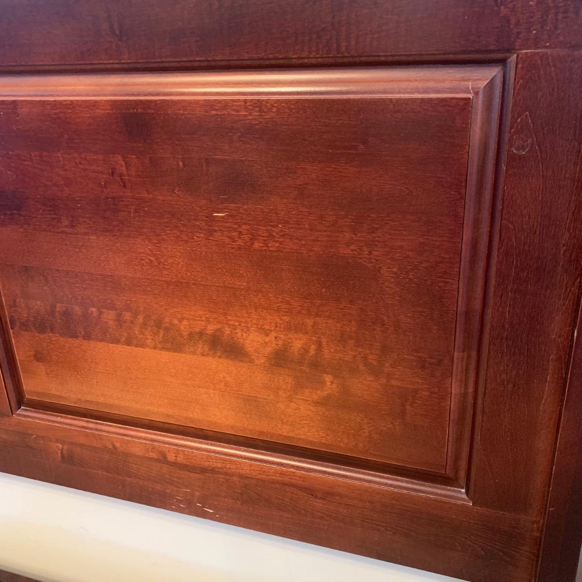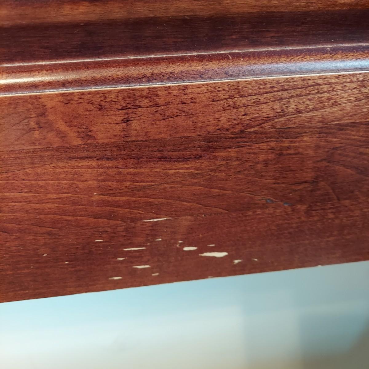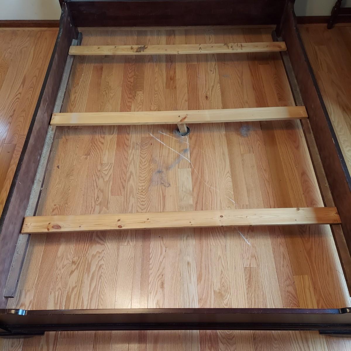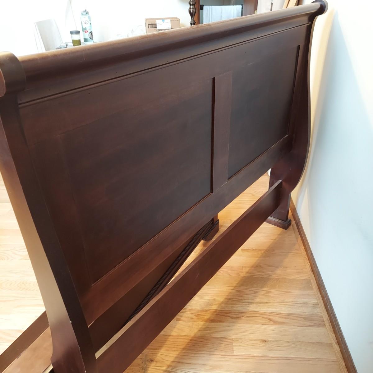 Wooden bed frame with Sleigh style headboard. Measures approximately 63” x 88” x 51"H. There are a few scratches on the surface; see photos. Please see photos for details. Bed is disassembled and does not come with a mattress. Local Pickup Only. Winning bidder must bring assistance to help move and load this item due to its weight and/or size.