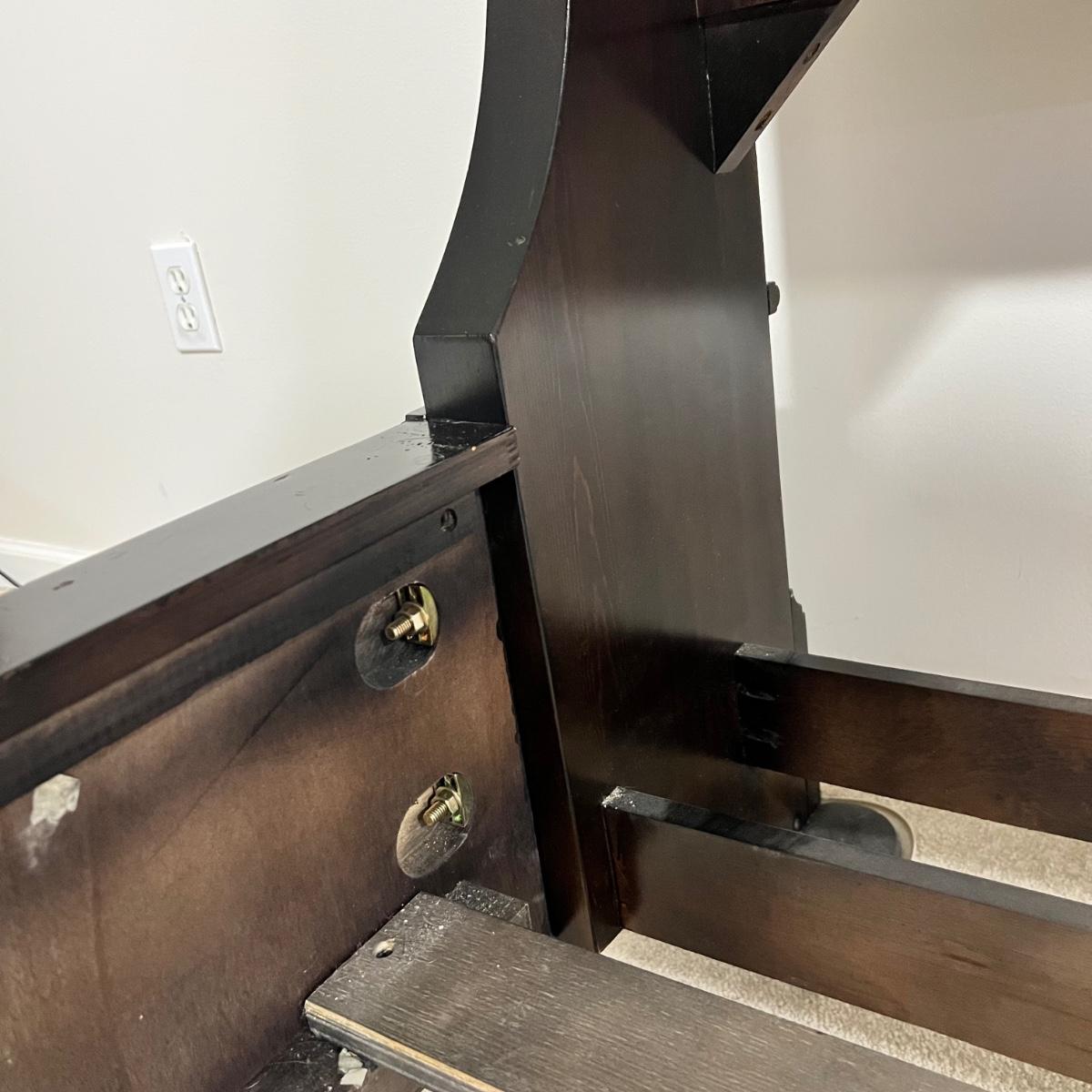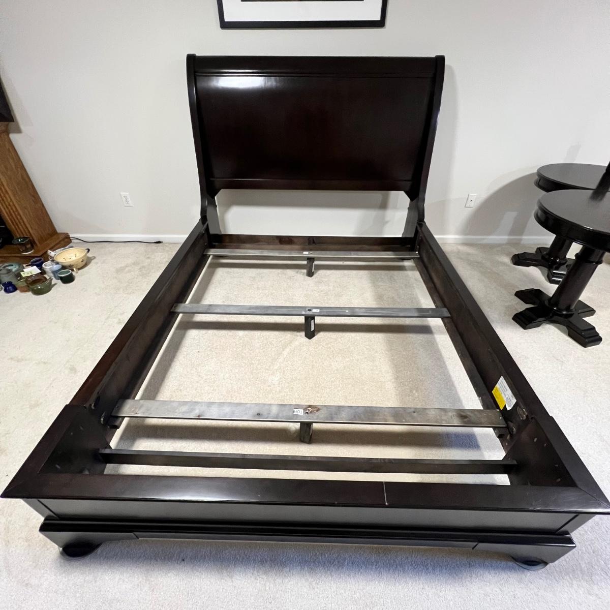 This wooden sleigh bed has a very dark brown finish. Winning bidder will be responsible for dismantling it themselves, see pics for tools needed. The headboard measures 66” x 54”H, the sides measure 87”. The pair of side tables seen in photos are not included but are available in another lot in this sale and match this bed.