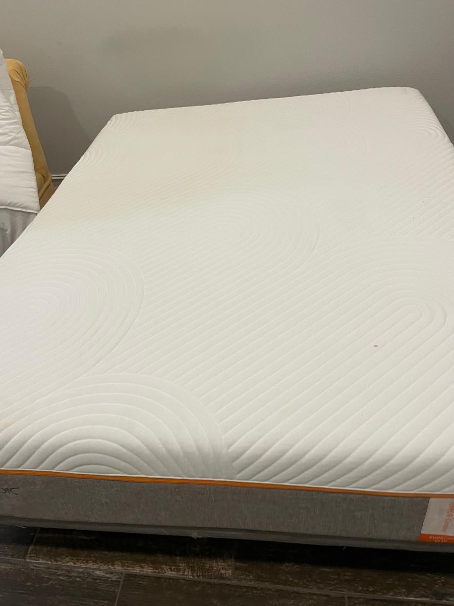 Tempur-Contour Supreme mattress set Includes metal frame and "Bunky" board to be used in place of a box spring. Mattress cover shows faint signs of wear but it is in good condition