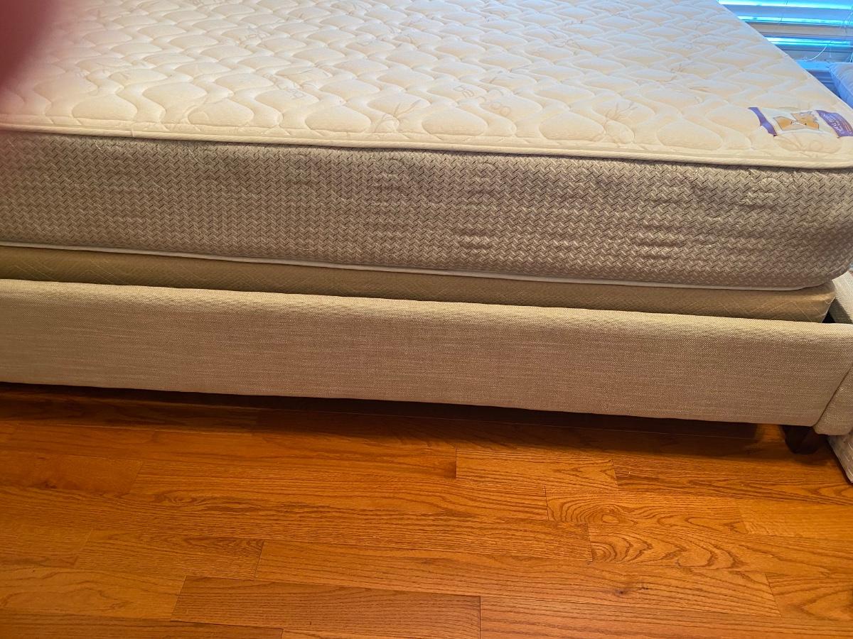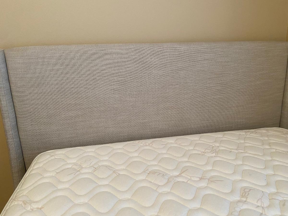 Queen upholstered headboard, footboard and rails, light tan, kind of a linen-look. Spare bedroom, hardly used. Very nice