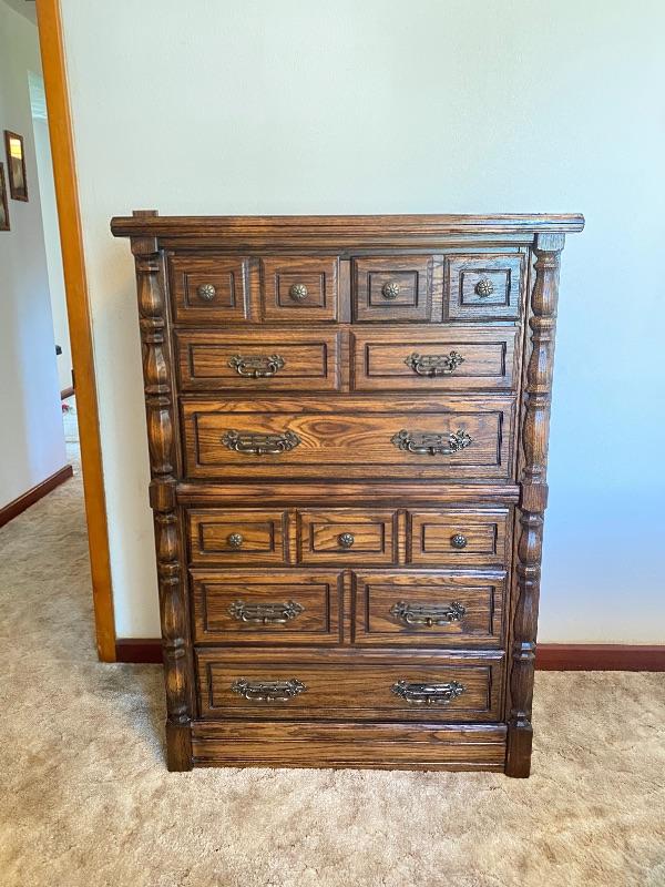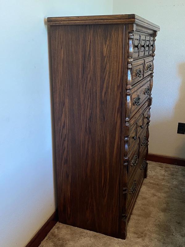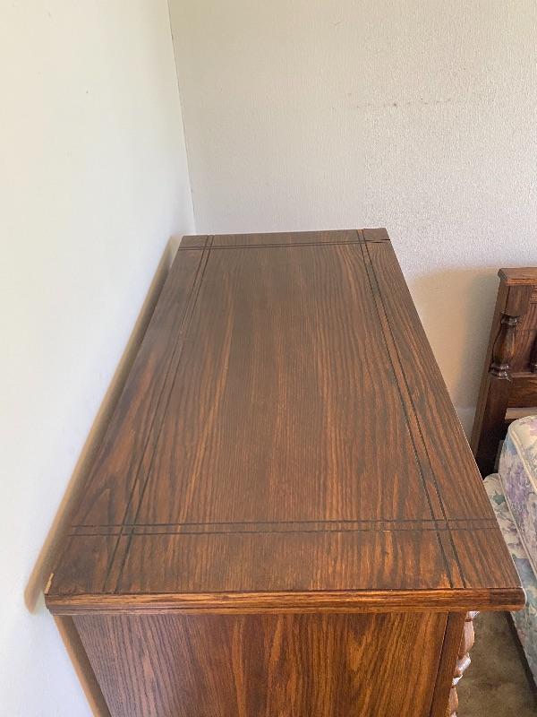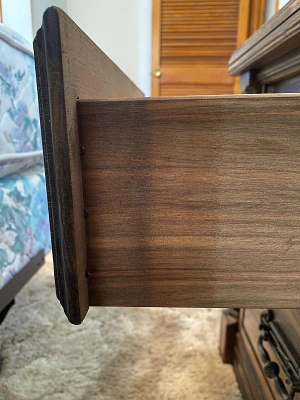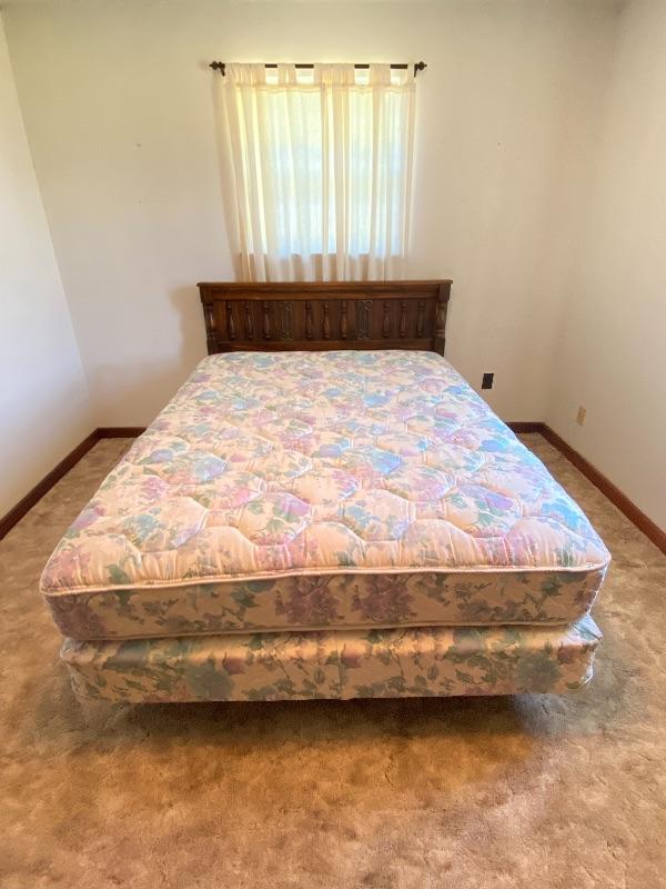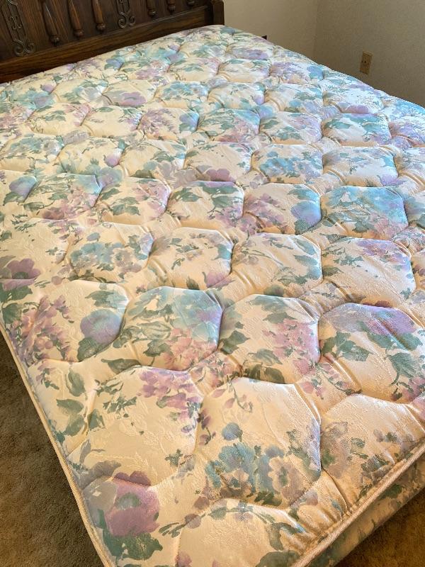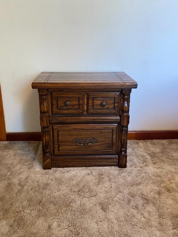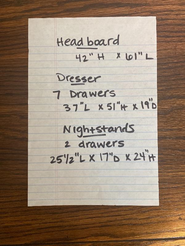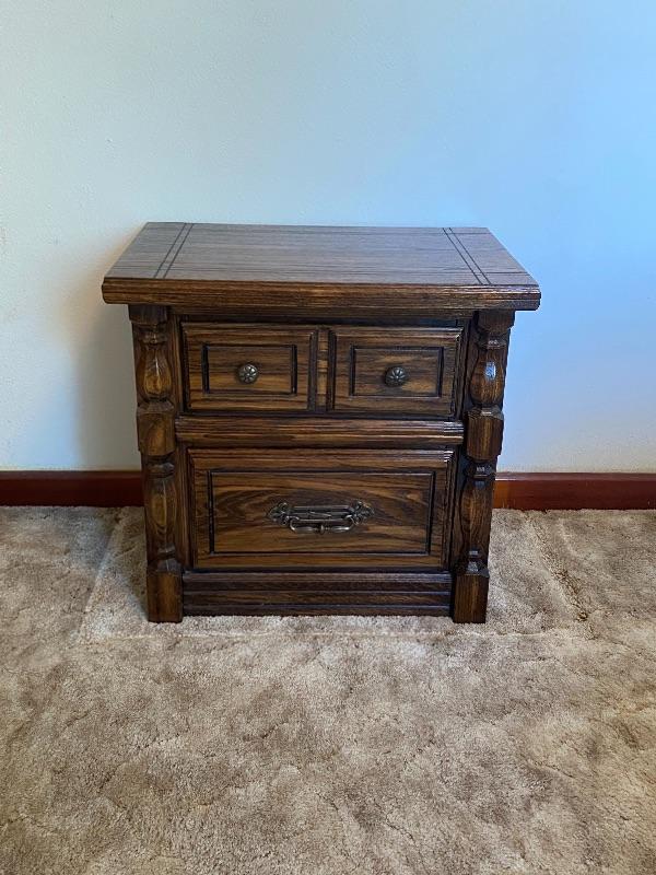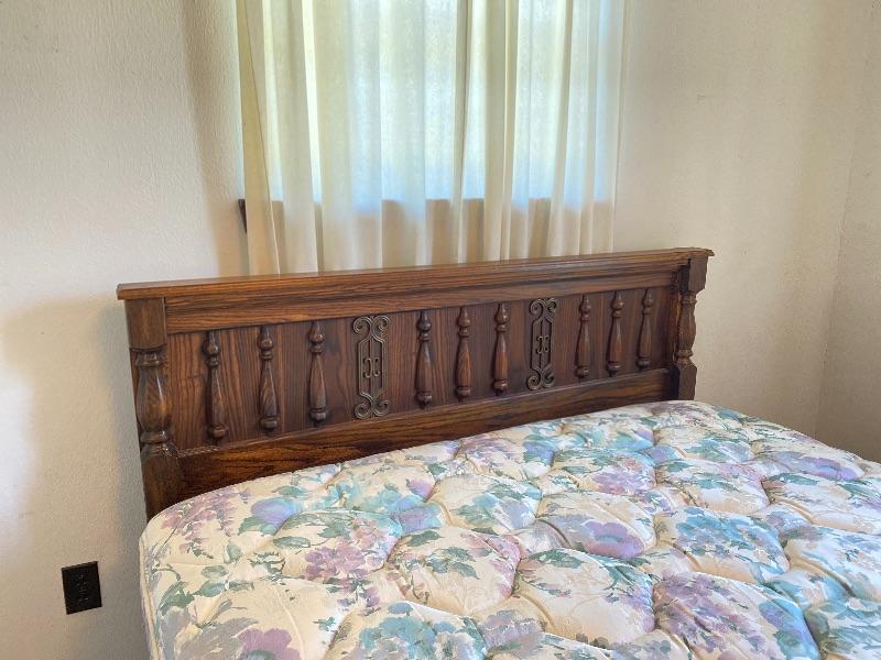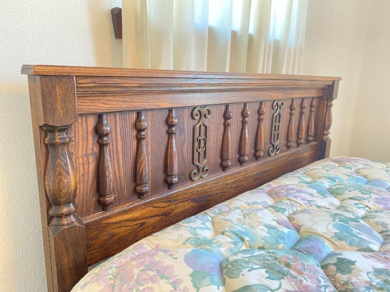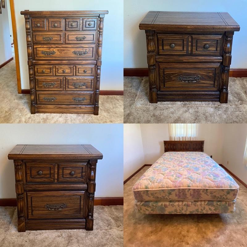 Dated but Solid-Headboard has Metal accents / Mattress is old, but has been covered, mattress has been disinfected - no soils or stains / Nightstands need drawer track TLC / Great Condition / See photos for dimensions
