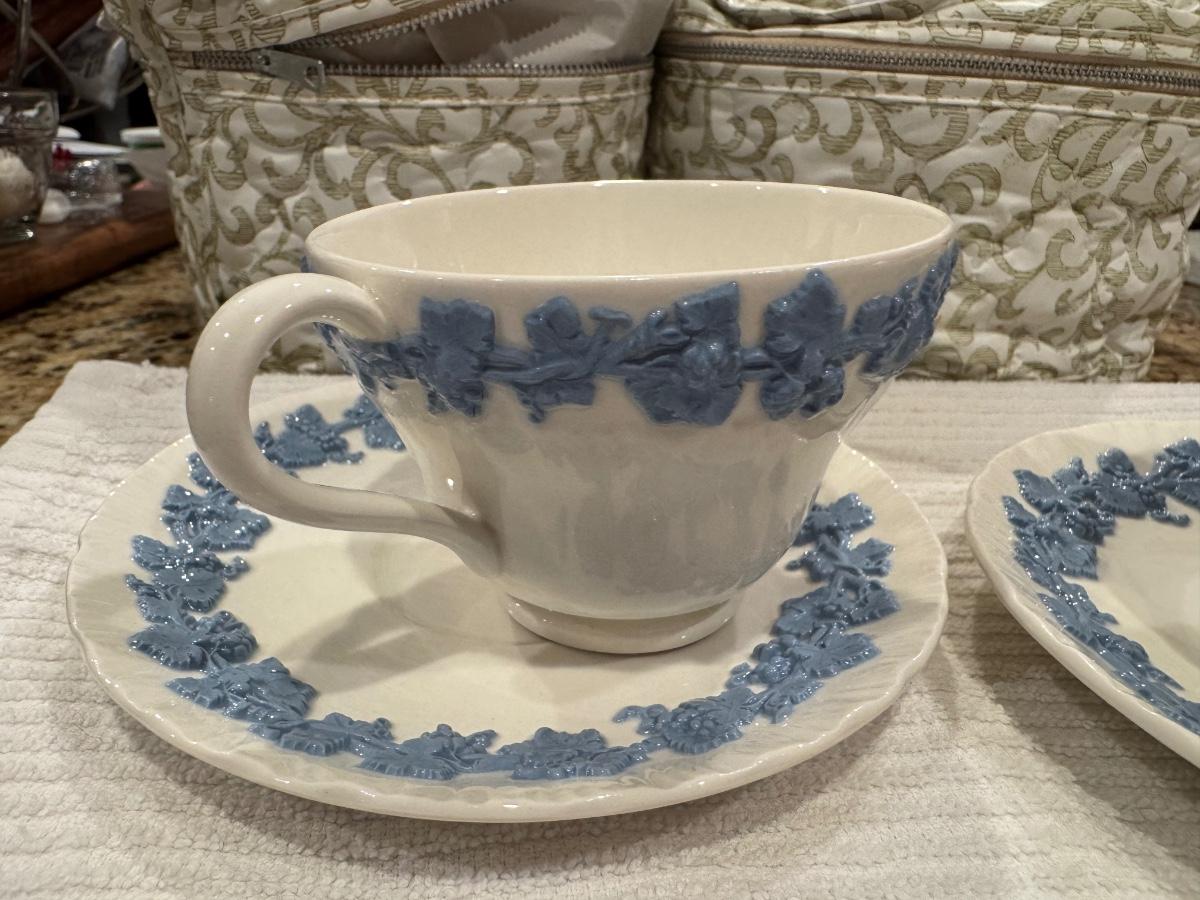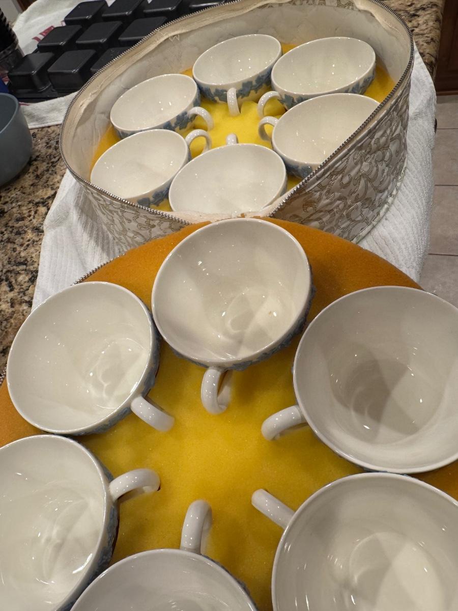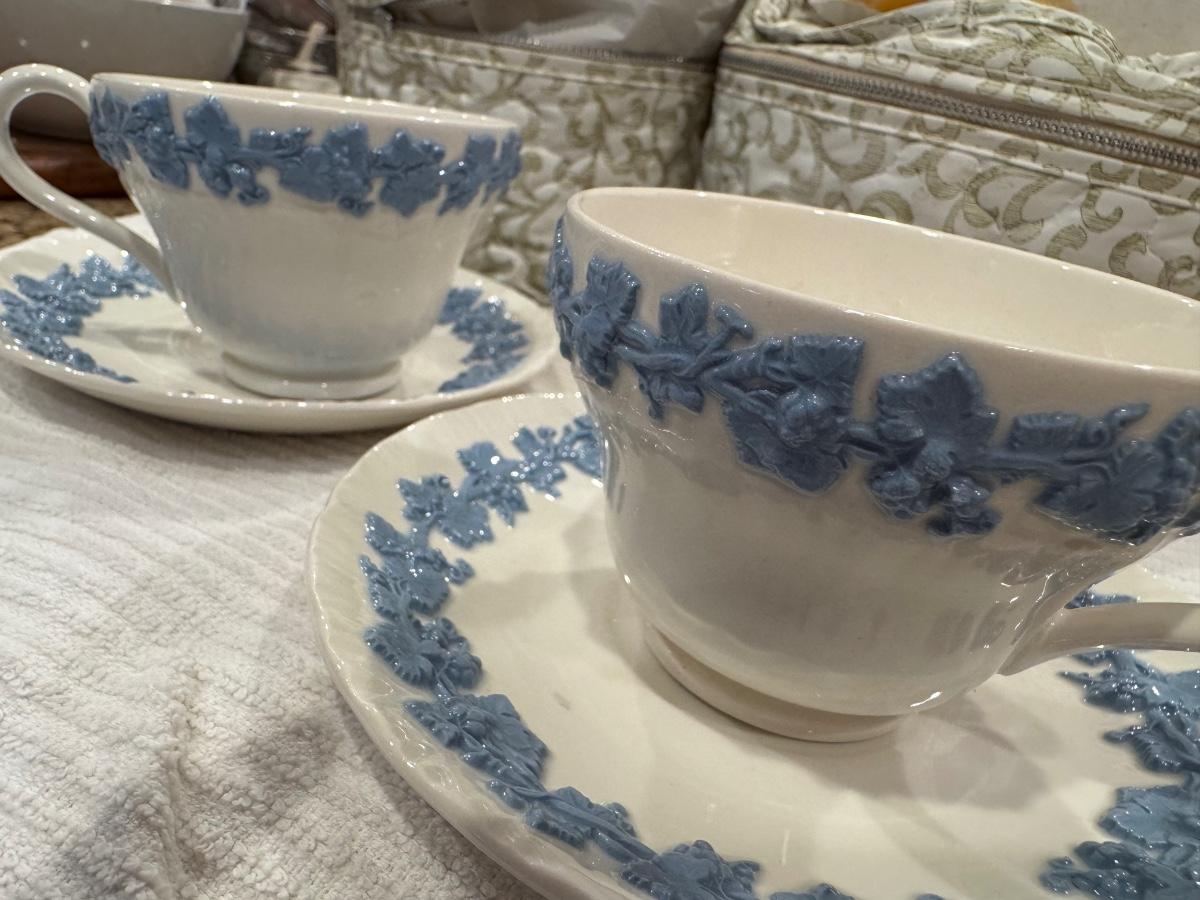 Queensware - Lavender on Cream. 12 piece teacup & saucers. Teacups in original 2-tiered packing case.