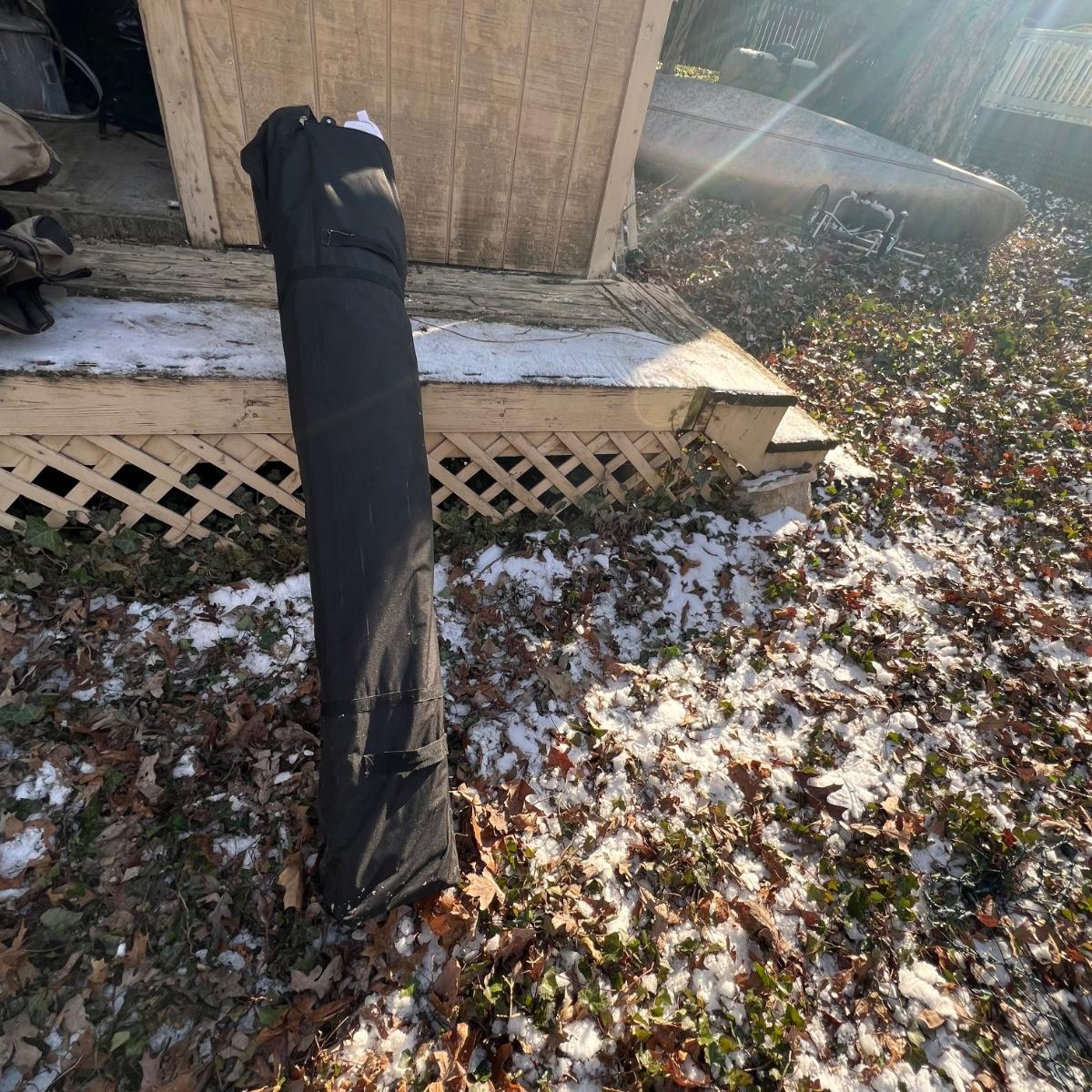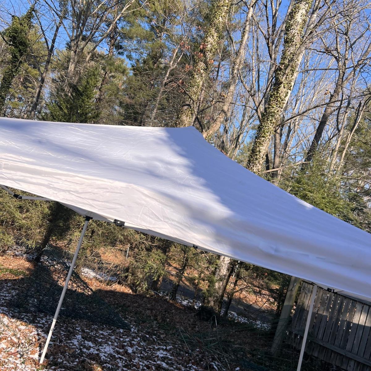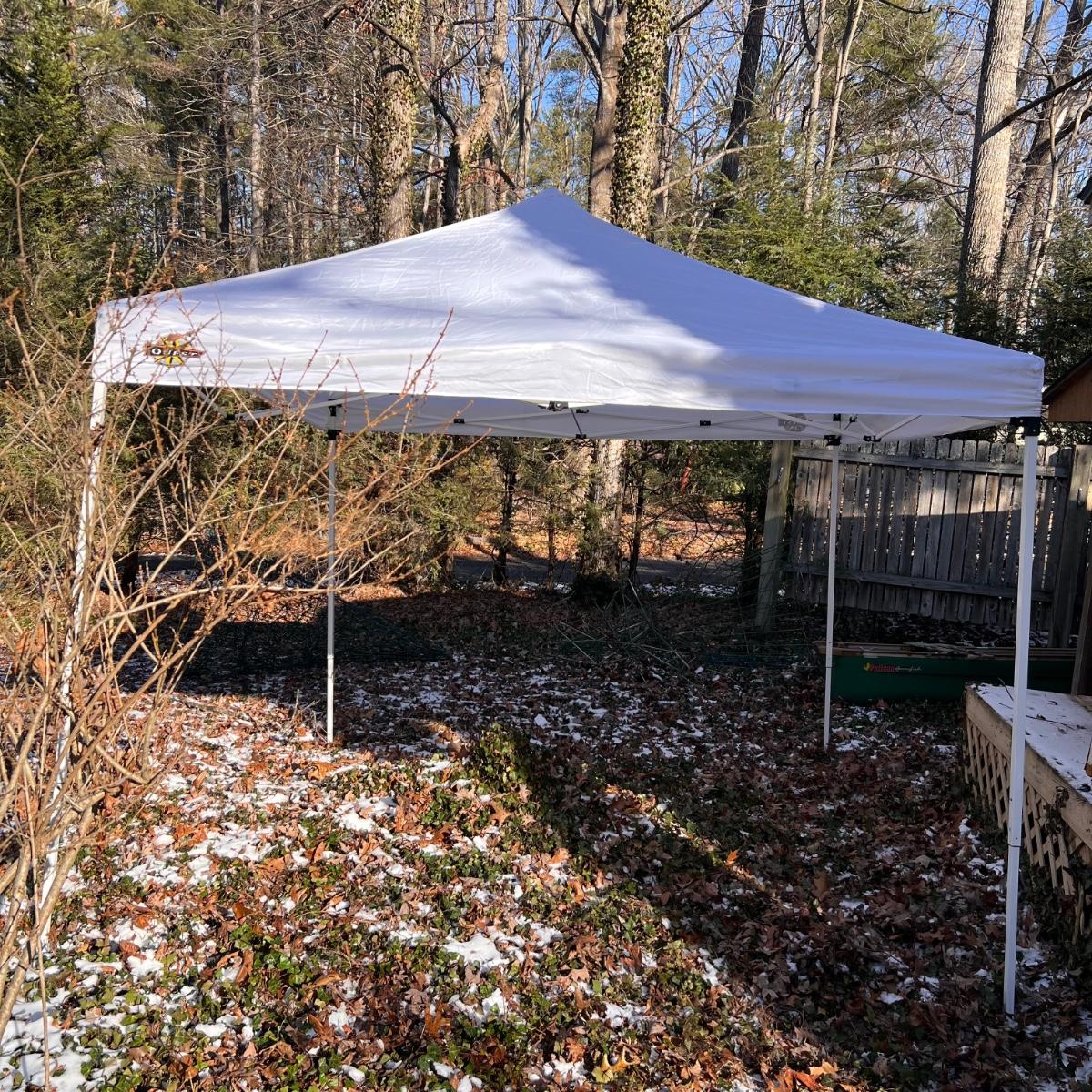 This Quest pop up tent has a white canvas top and measures 10ft x 10ft x 8ftH. It comes with rolling bag.