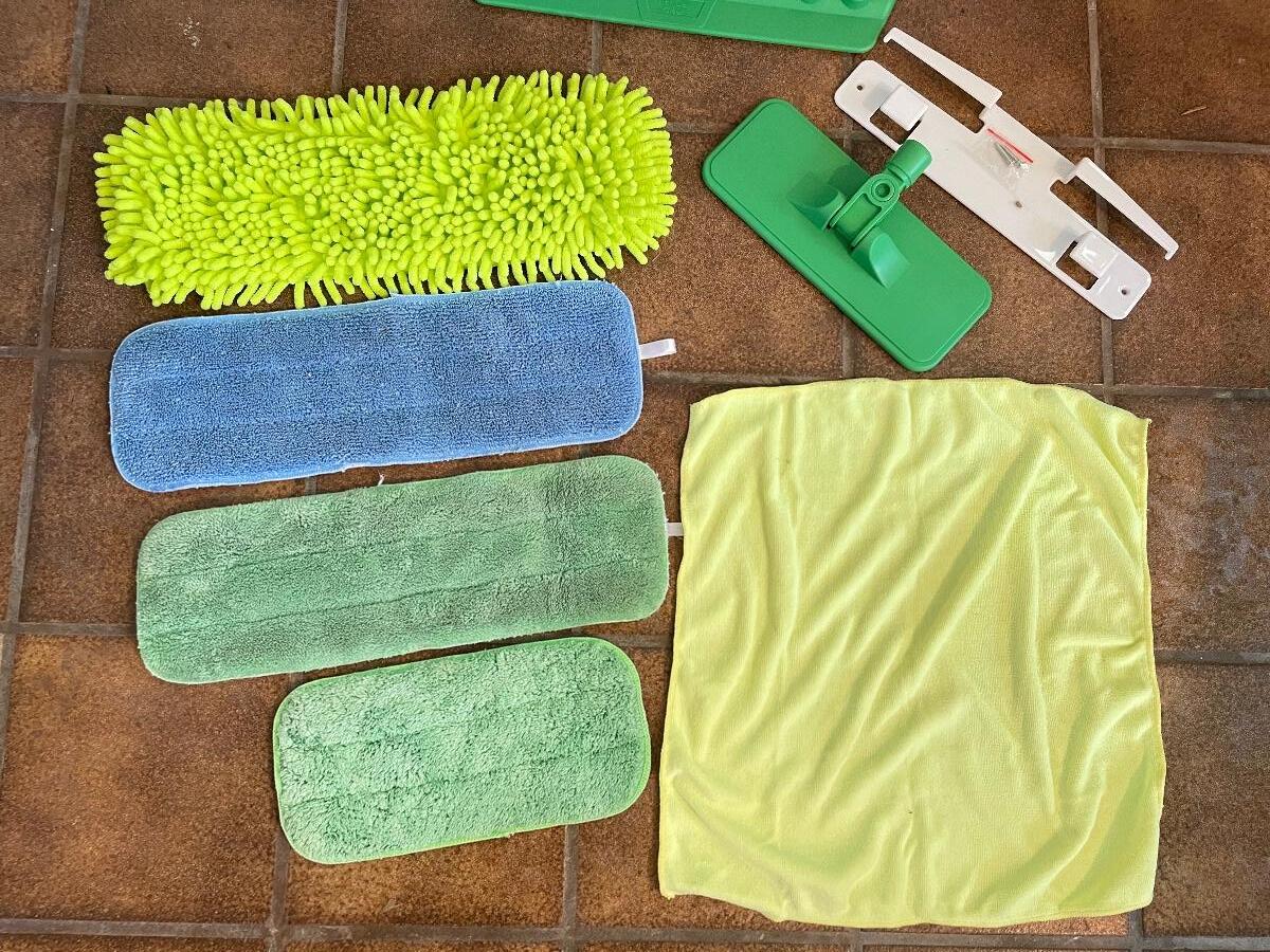 In good condition. Handle of mop can be adjusted in length, comes with two additional heads and cleaning pads.