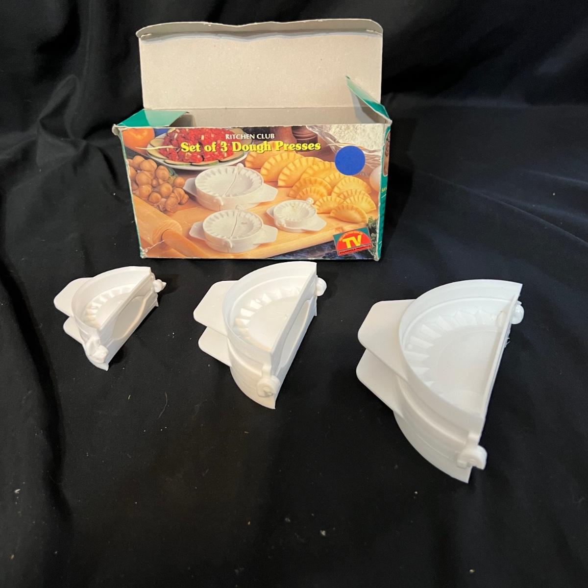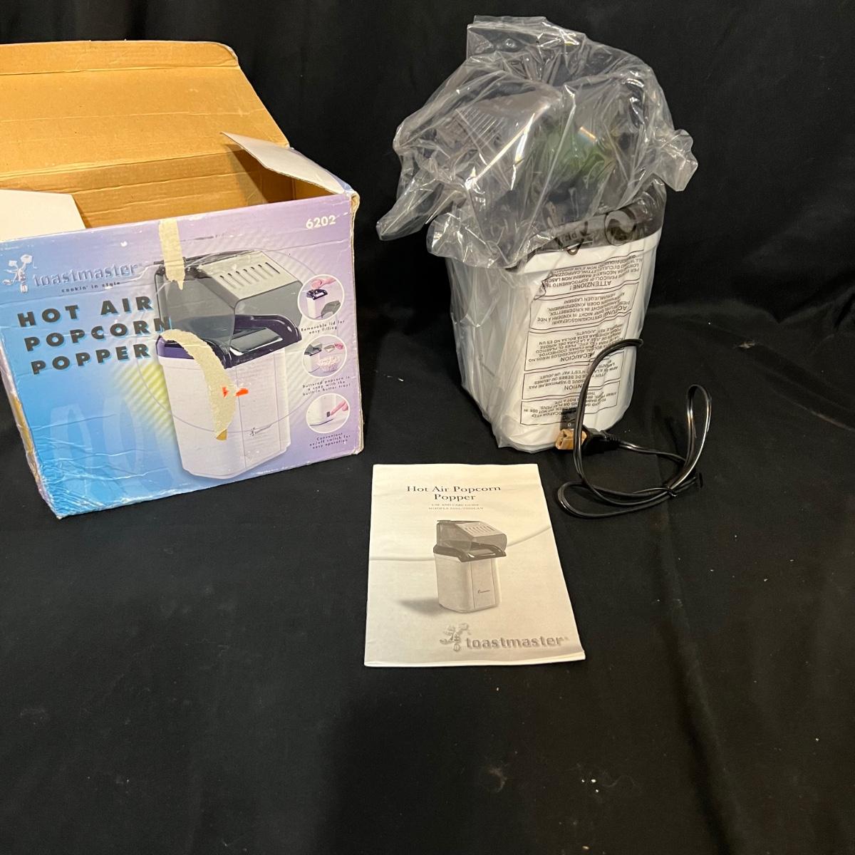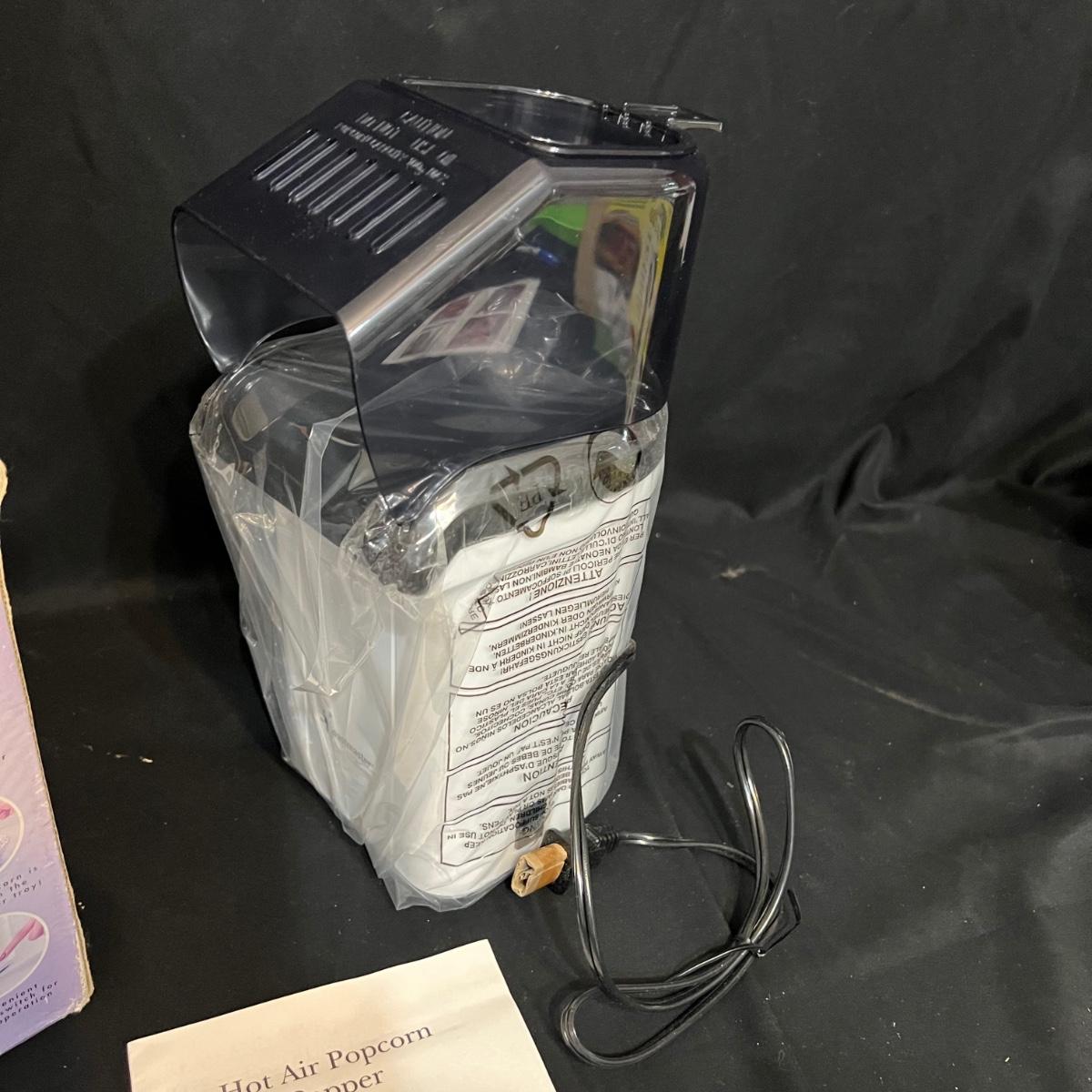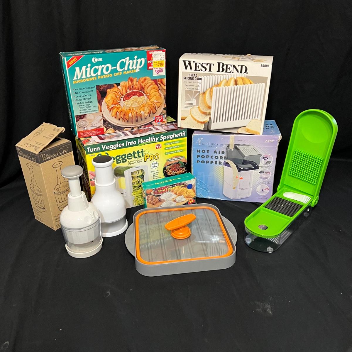 Nine different pieces of kitchen equipment designed to make life easy and fun while cooking. The new in box hot air popcorn popper and microchip microwave chip maker appear to have never been used. A Veggetti spiral cutter with three stainless steel blades included. Also a “Bacon Boss” for quick microwaved bacon and a push chopper dicing tool that includes one insertable blade. Two food choppers, one of them by Pampered Chef, and a West Bend bread slicing guide for uniform, sizing of homemade bread. The last item is a set of three dough presses perfect for dumplings, pierogi, ravioli, filled pies, or cookies. Popcorn maker powers on when plugged in.