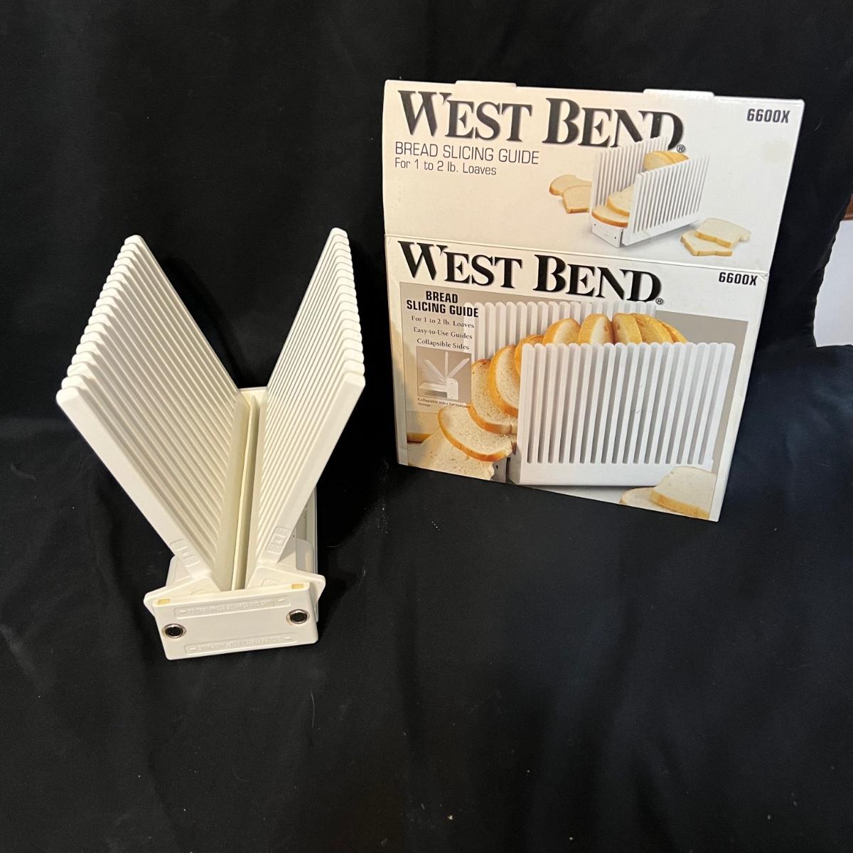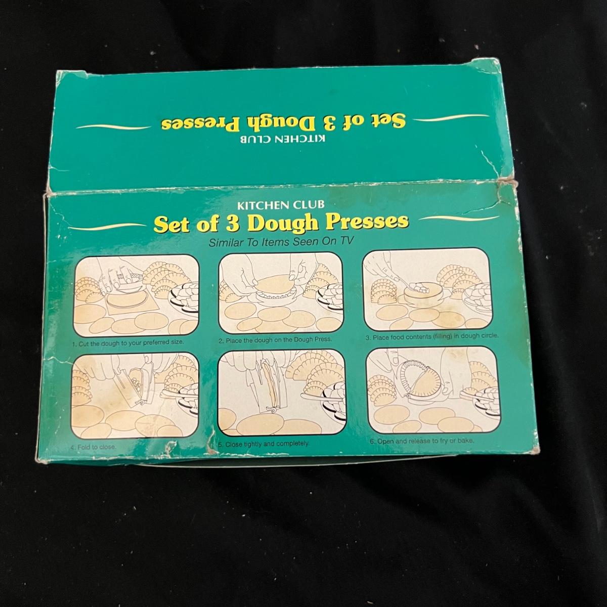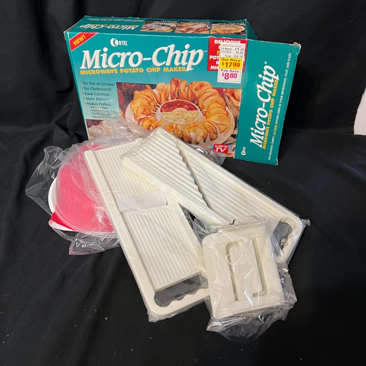 Nine different pieces of kitchen equipment designed to make life easy and fun while cooking. The new in box hot air popcorn popper and microchip microwave chip maker appear to have never been used. A Veggetti spiral cutter with three stainless steel blades included. Also a “Bacon Boss” for quick microwaved bacon and a push chopper dicing tool that includes one insertable blade. Two food choppers, one of them by Pampered Chef, and a West Bend bread slicing guide for uniform, sizing of homemade bread. The last item is a set of three dough presses perfect for dumplings, pierogi, ravioli, filled pies, or cookies. Popcorn maker powers on when plugged in.