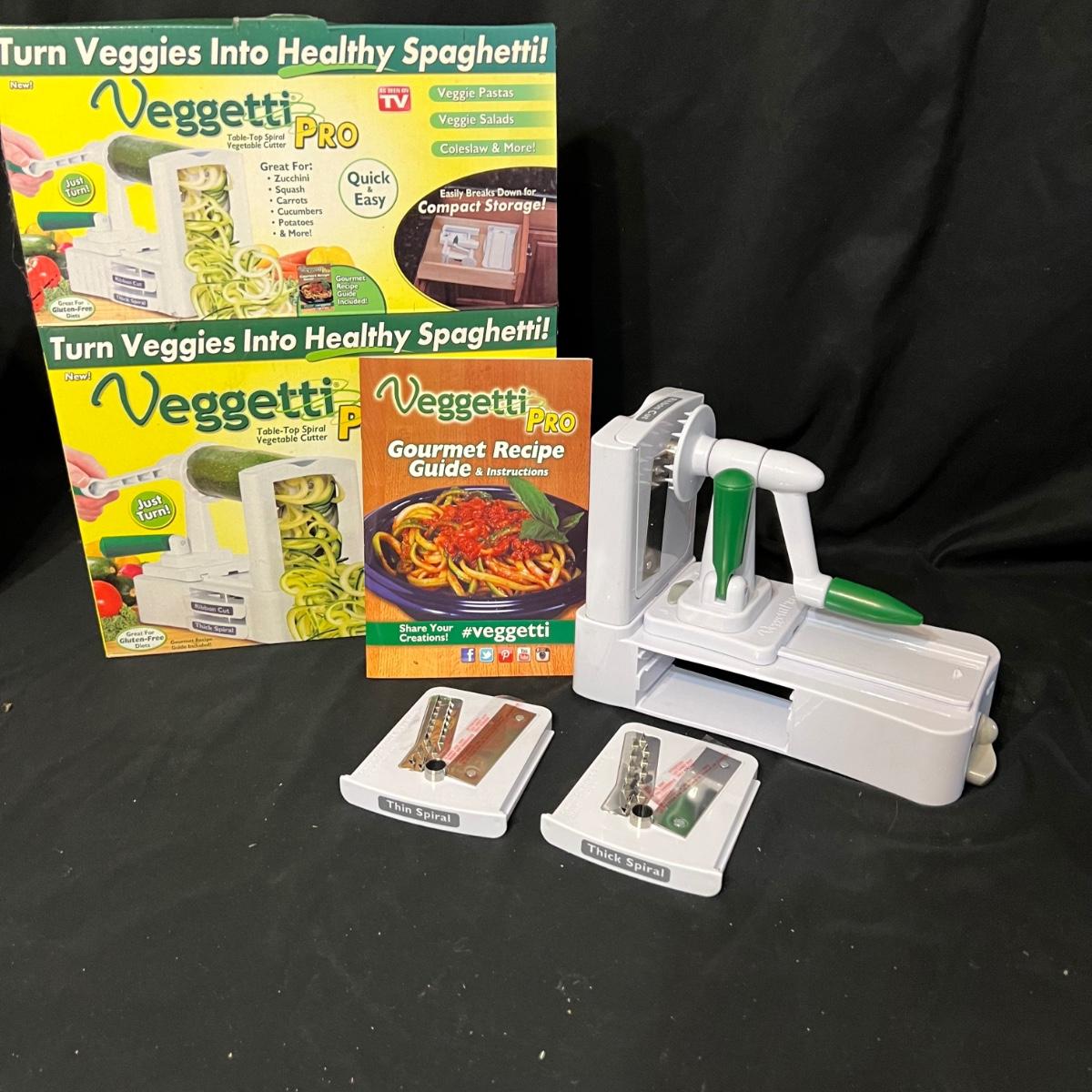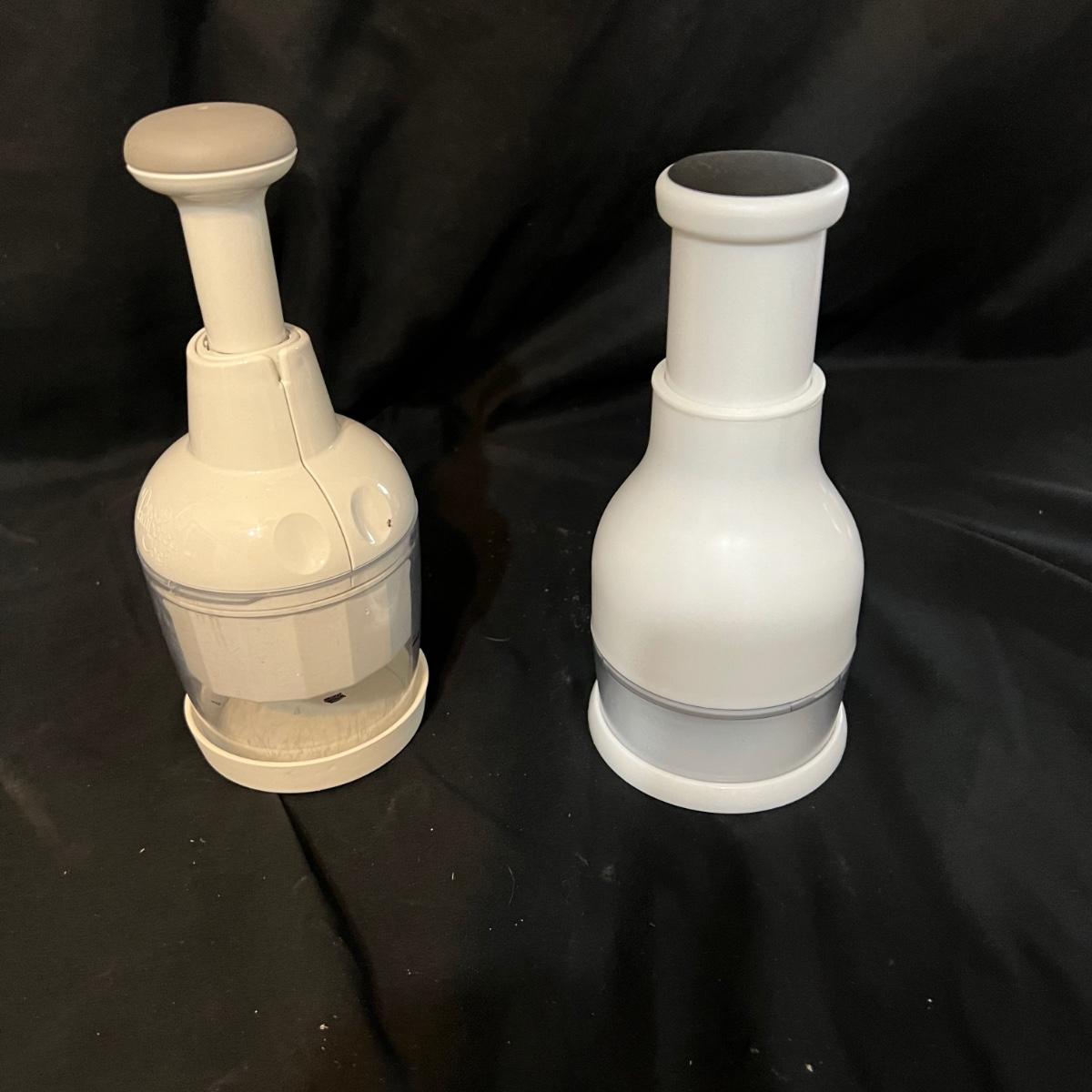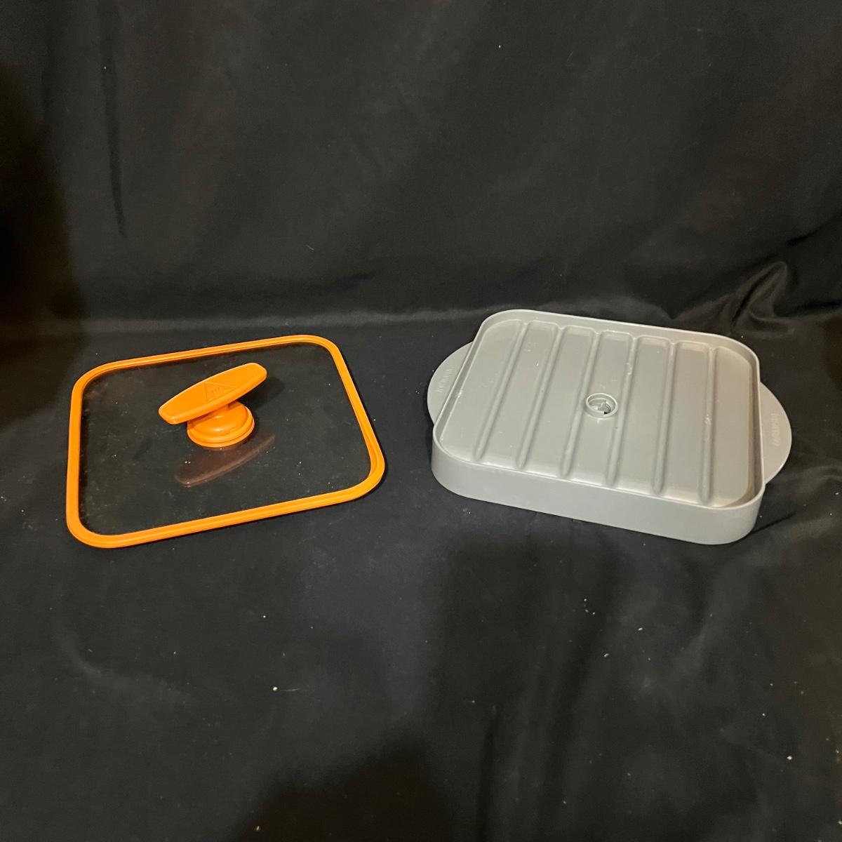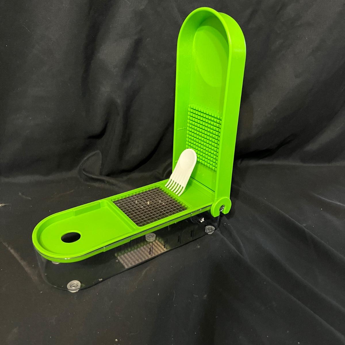 Nine different pieces of kitchen equipment designed to make life easy and fun while cooking. The new in box hot air popcorn popper and microchip microwave chip maker appear to have never been used. A Veggetti spiral cutter with three stainless steel blades included. Also a “Bacon Boss” for quick microwaved bacon and a push chopper dicing tool that includes one insertable blade. Two food choppers, one of them by Pampered Chef, and a West Bend bread slicing guide for uniform, sizing of homemade bread. The last item is a set of three dough presses perfect for dumplings, pierogi, ravioli, filled pies, or cookies. Popcorn maker powers on when plugged in.