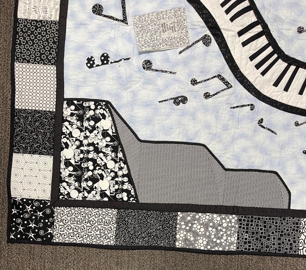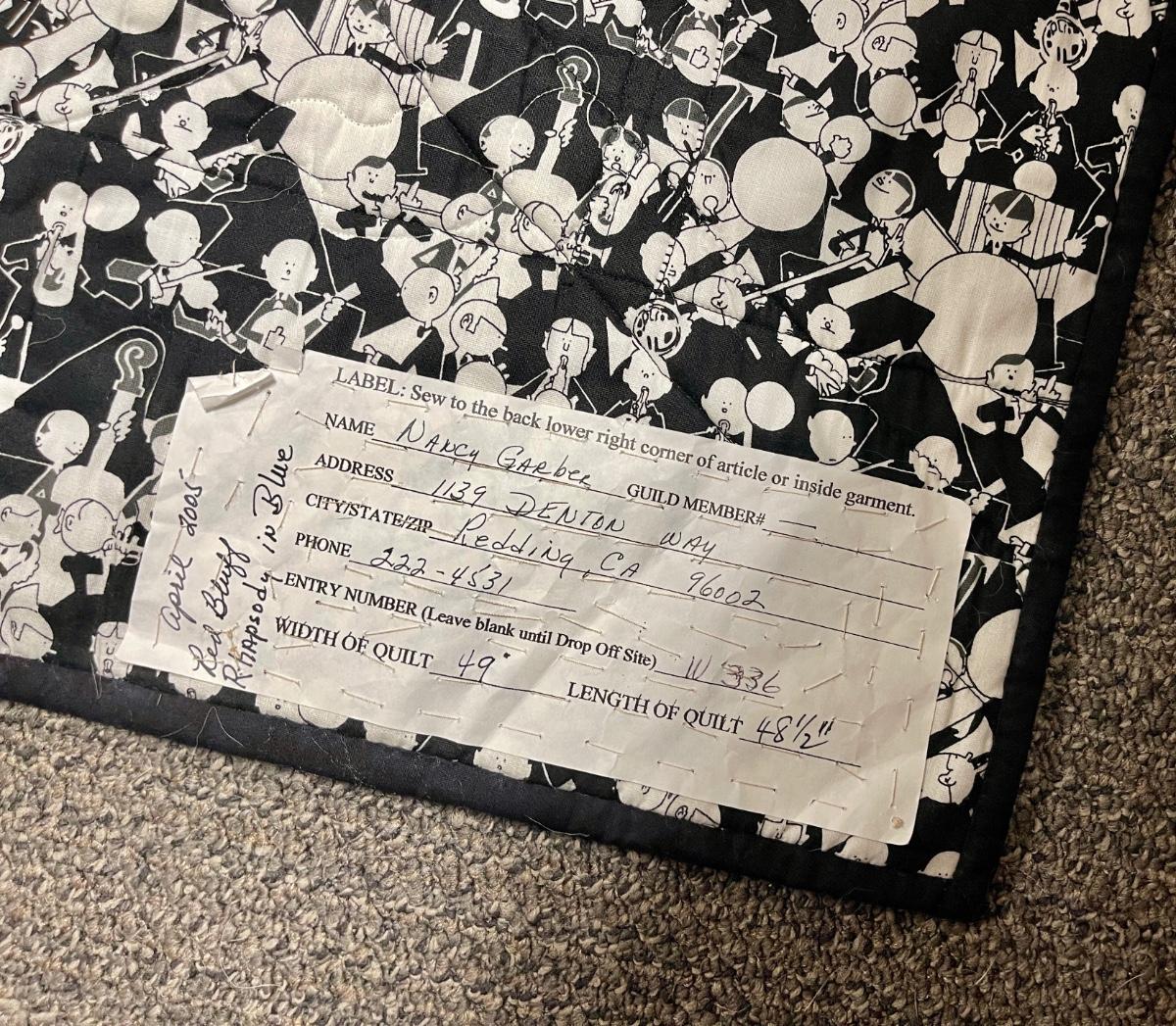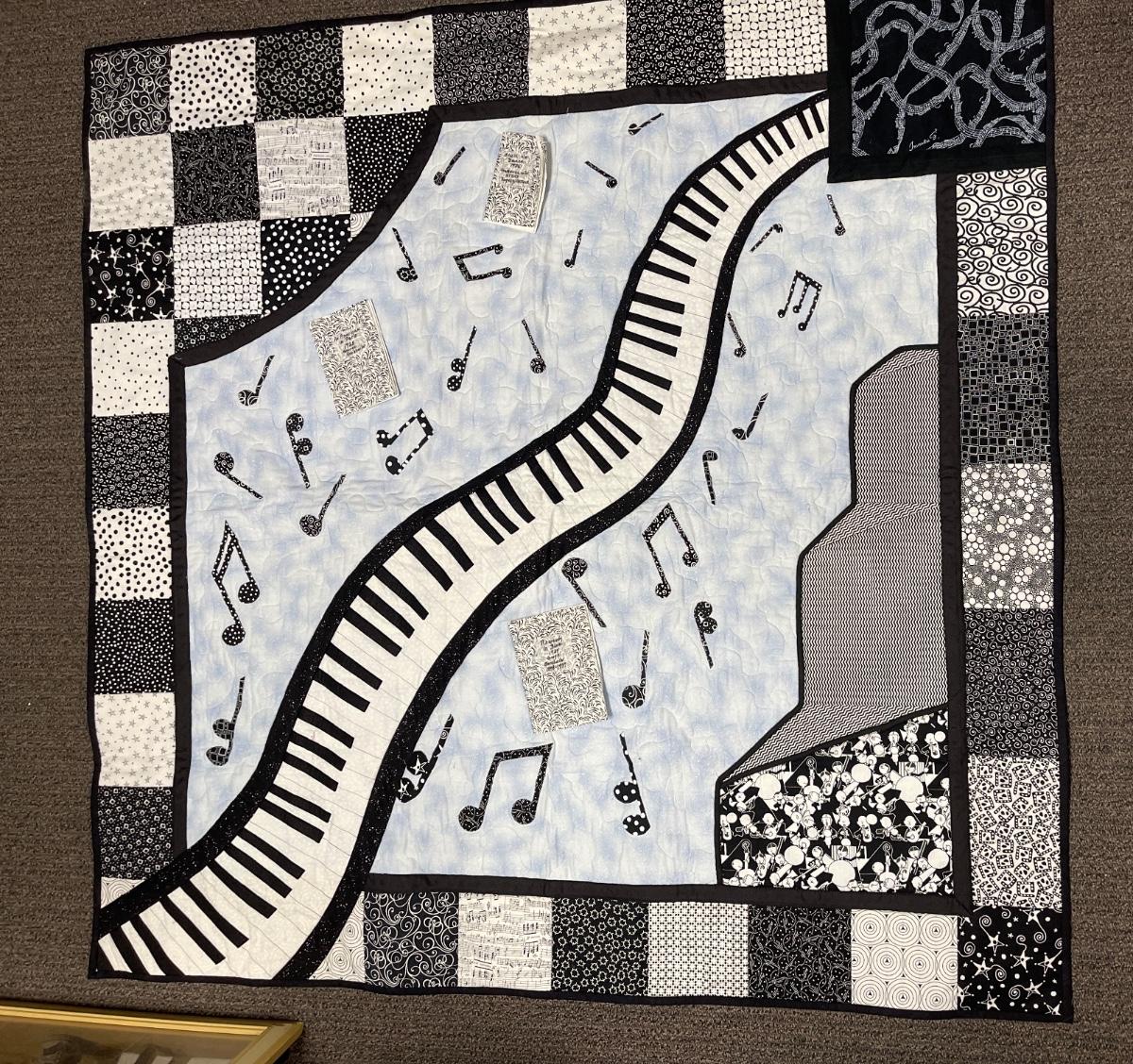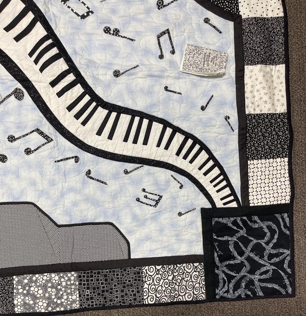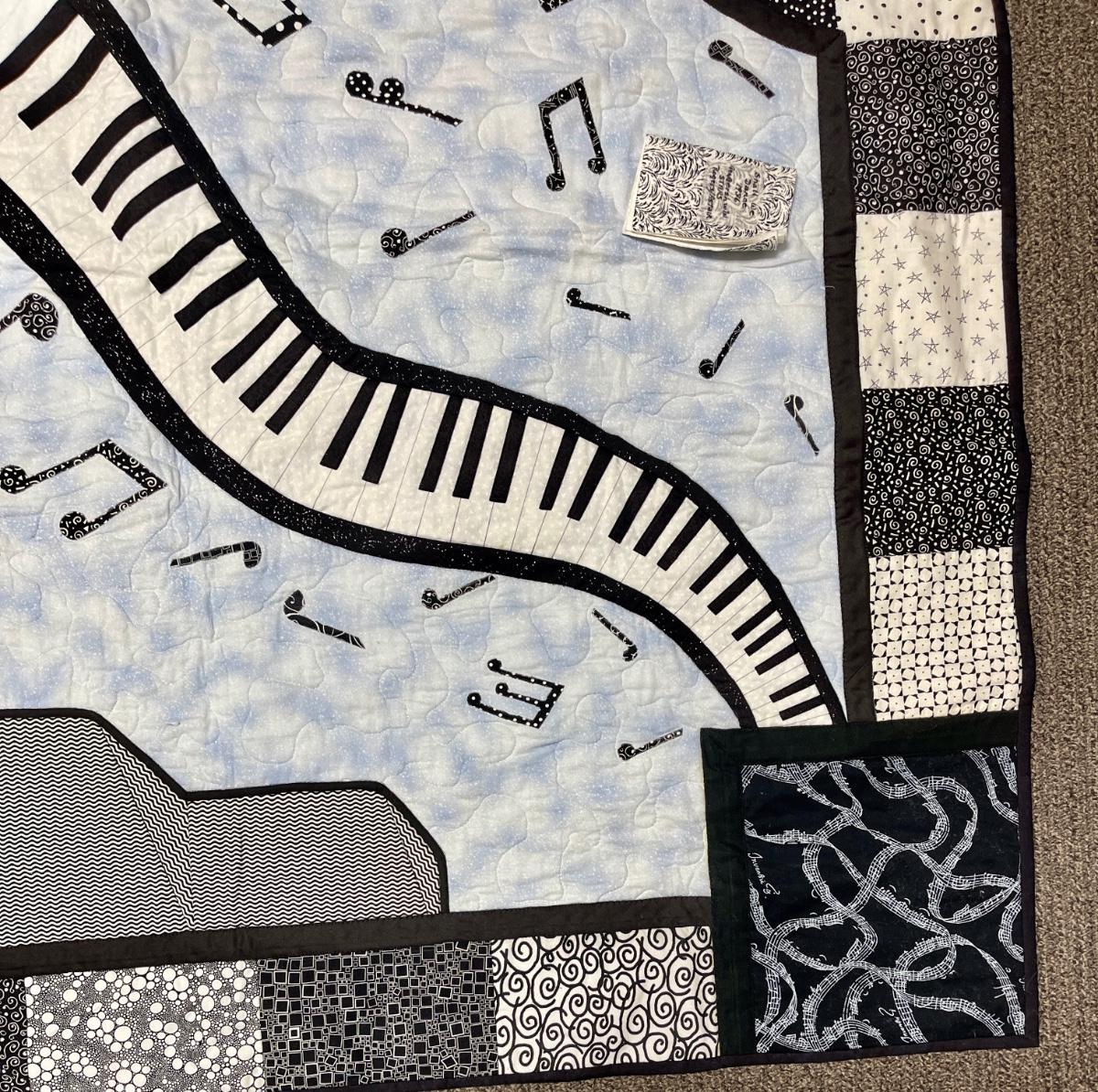 Award-winning quilt from Redding, California. Music-themed quilt measures approx. 48” x 49”. Great condition.