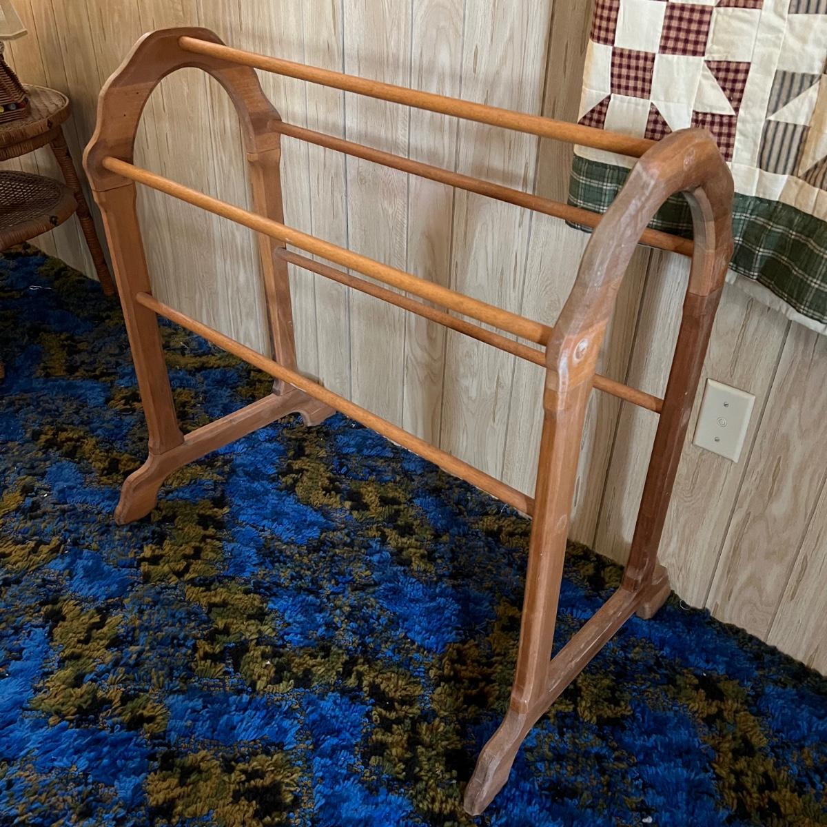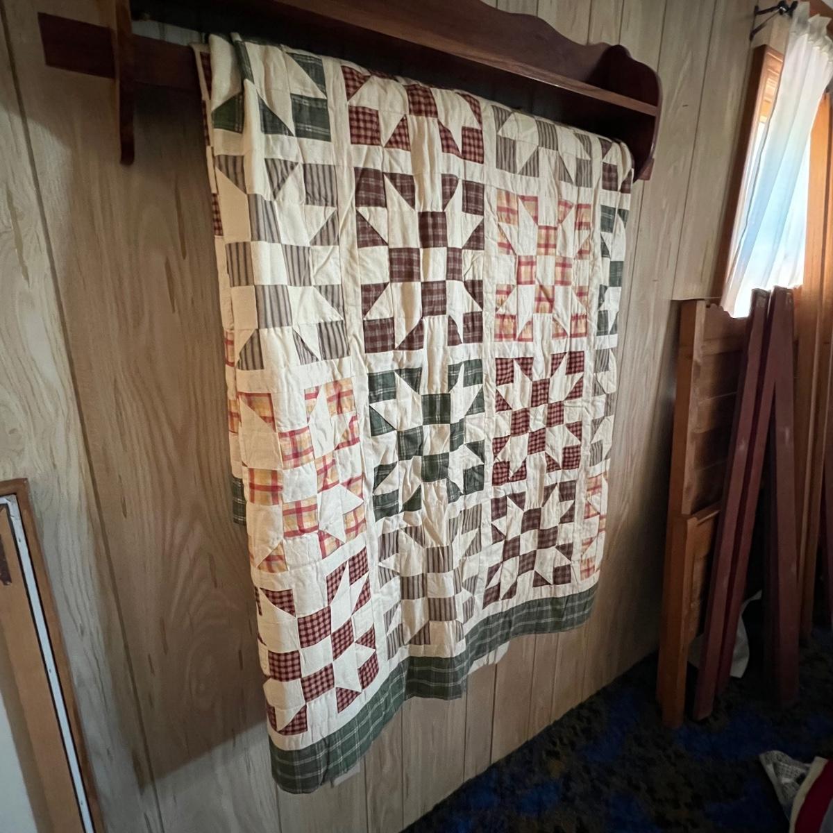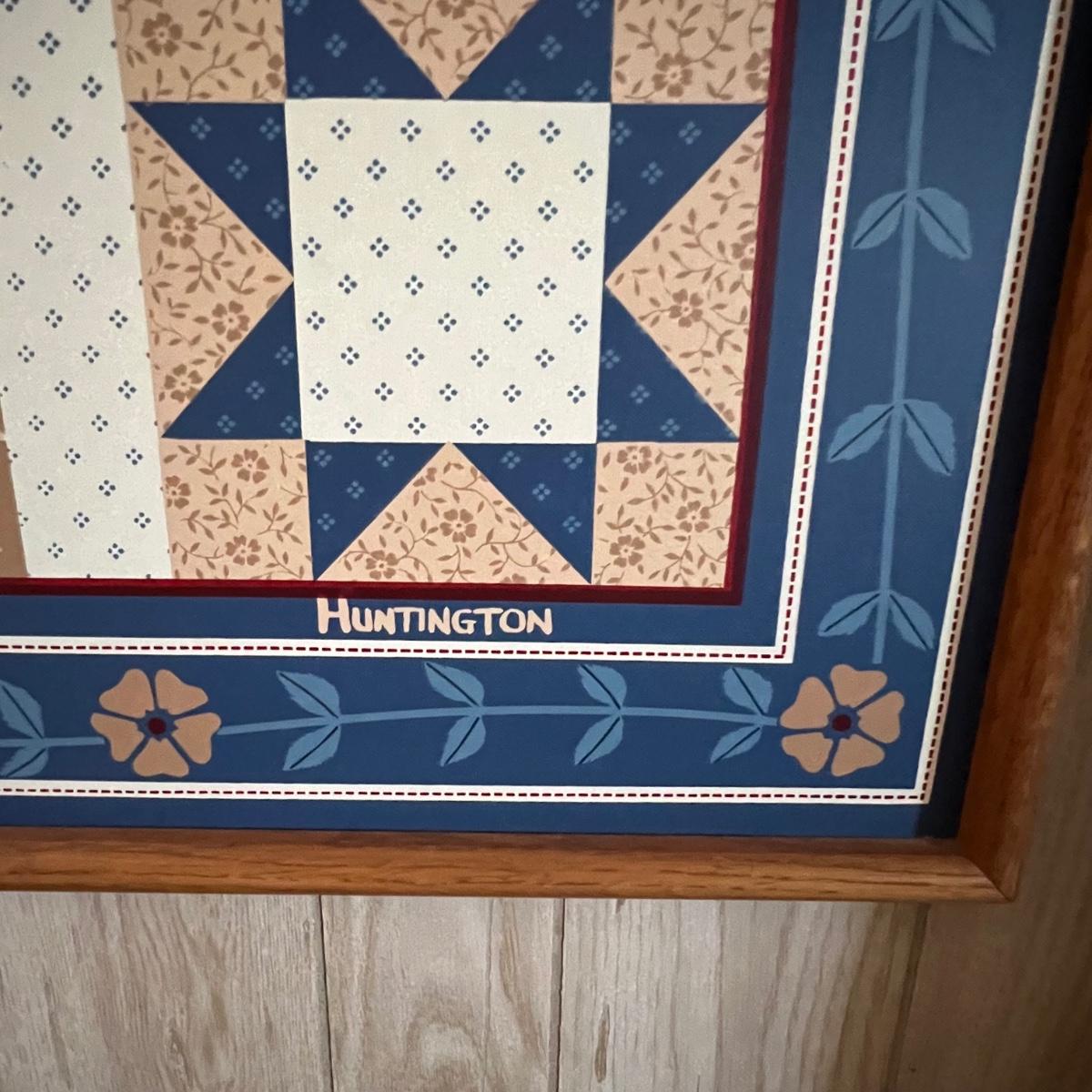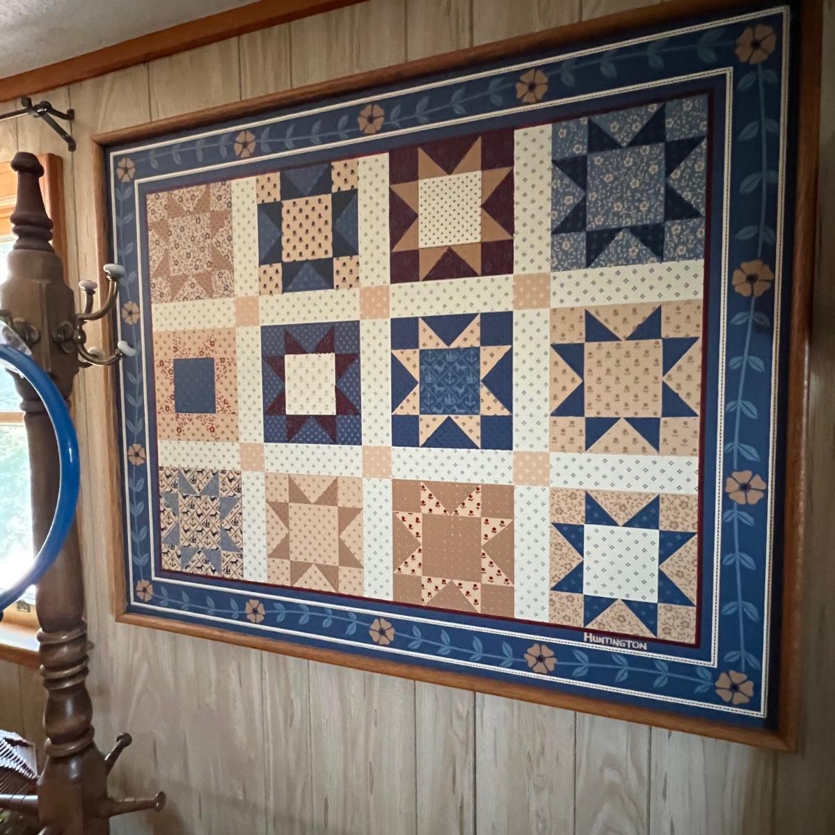 This quilt display lot includes a large (82” square) quilt with tabs for hanging that is green, red, blue and tan on a cream colored background. Lot also includes a lightweight wooden floor standing rack and a wooden hanging quilt rack. The hanging rack has been taken down. The framed art has the signature Huntington and it appears to be acrylic on canvas; its wood frame measures 37” x 45”. The quilt mounted in a hoop is a wall hanging.