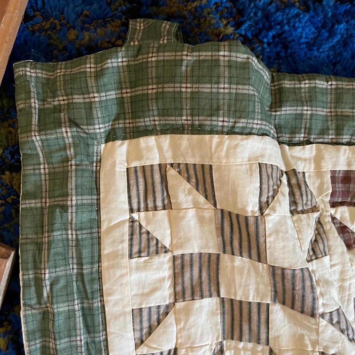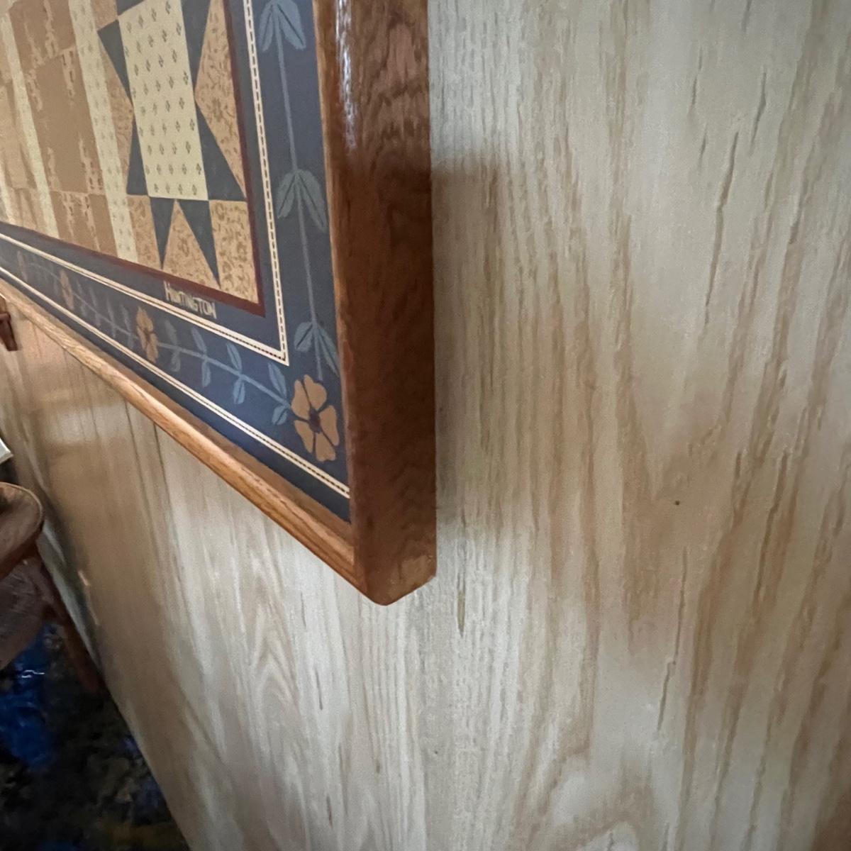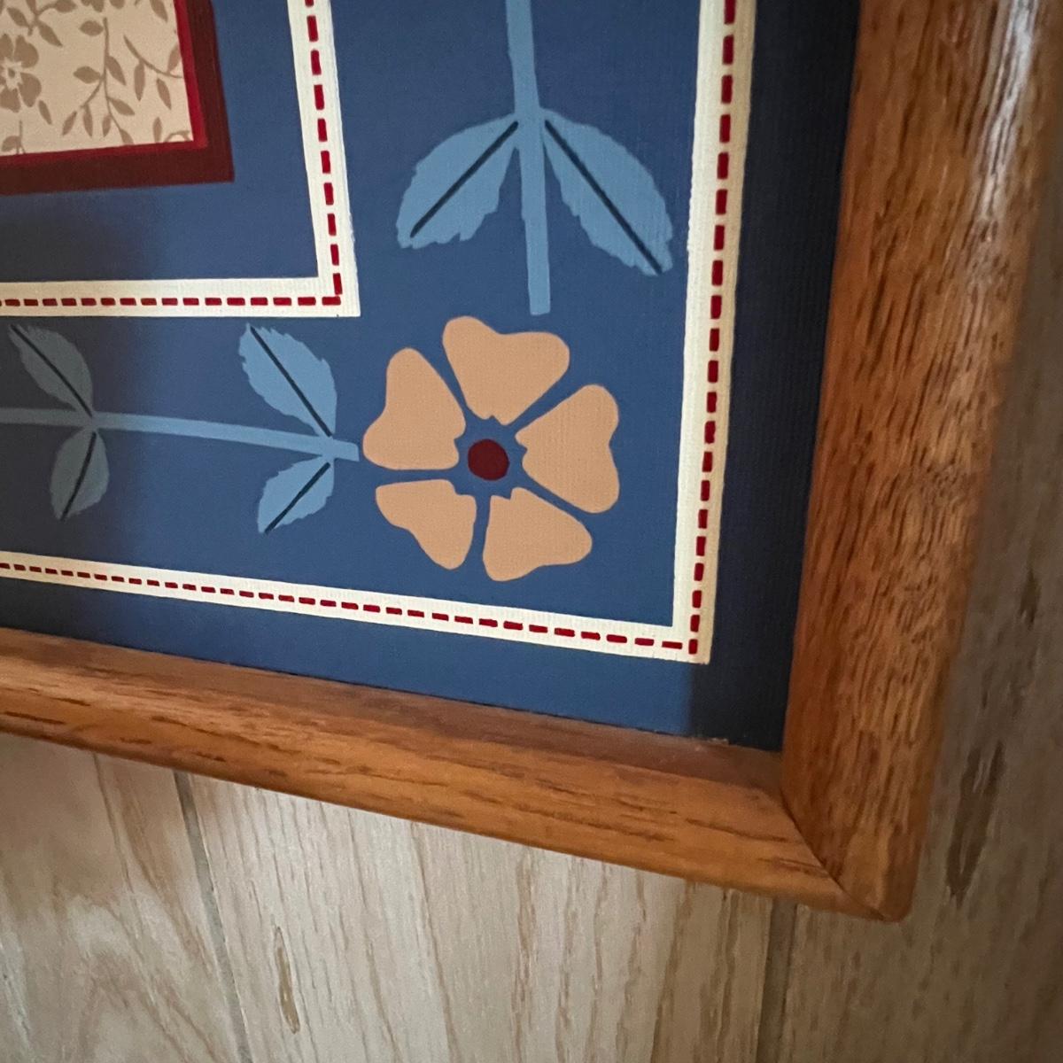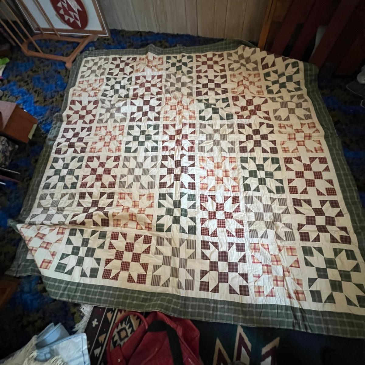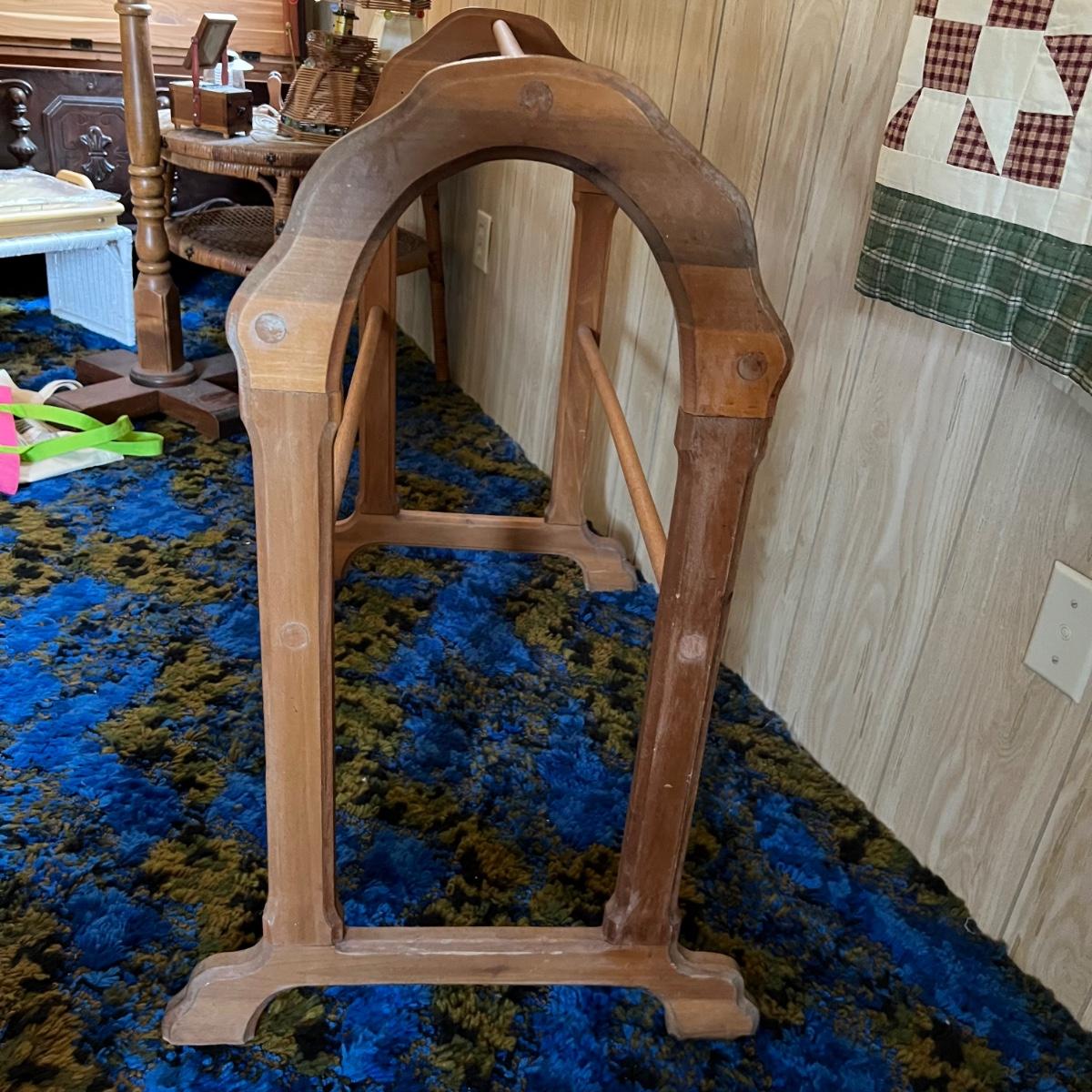 This quilt display lot includes a large (82” square) quilt with tabs for hanging that is green, red, blue and tan on a cream colored background. Lot also includes a lightweight wooden floor standing rack and a wooden hanging quilt rack. The hanging rack has been taken down. The framed art has the signature Huntington and it appears to be acrylic on canvas; its wood frame measures 37” x 45”. The quilt mounted in a hoop is a wall hanging.