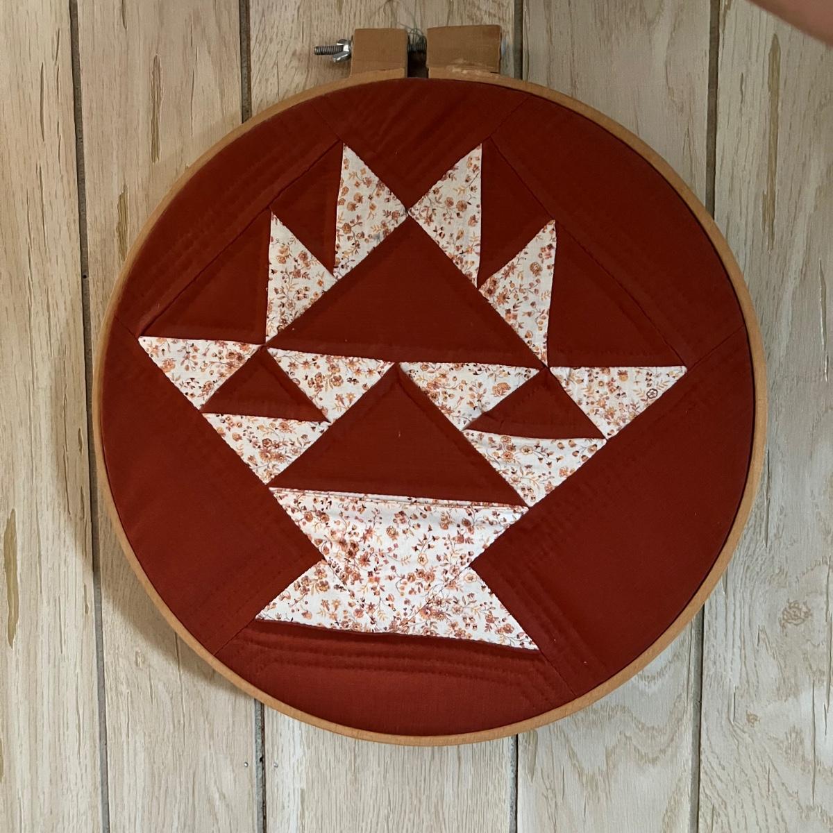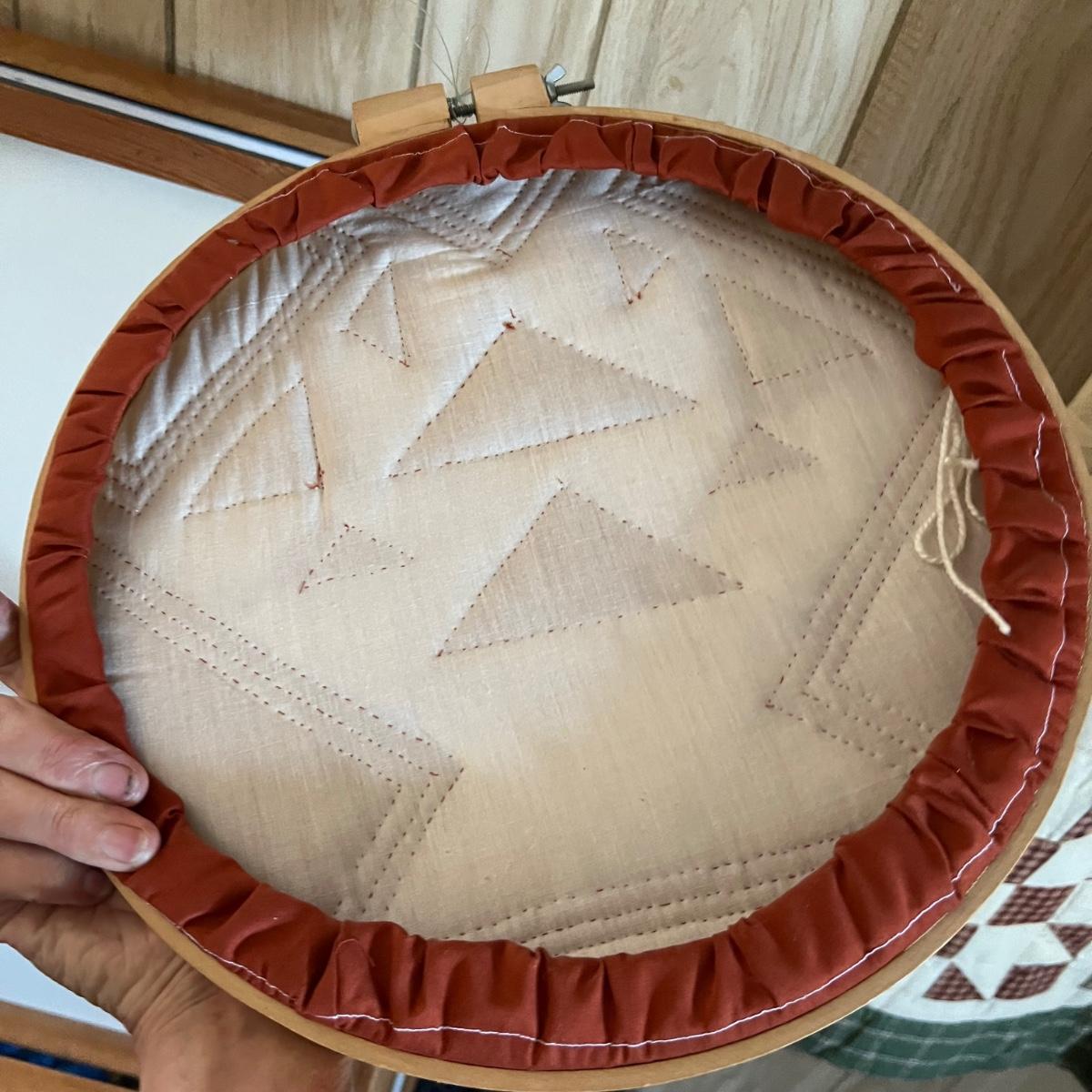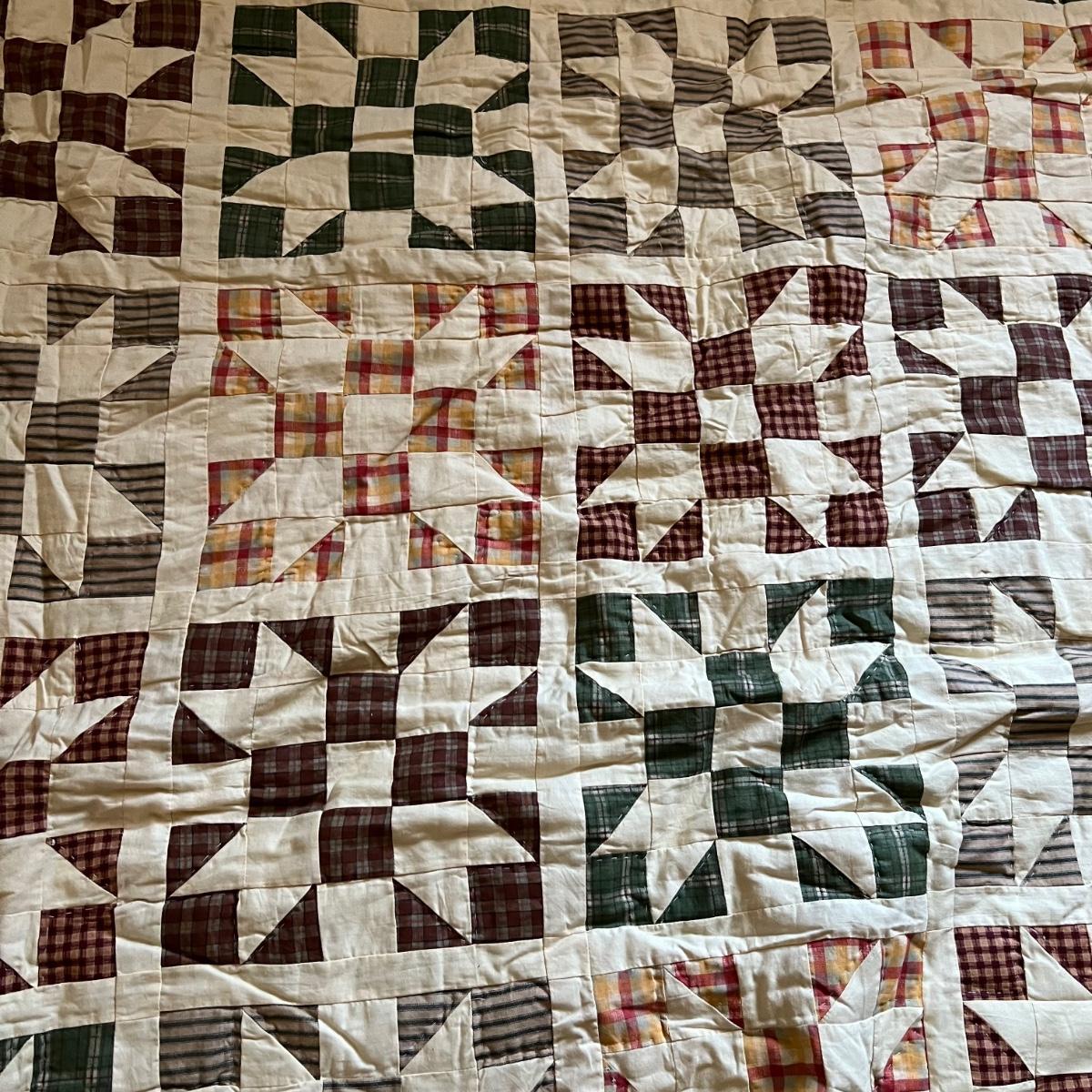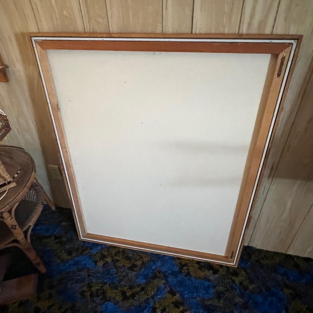 This quilt display lot includes a large (82” square) quilt with tabs for hanging that is green, red, blue and tan on a cream colored background. Lot also includes a lightweight wooden floor standing rack and a wooden hanging quilt rack. The hanging rack has been taken down. The framed art has the signature Huntington and it appears to be acrylic on canvas; its wood frame measures 37” x 45”. The quilt mounted in a hoop is a wall hanging.