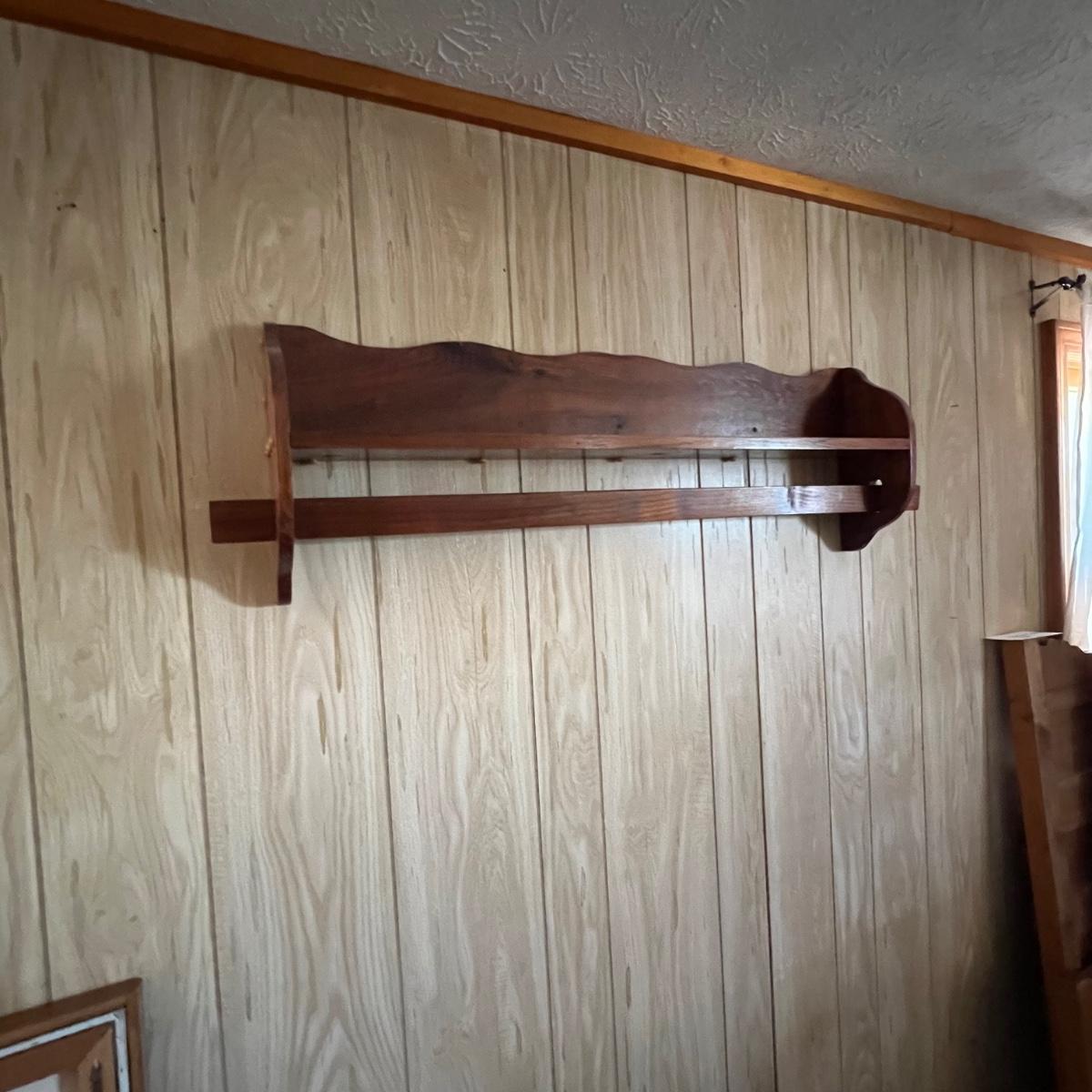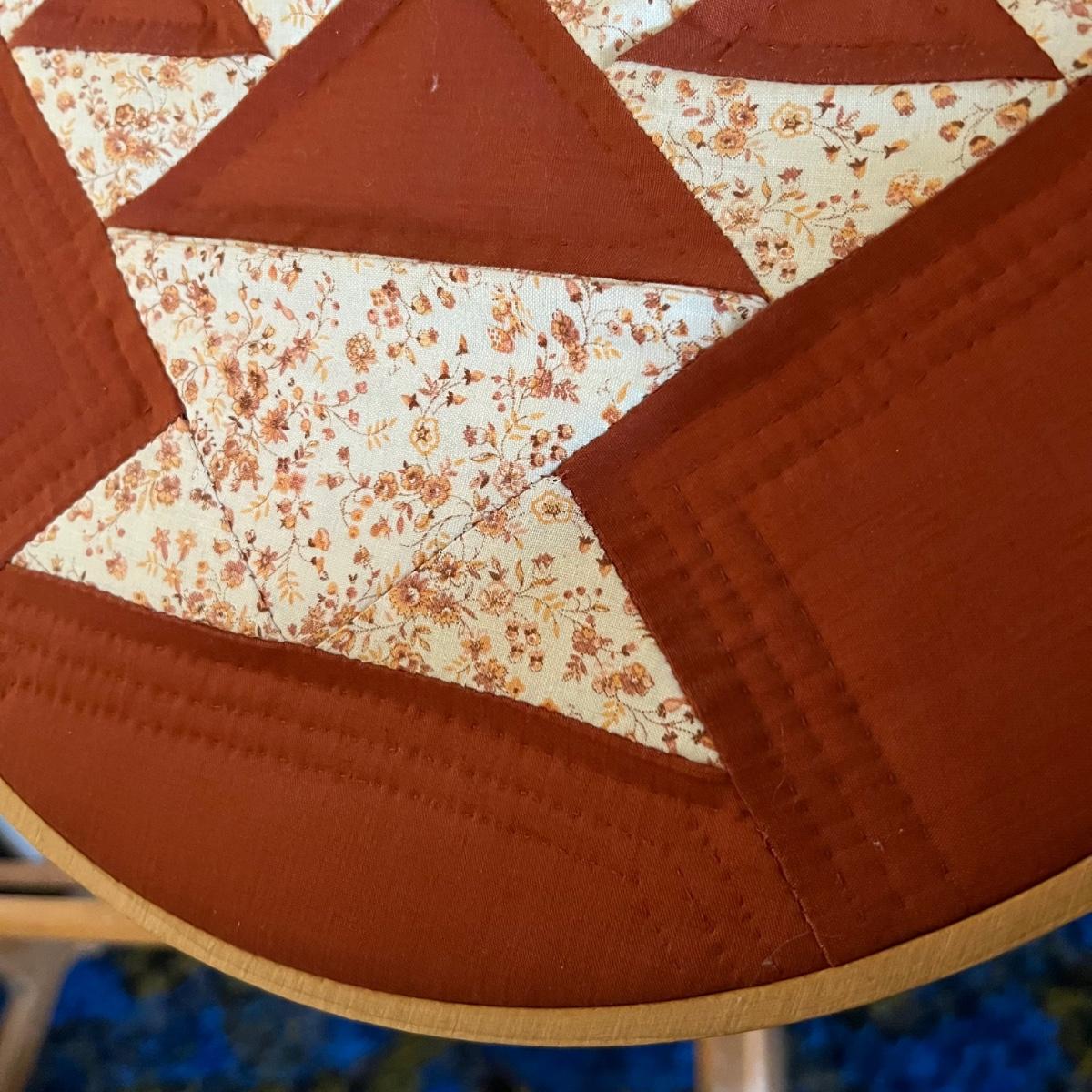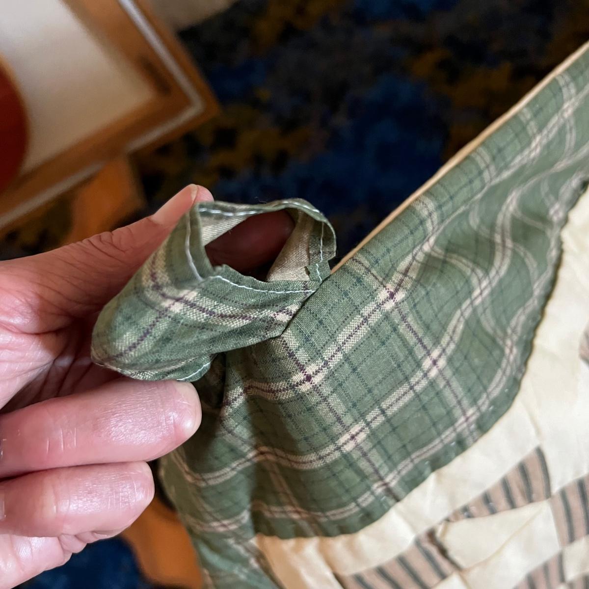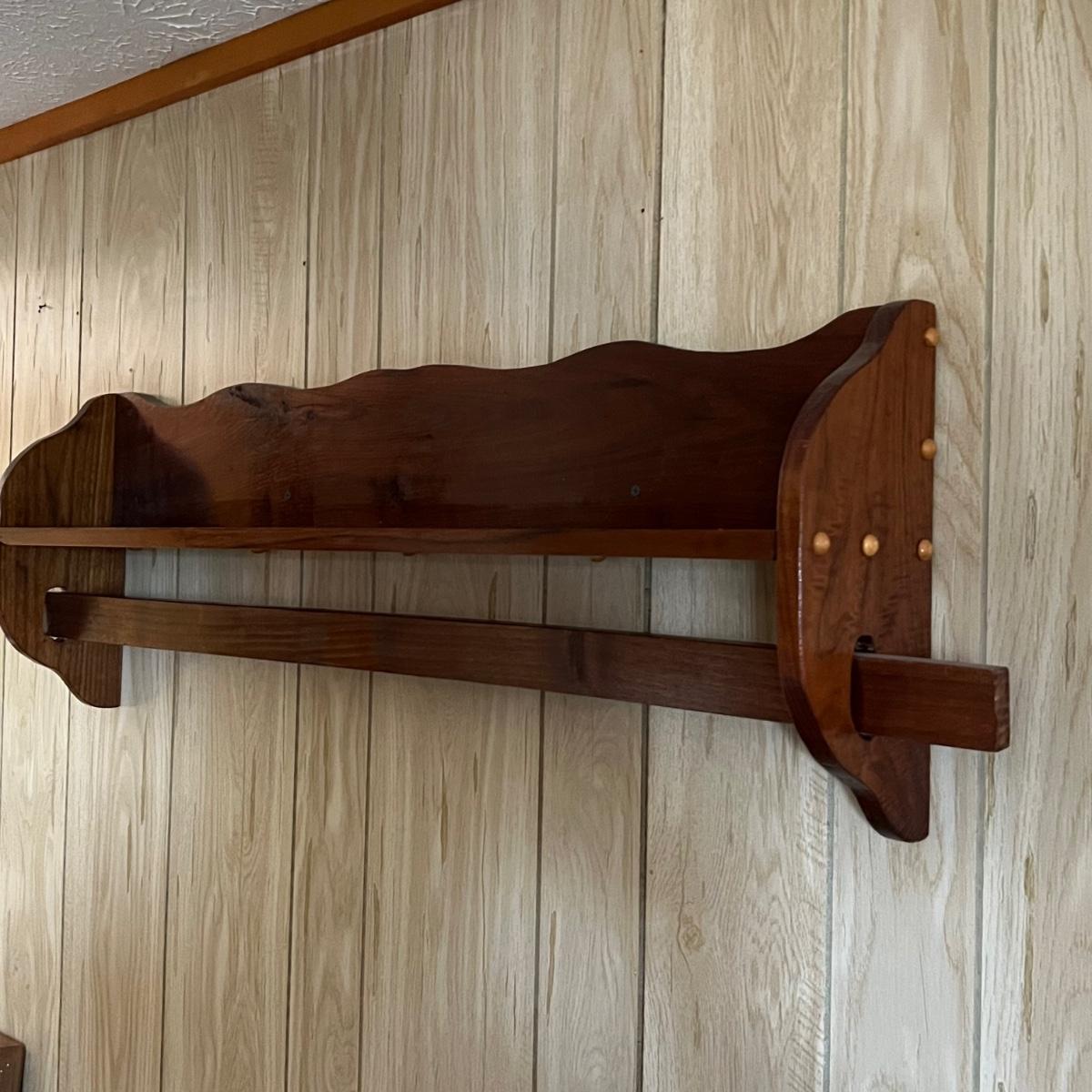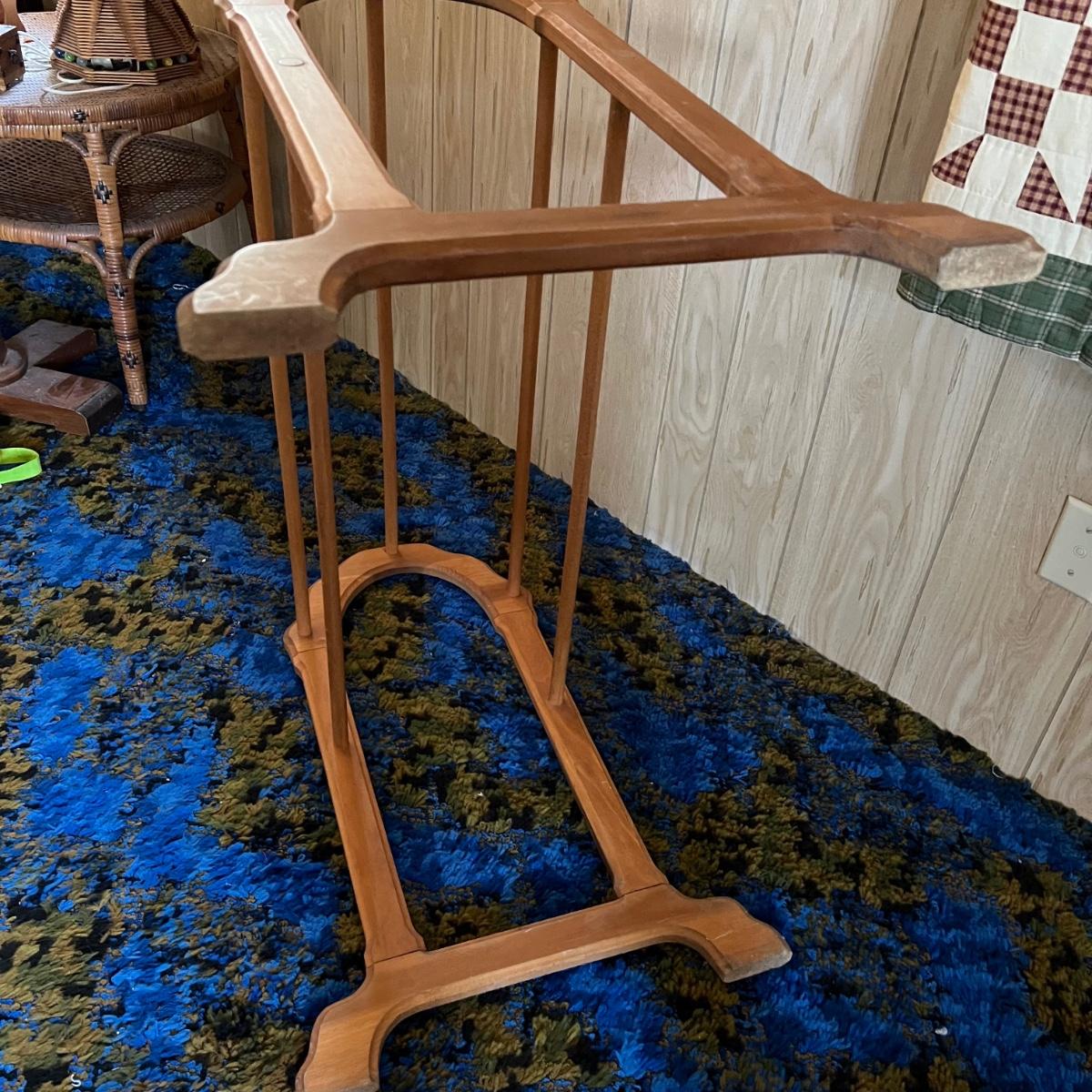 This quilt display lot includes a large (82” square) quilt with tabs for hanging that is green, red, blue and tan on a cream colored background. Lot also includes a lightweight wooden floor standing rack and a wooden hanging quilt rack. The hanging rack has been taken down. The framed art has the signature Huntington and it appears to be acrylic on canvas; its wood frame measures 37” x 45”. The quilt mounted in a hoop is a wall hanging.