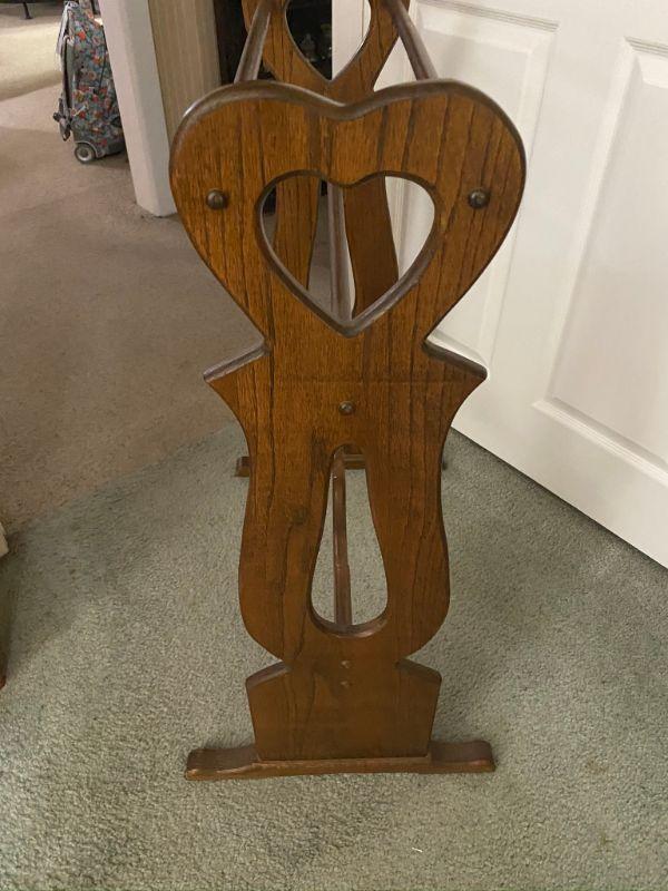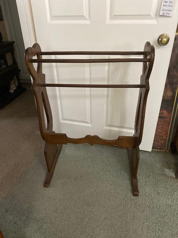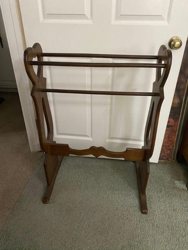 Dark wood quilt rack. Three poles for holding blankets. Measures 25"w x 36"h x 17.5"d.