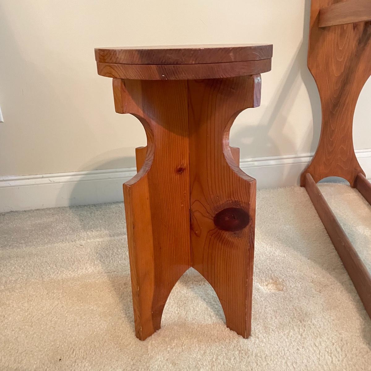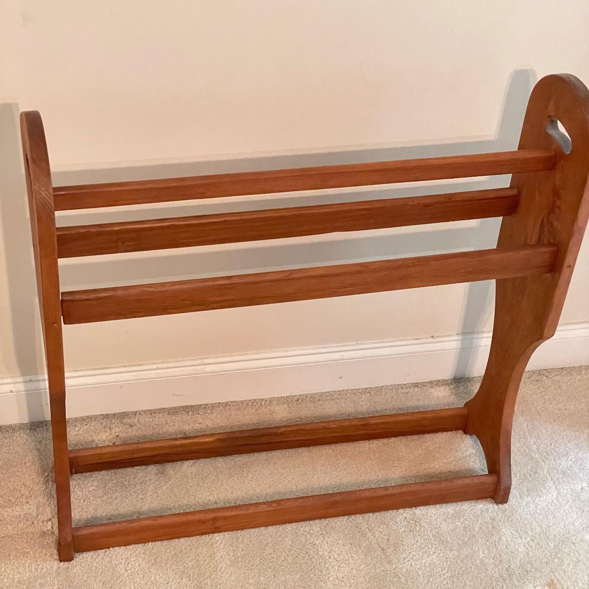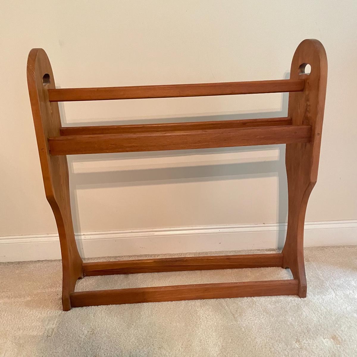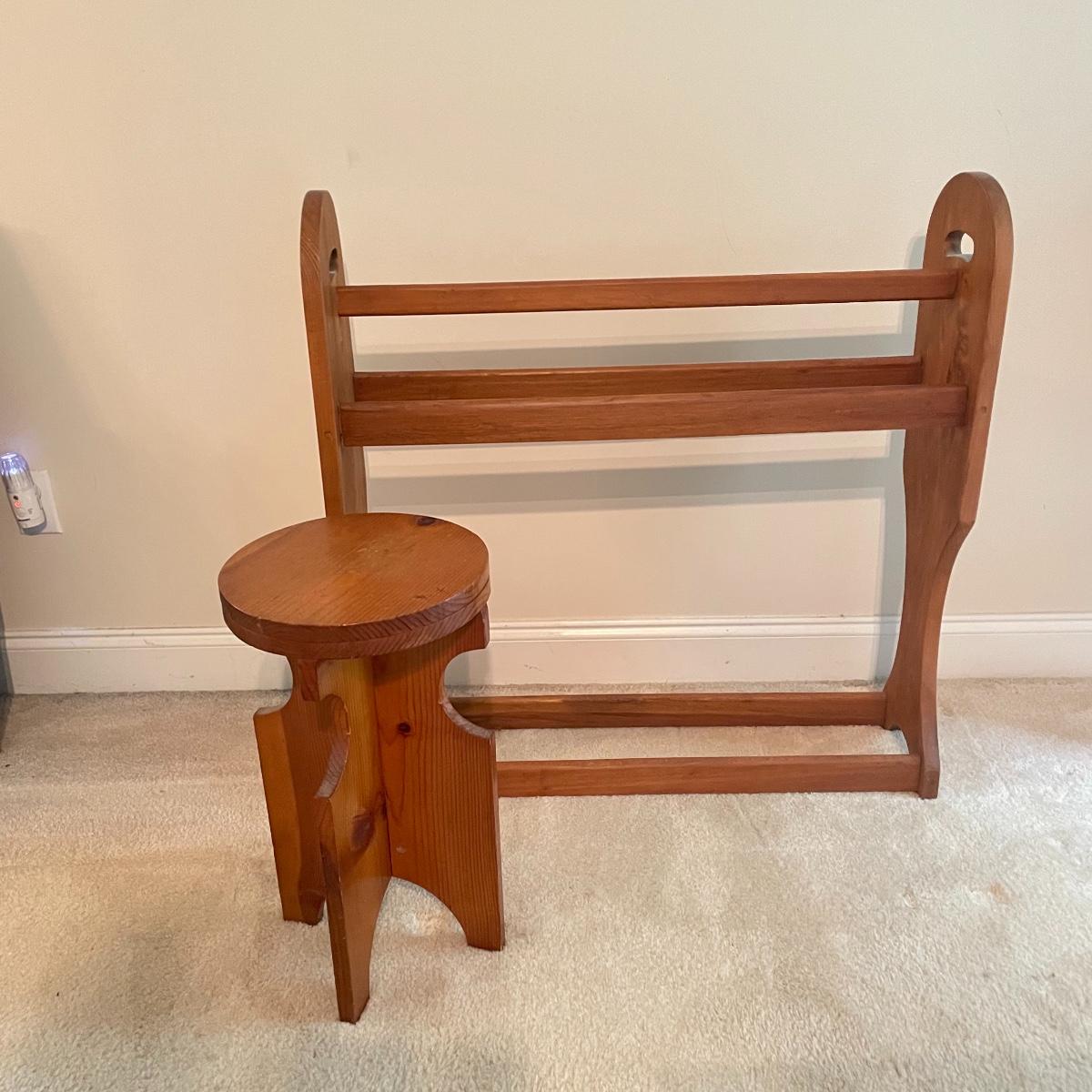 Sturdy solid wood quilt/blanket rack measuring 34” x 9” x 34.5” alongside a small table/plant stand. This piece is also solid wood, very close to the same shade as quilt rack, measuring 11.5” x 21.75”. Local pick up only.
