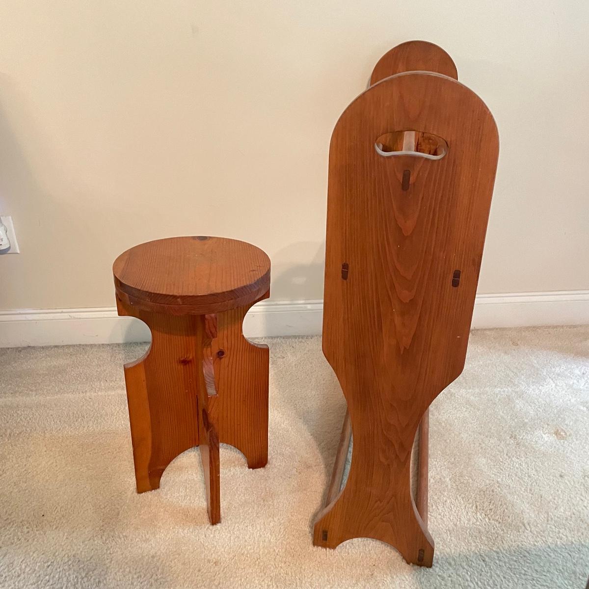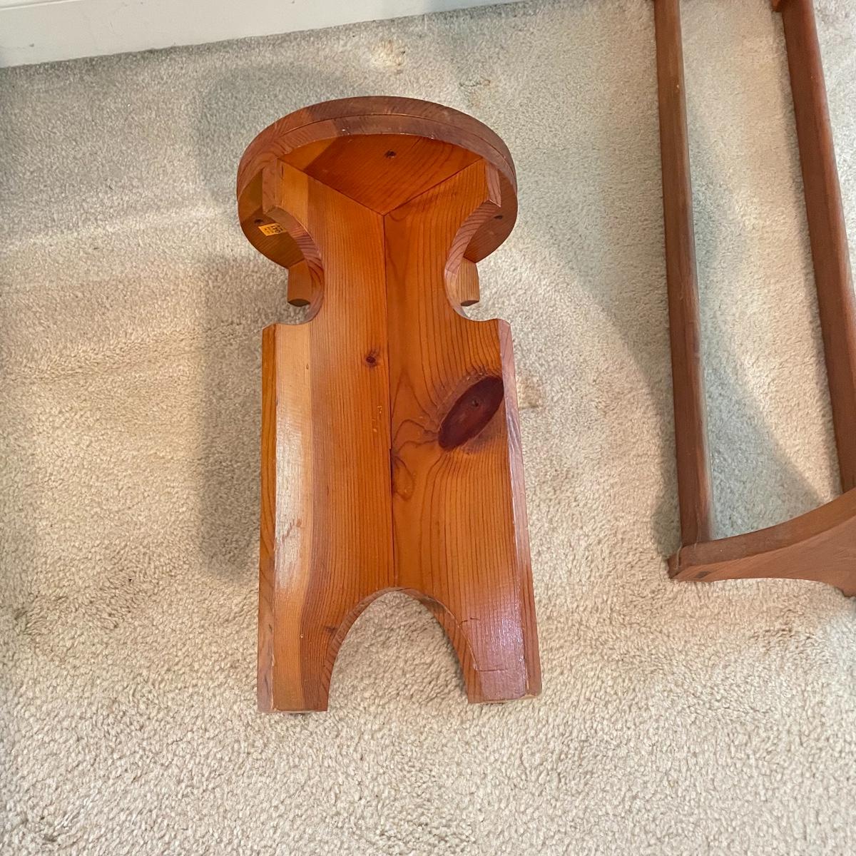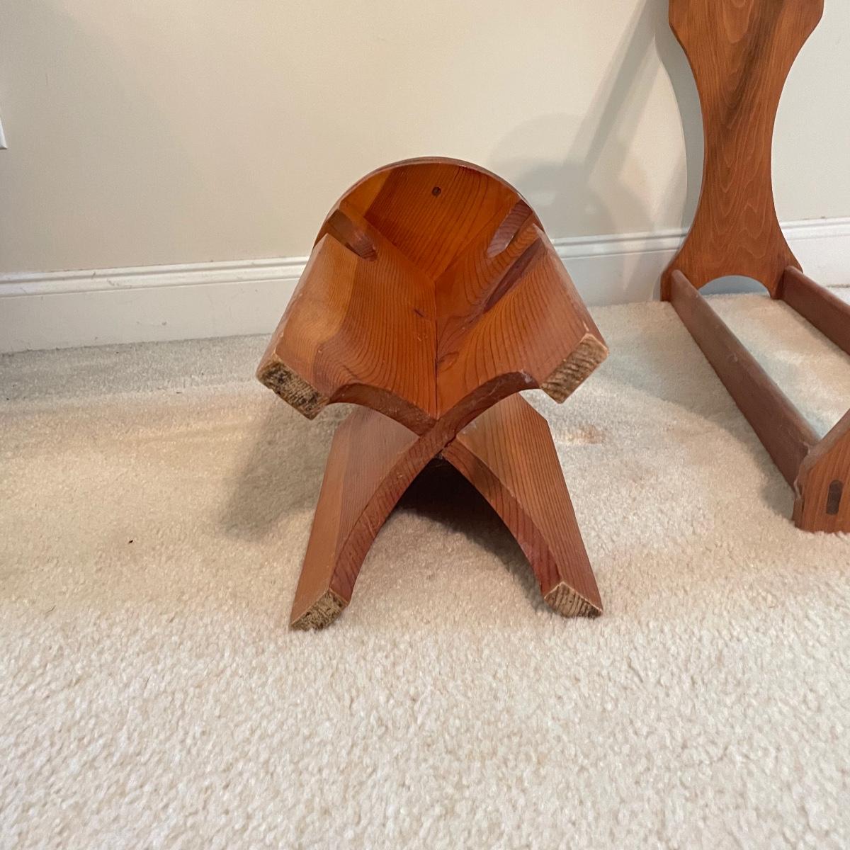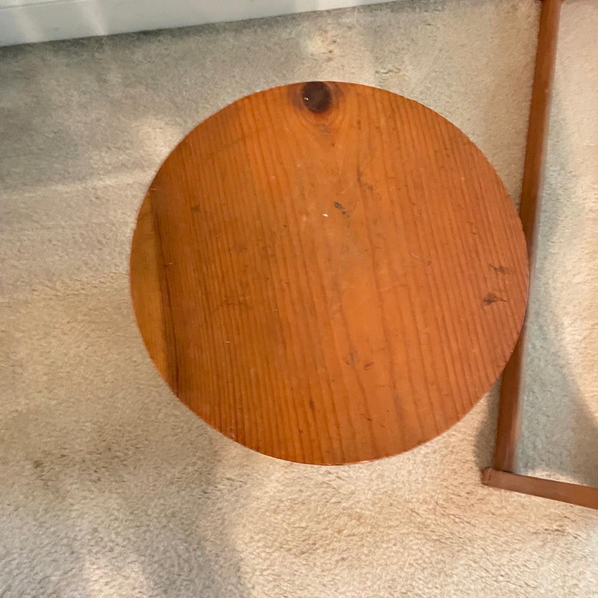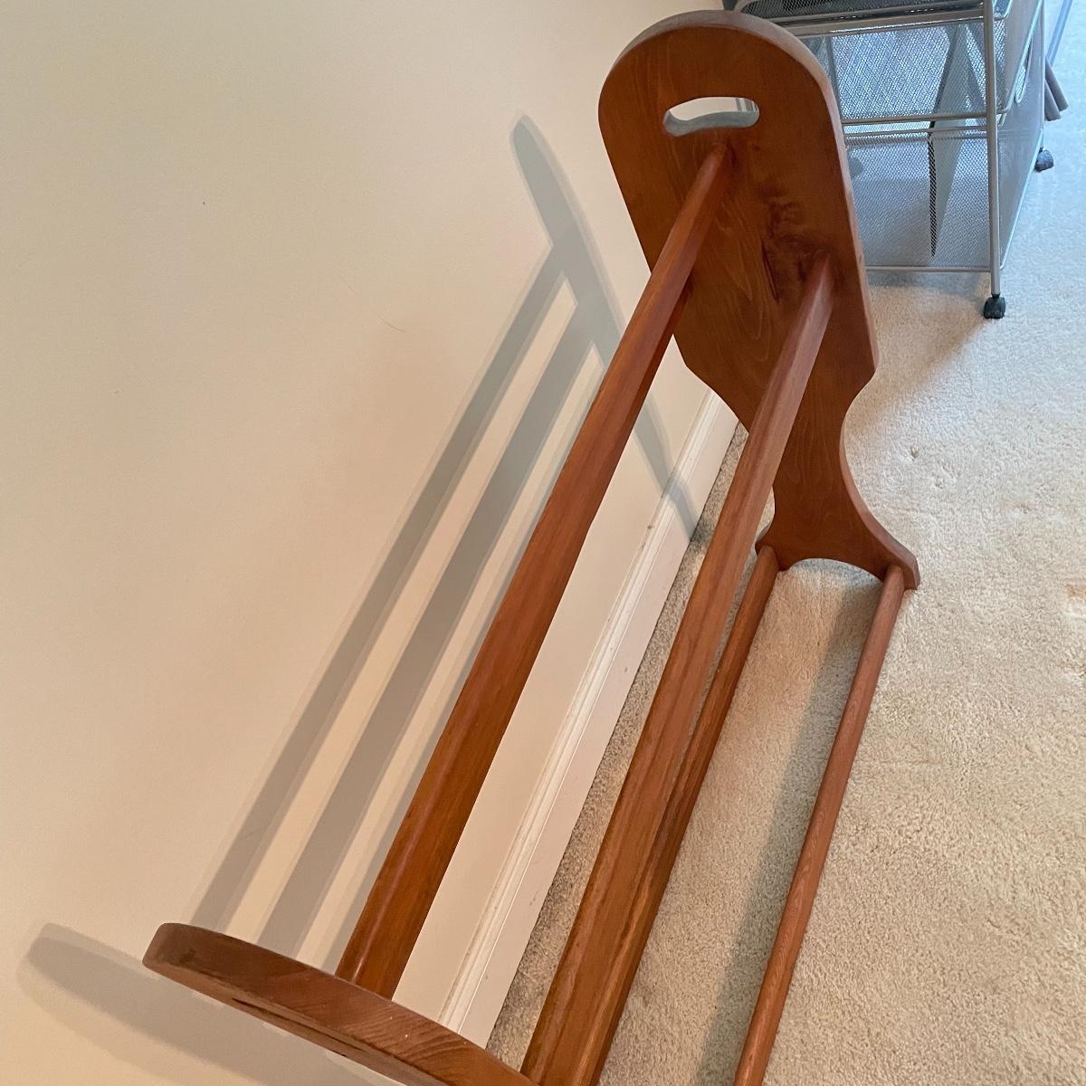 Sturdy solid wood quilt/blanket rack measuring 34” x 9” x 34.5” alongside a small table/plant stand. This piece is also solid wood, very close to the same shade as quilt rack, measuring 11.5” x 21.75”. Local pick up only.