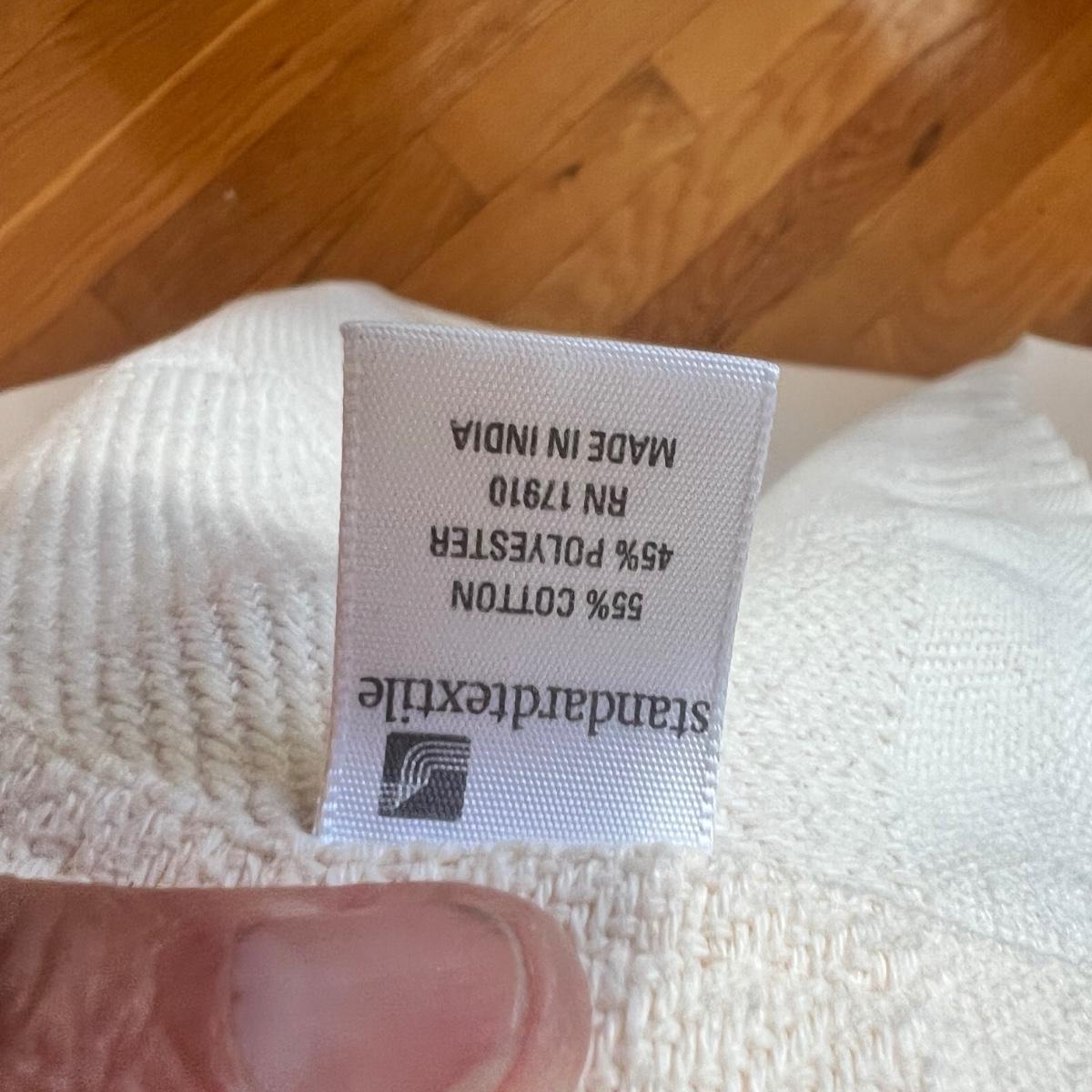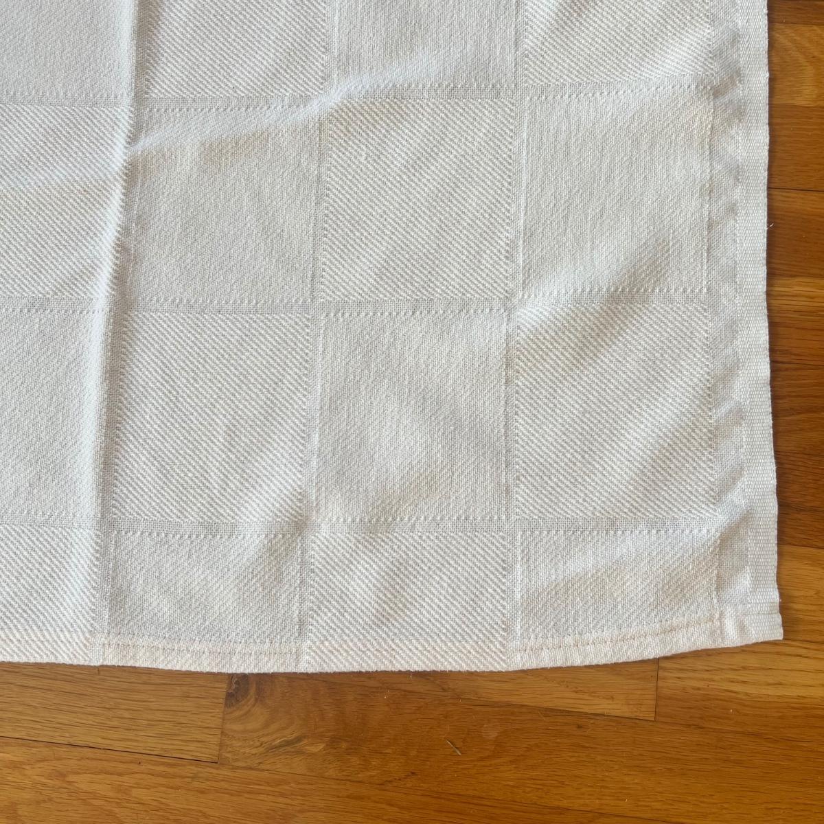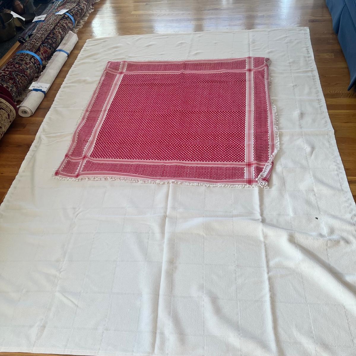 This solid wood small quilt rack has three bars to hang blankets or quilts. Also included are a cream cotton blanket and a pretty red and white tablecloth with a white tassel trim. Cream blanket measures 68” x 97”.