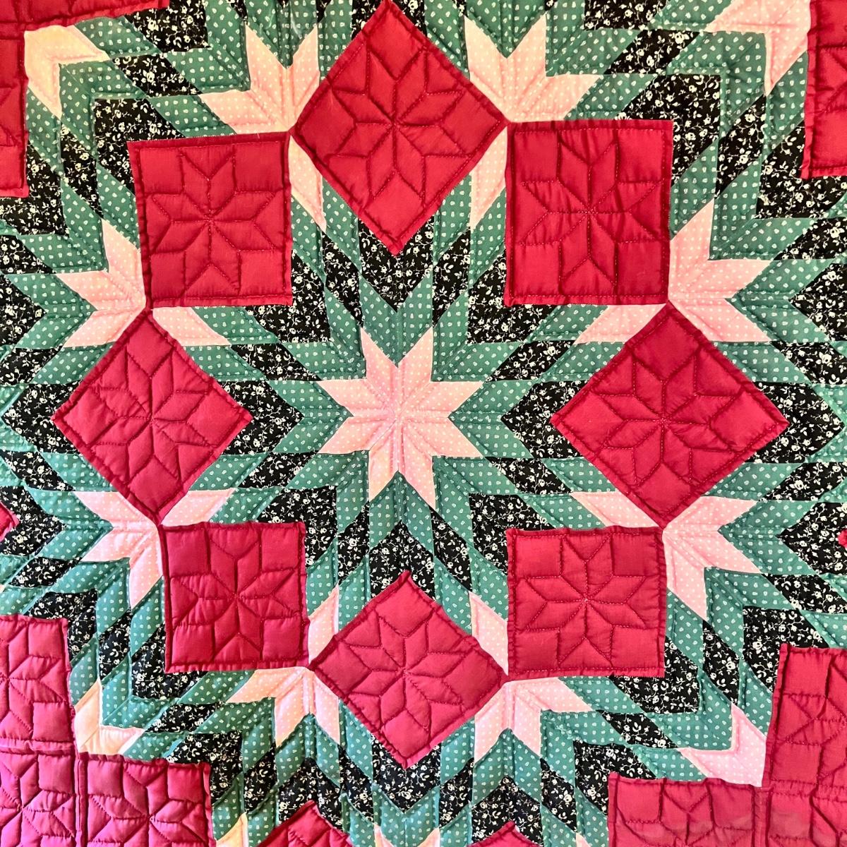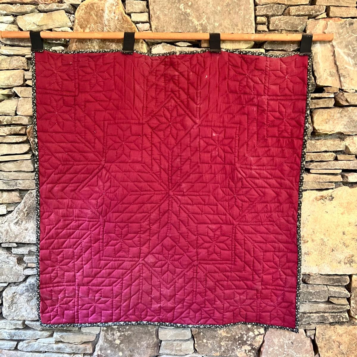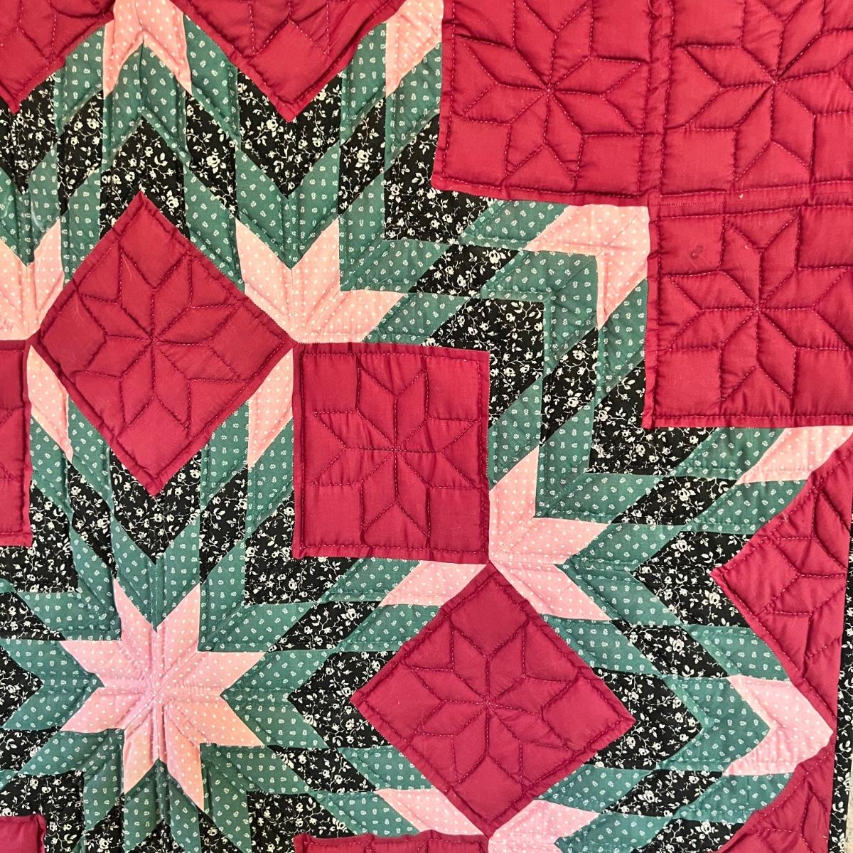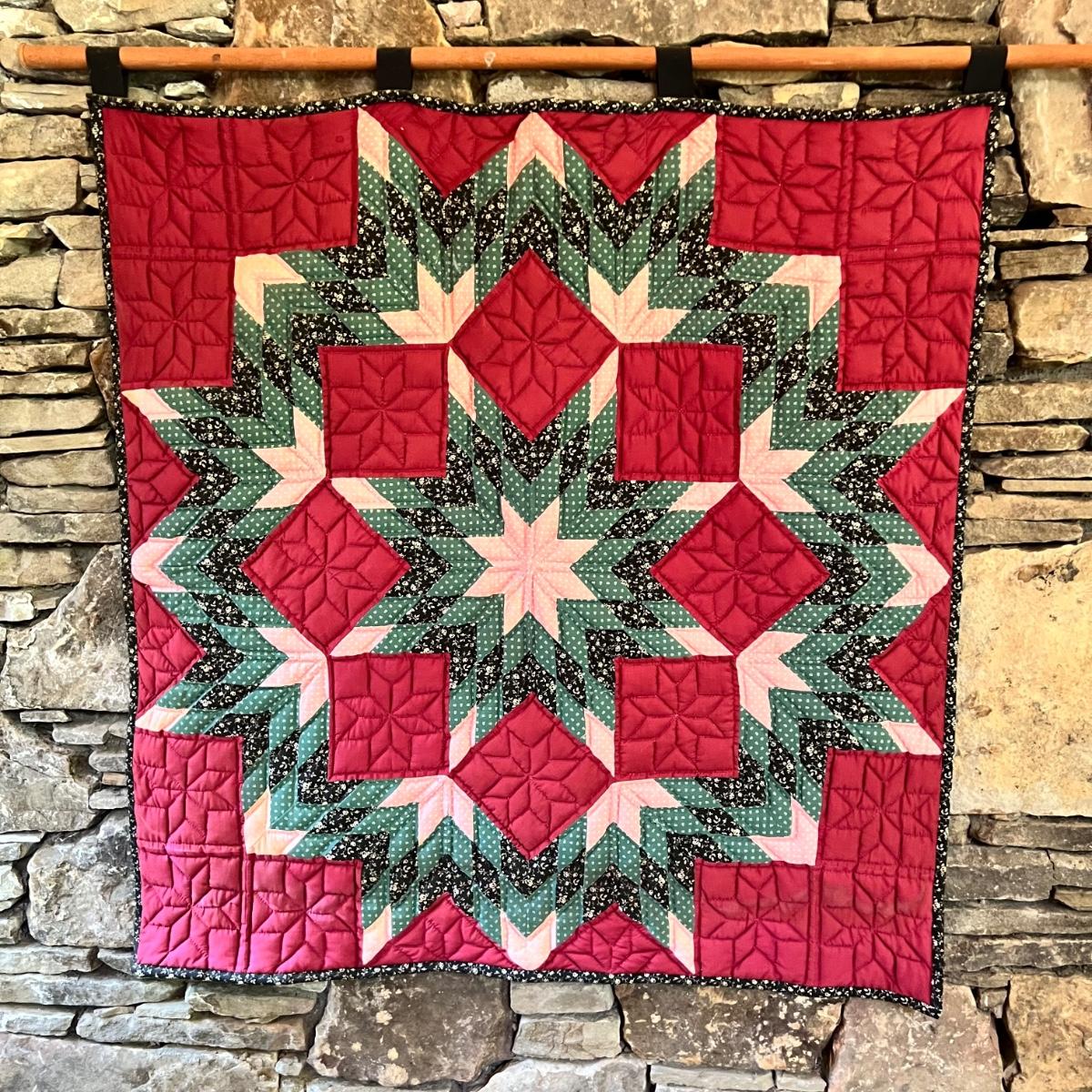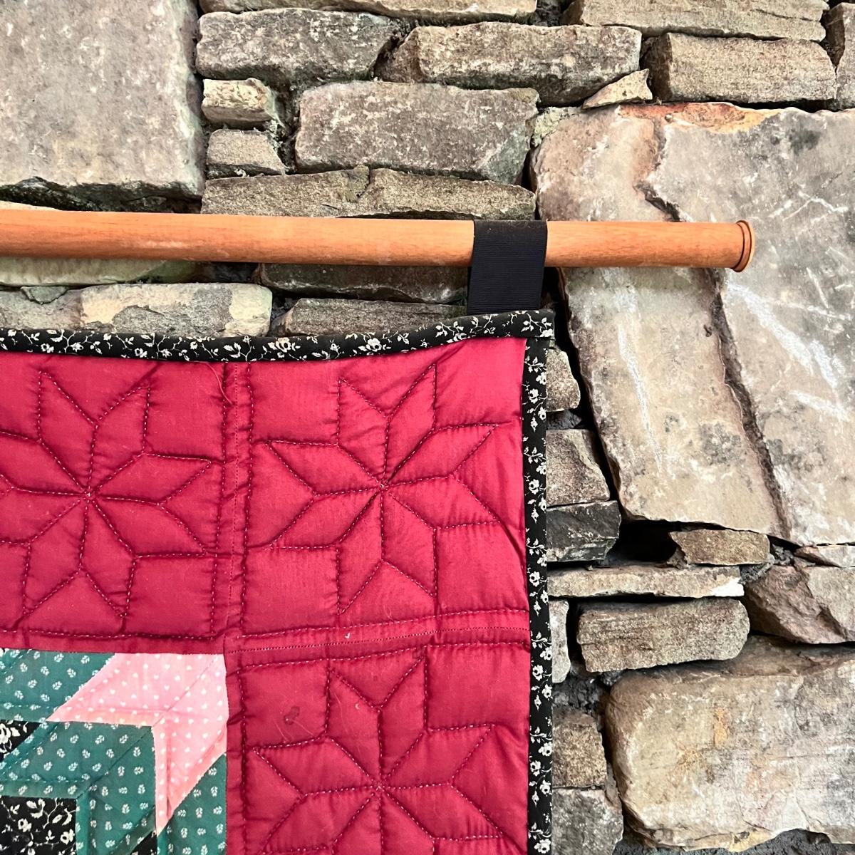 A quilted wall hanging in black, pink, green and maroon prints. The piece is hung on a wooden dowel and measures 40” x 42”H.