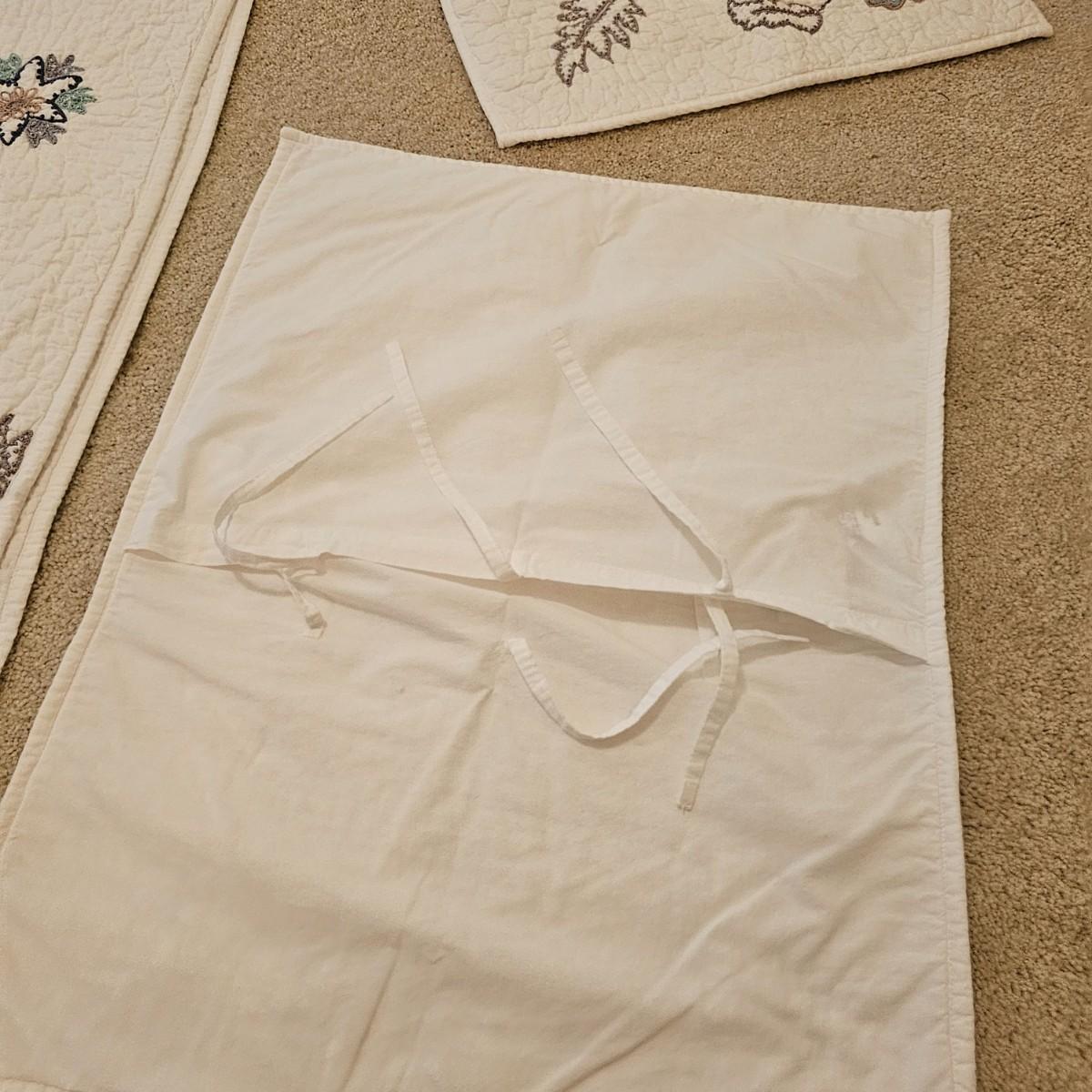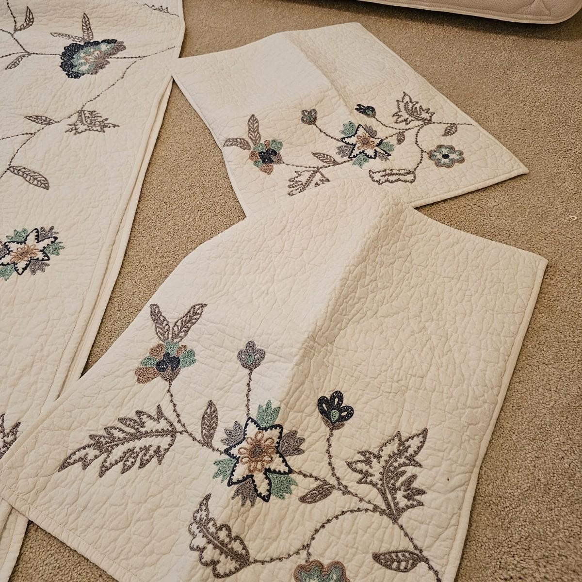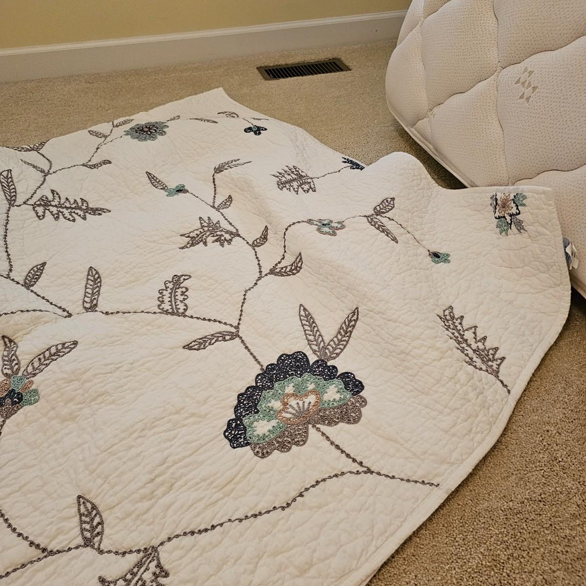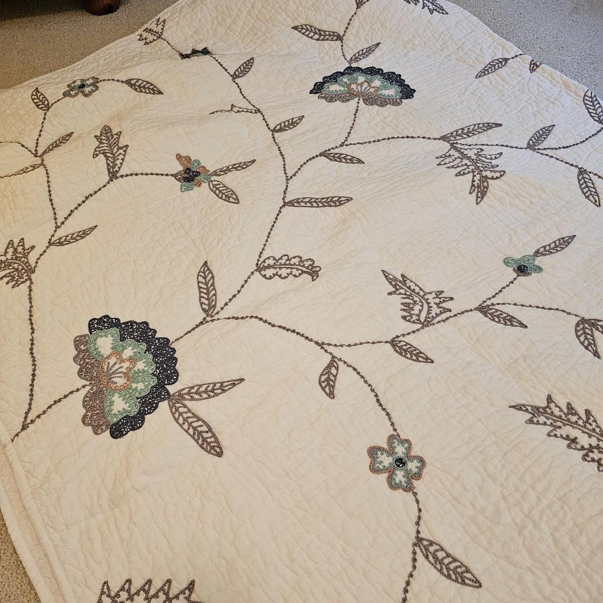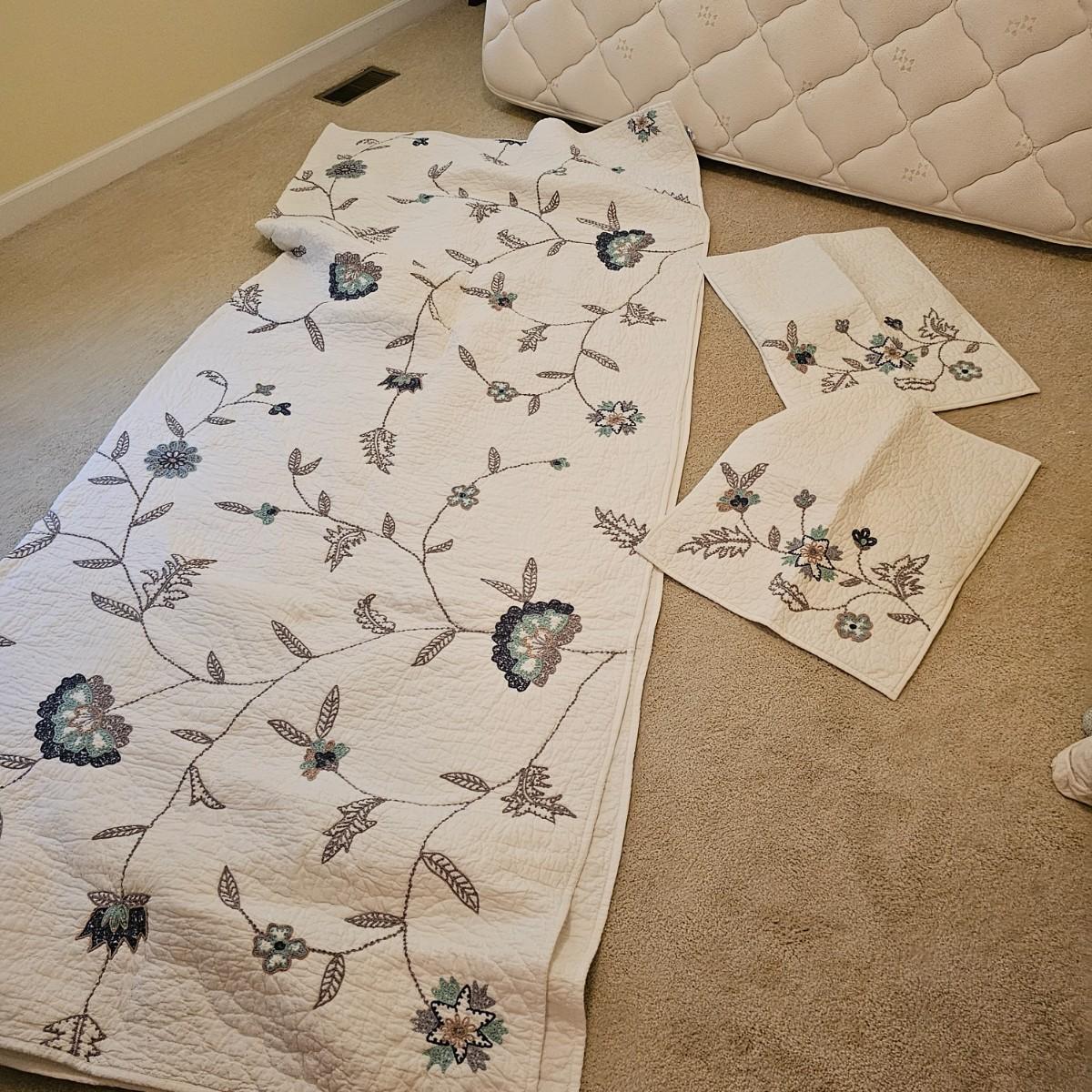 Two cotton pillow shams and matching quilted bedspread with floral/vine pattern, by The Company Store. Spread is 108" x 92" and shams are 21" x 27". See photos for details. Shipping available.