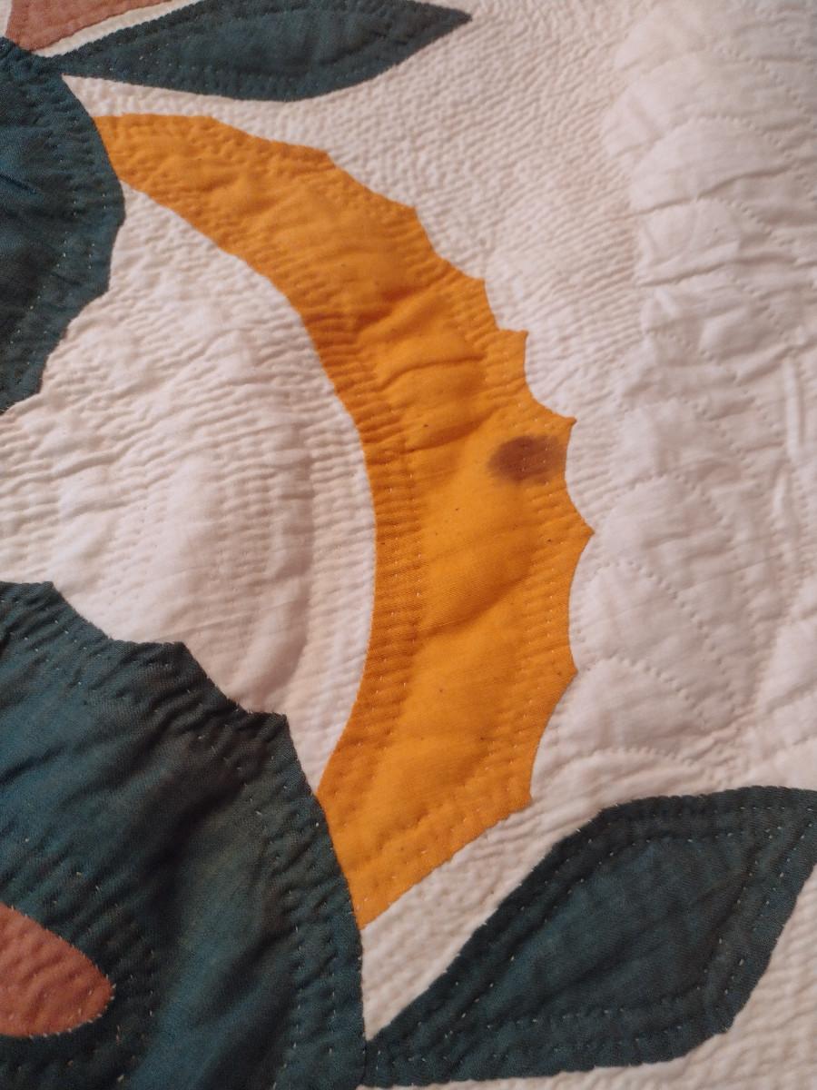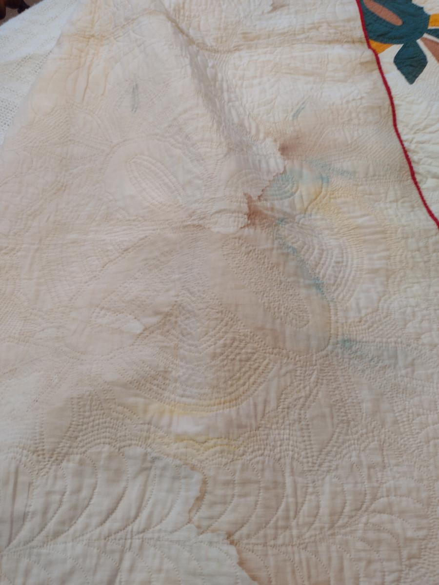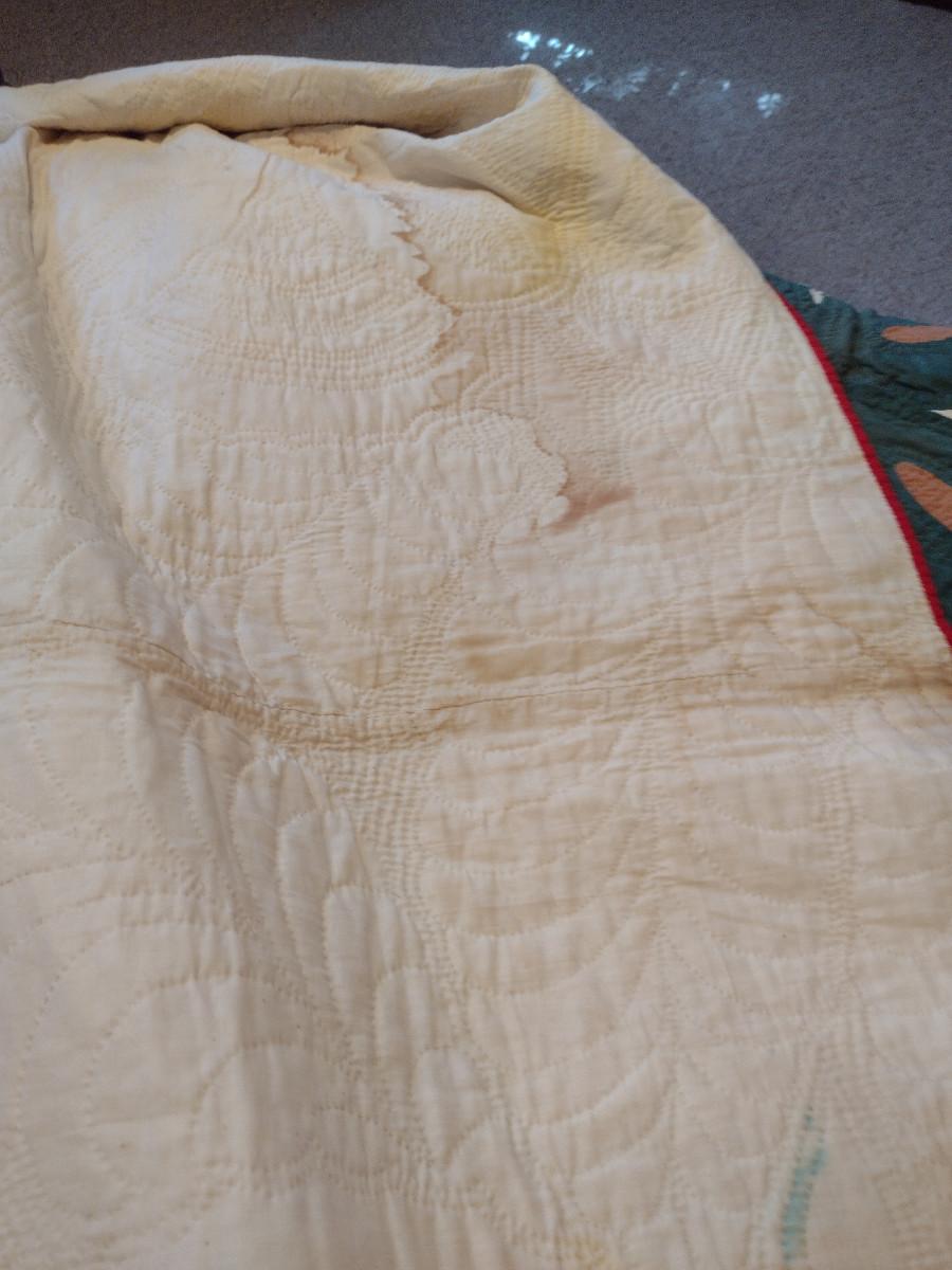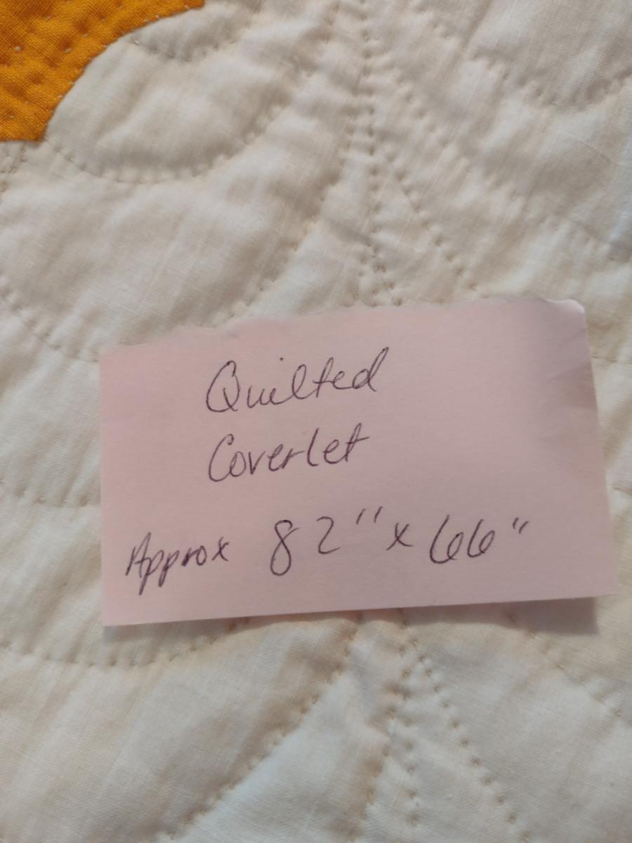 Quilted Coverlet- Approx 82" x 66". Backing has staining- please see all pictures for condition.