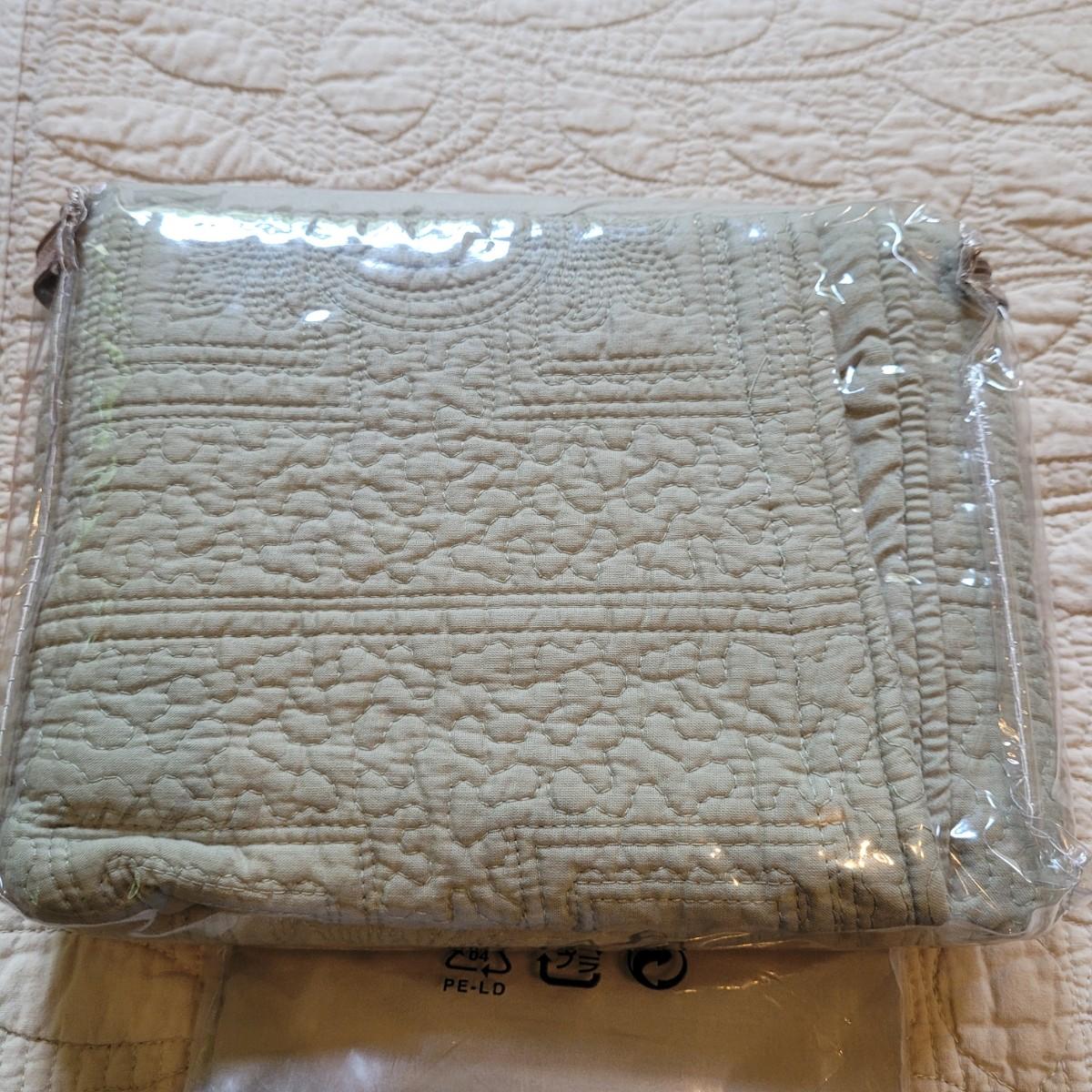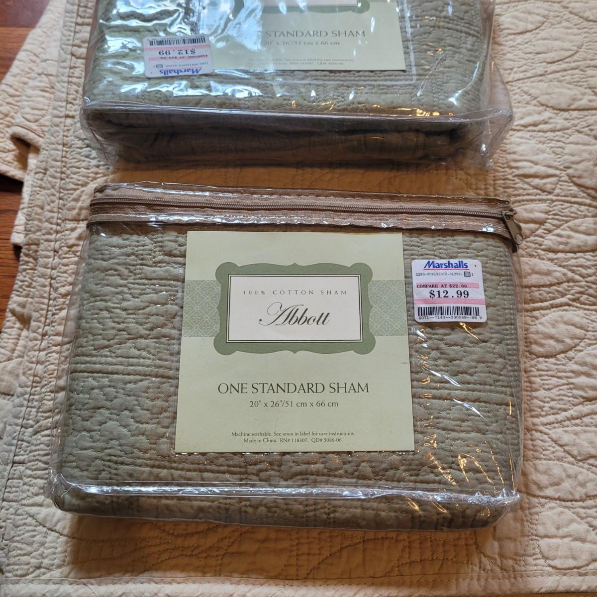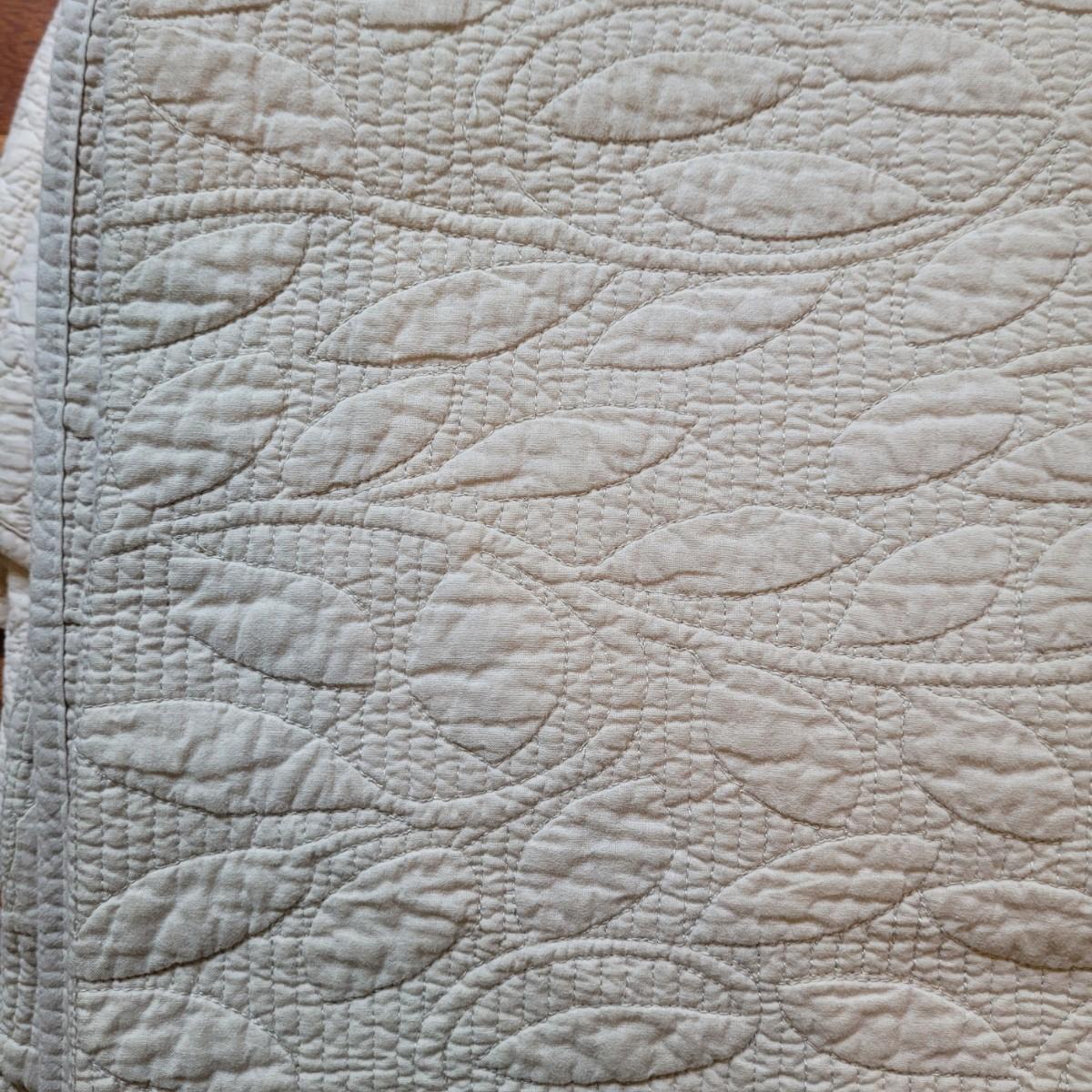 Two quilted queen coverlets, one light sage green and one cream colored. Quilted sham covers are a deeper sage green, in addition to one grey sham cover. Shipping available.
