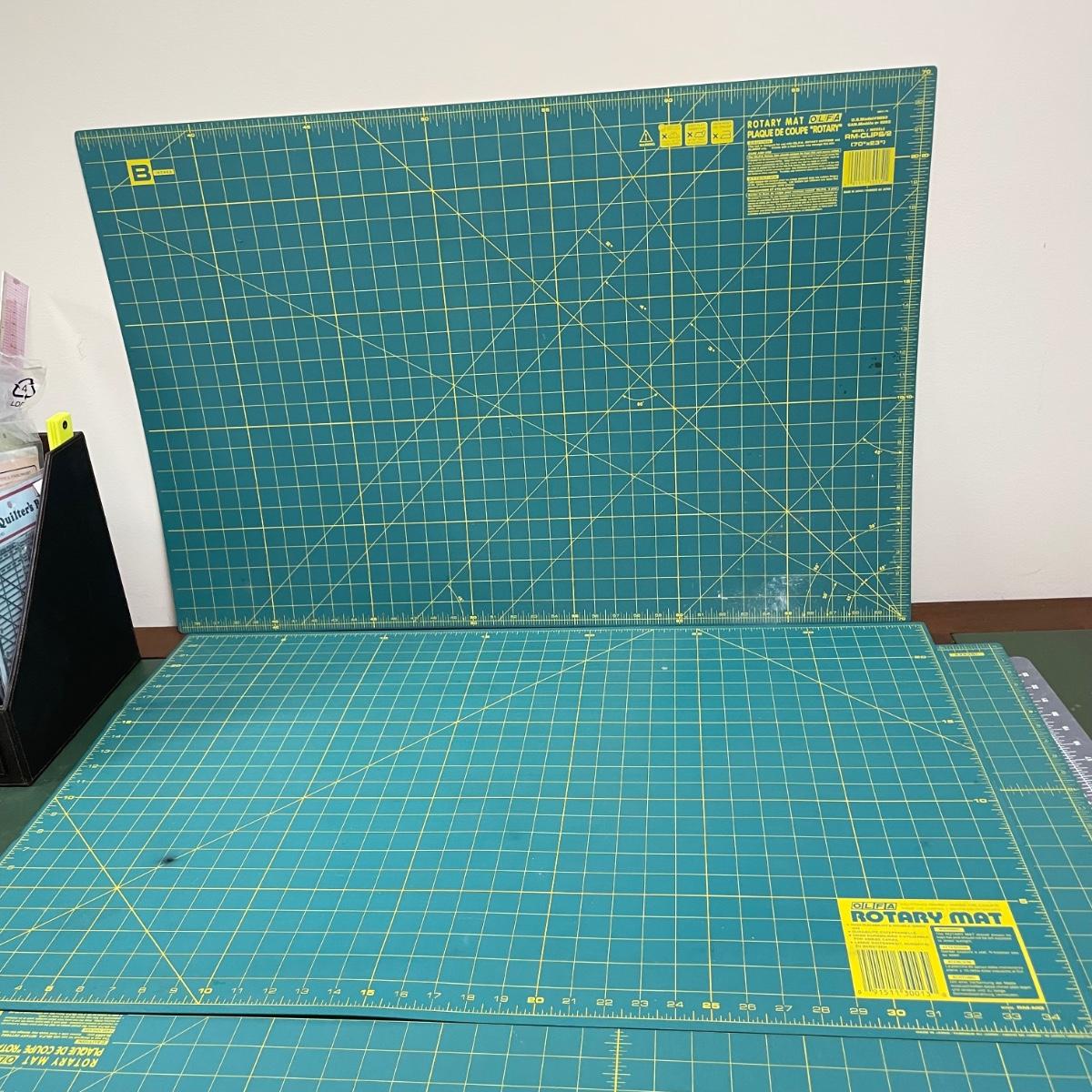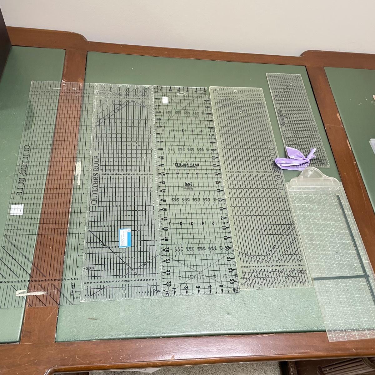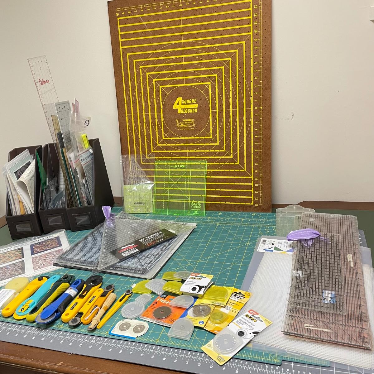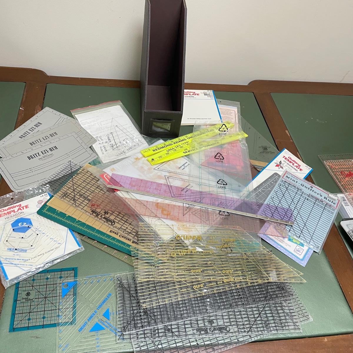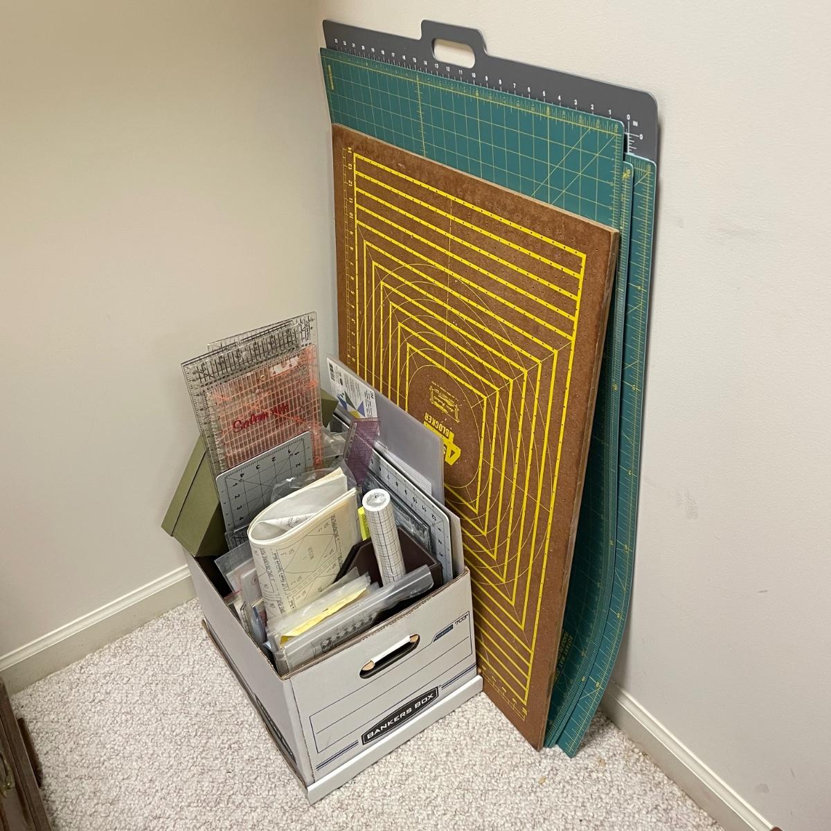 Huge selection for the new or seasoned quilter. Lot includes large rotary blades and mats, grids, rules. Grids come in all shapes and sizes. Vinyl covered file boxes are included. Largest mat has a grid of 23” x 35”, conditions vary, but all have a lot of life left. See images. Local pick up only.
