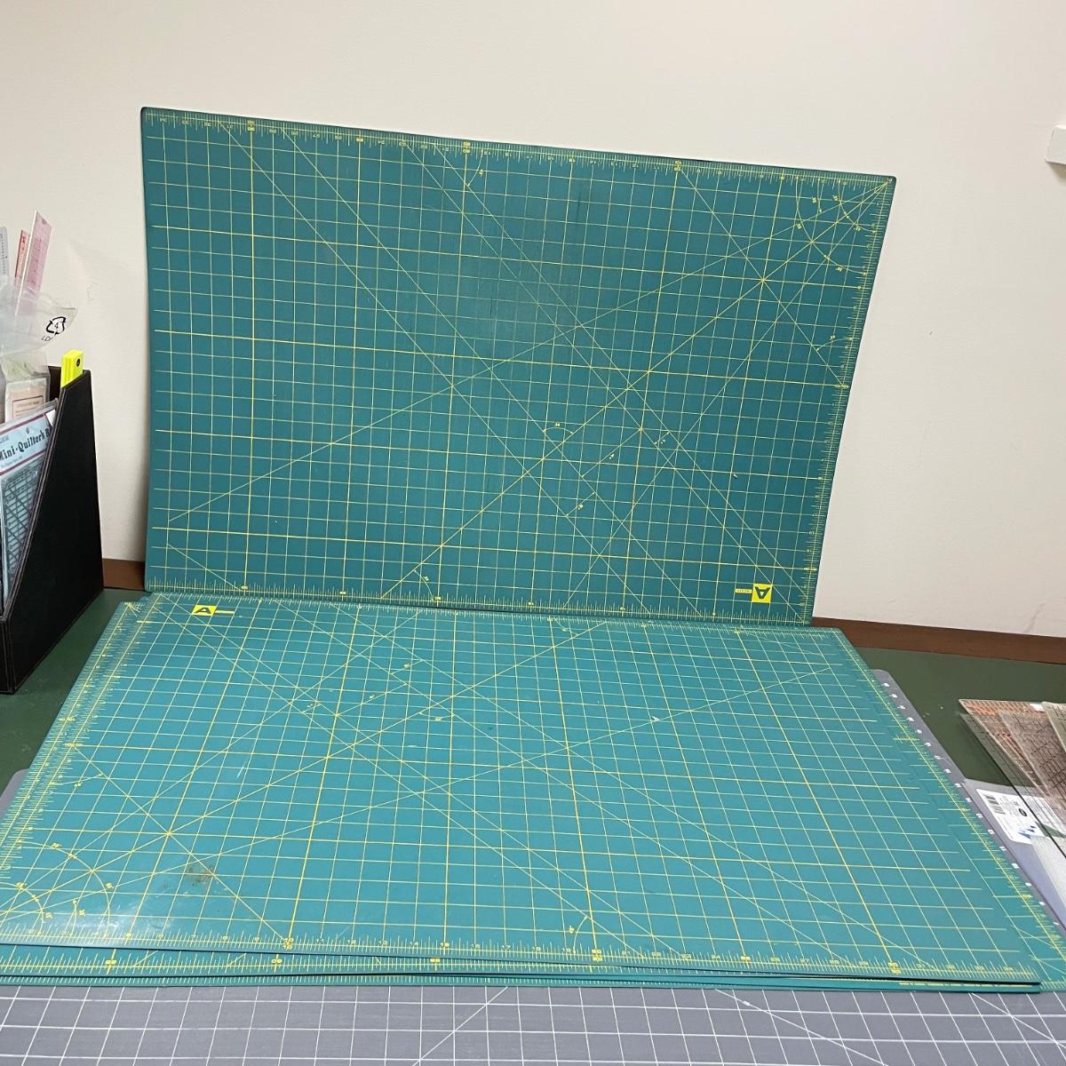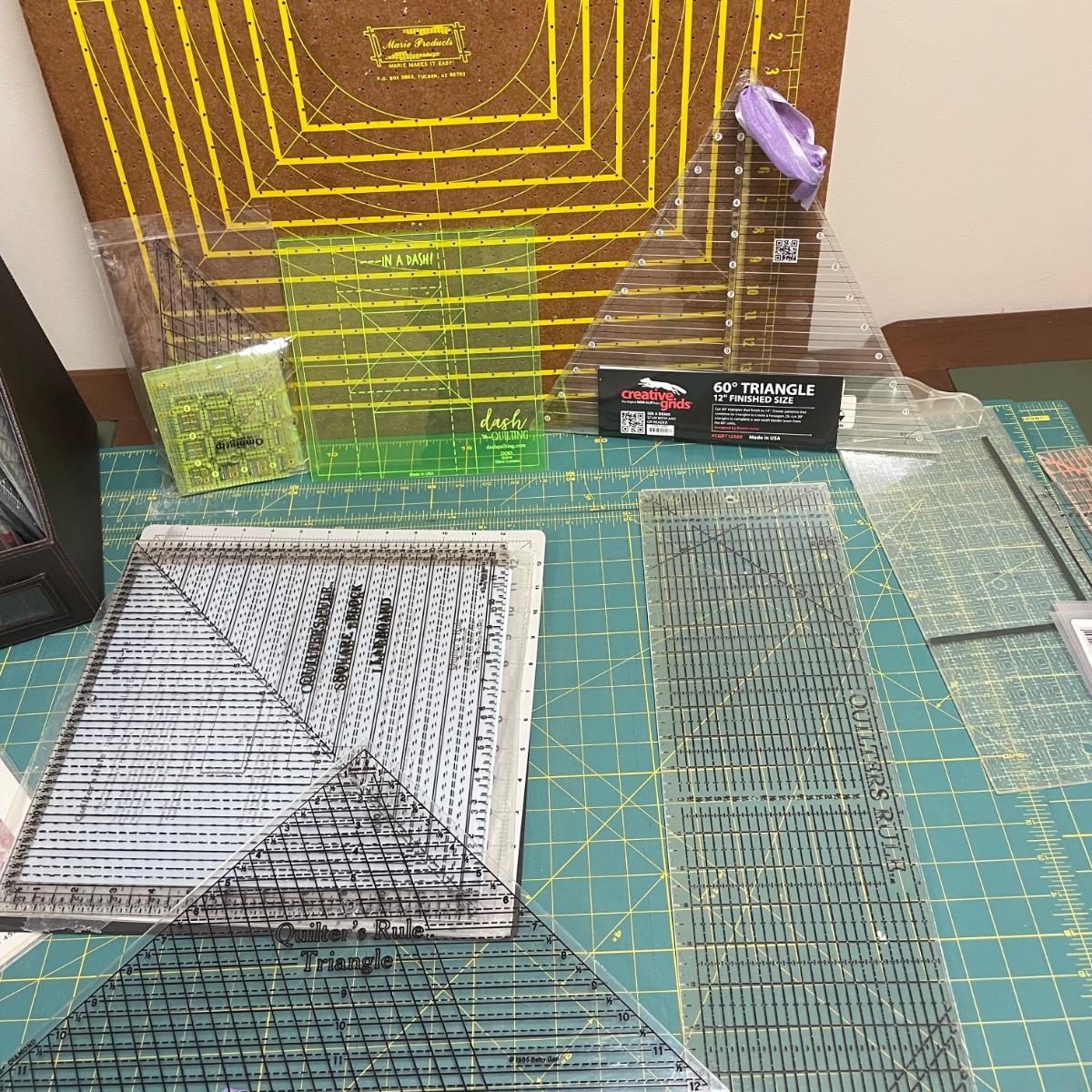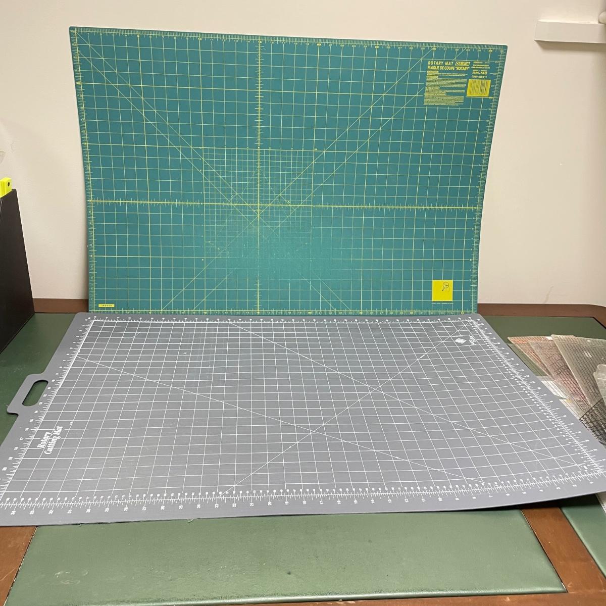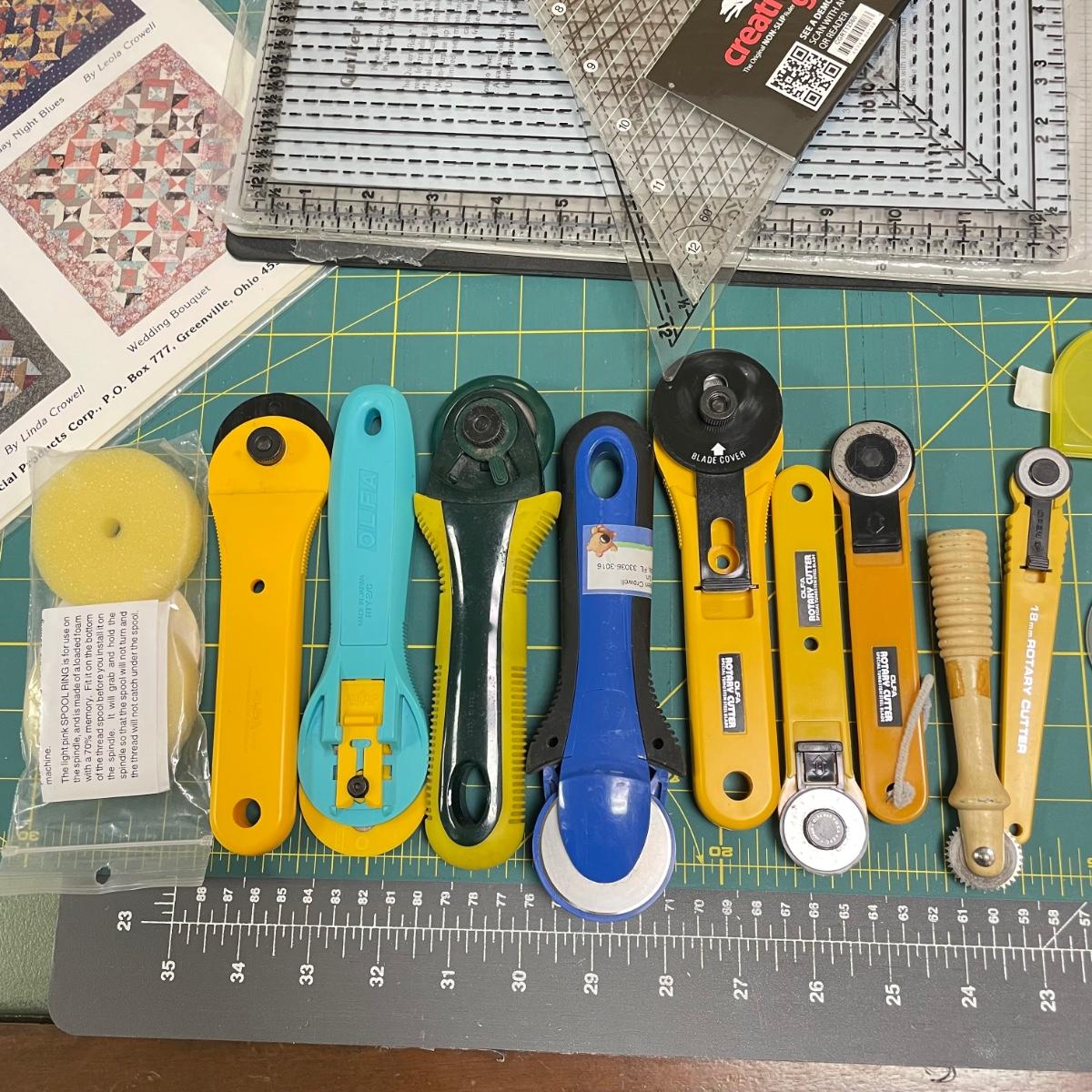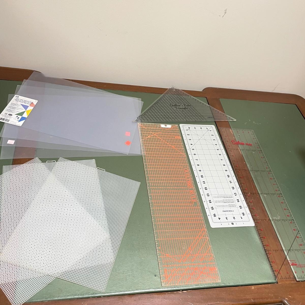 Huge selection for the new or seasoned quilter. Lot includes large rotary blades and mats, grids, rules. Grids come in all shapes and sizes. Vinyl covered file boxes are included. Largest mat has a grid of 23” x 35”, conditions vary, but all have a lot of life left. See images. Local pick up only.