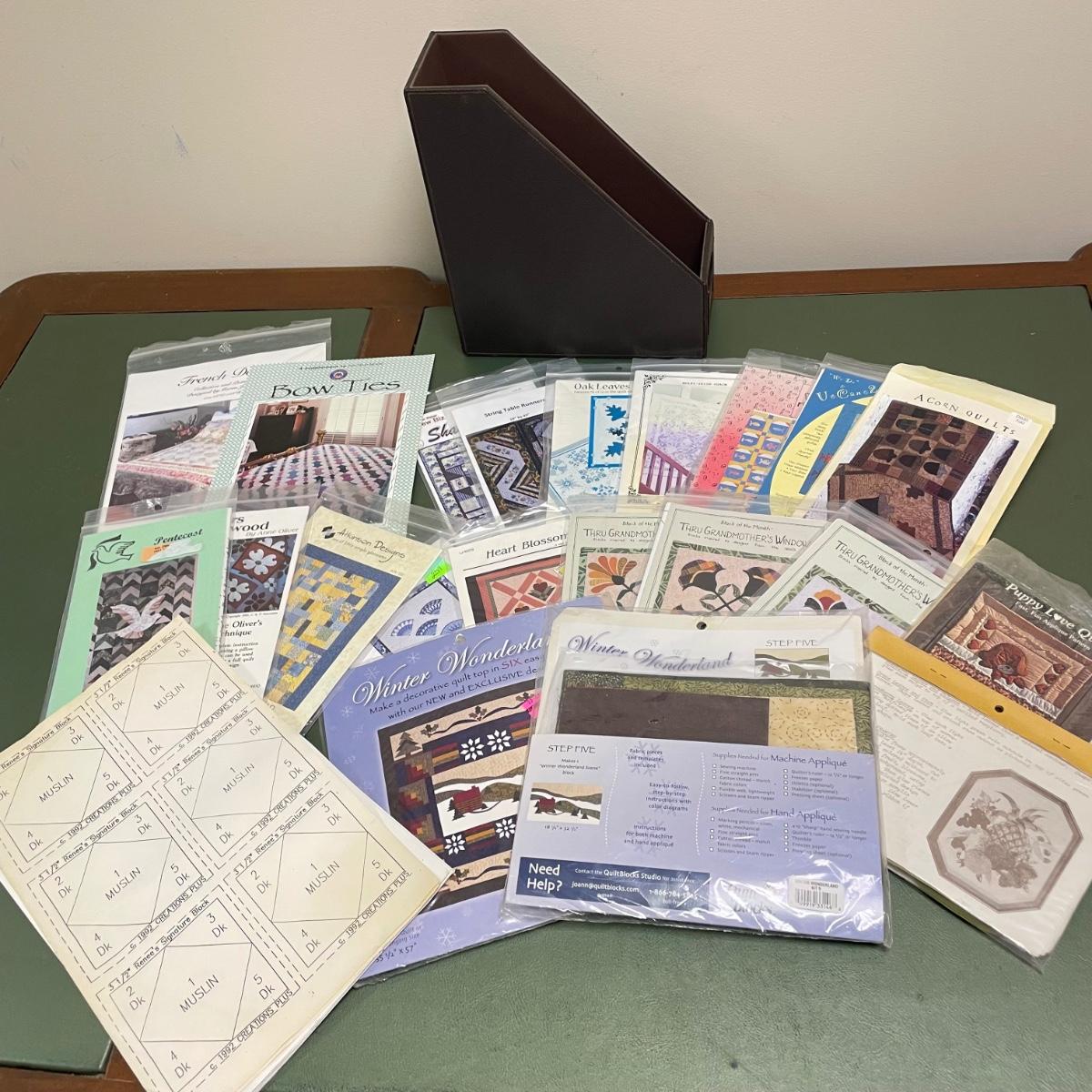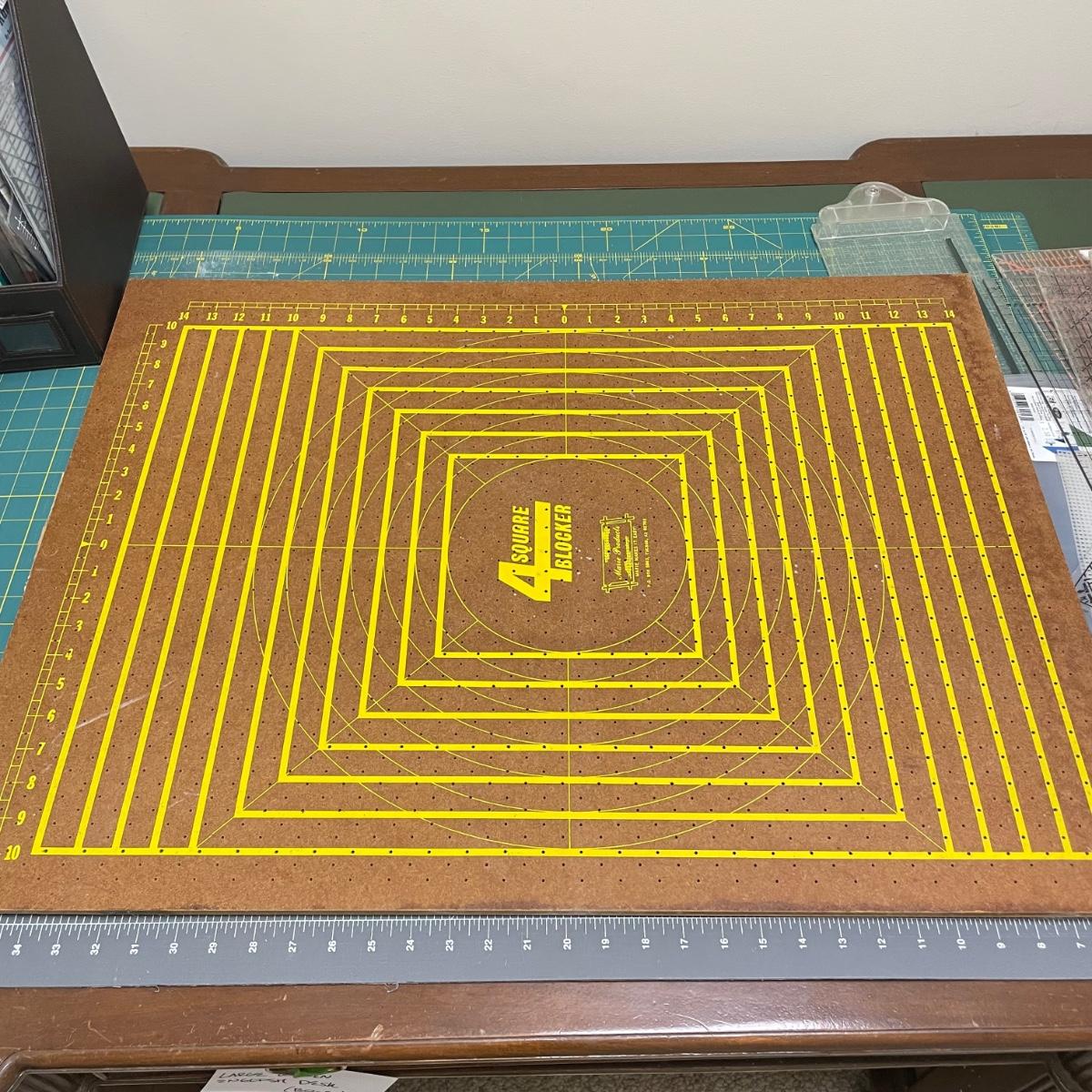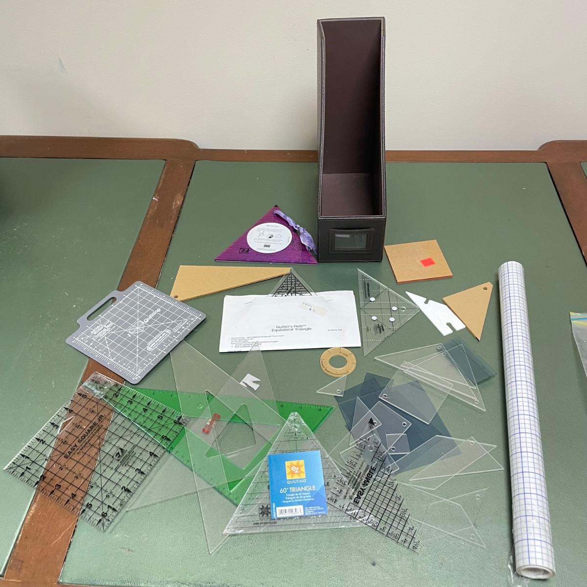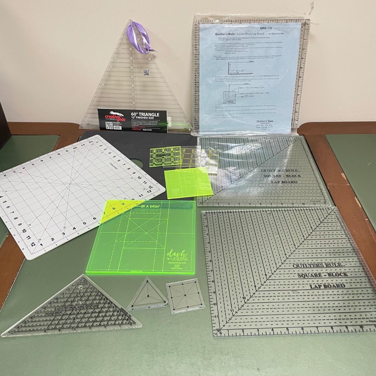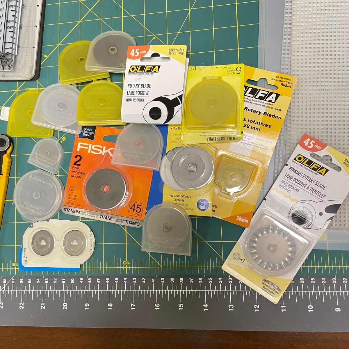 Huge selection for the new or seasoned quilter. Lot includes large rotary blades and mats, grids, rules. Grids come in all shapes and sizes. Vinyl covered file boxes are included. Largest mat has a grid of 23” x 35”, conditions vary, but all have a lot of life left. See images. Local pick up only.