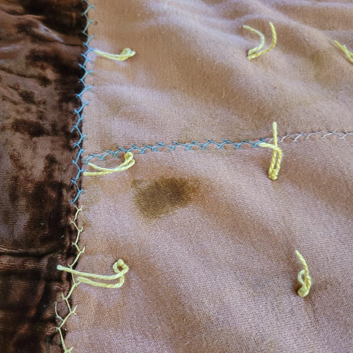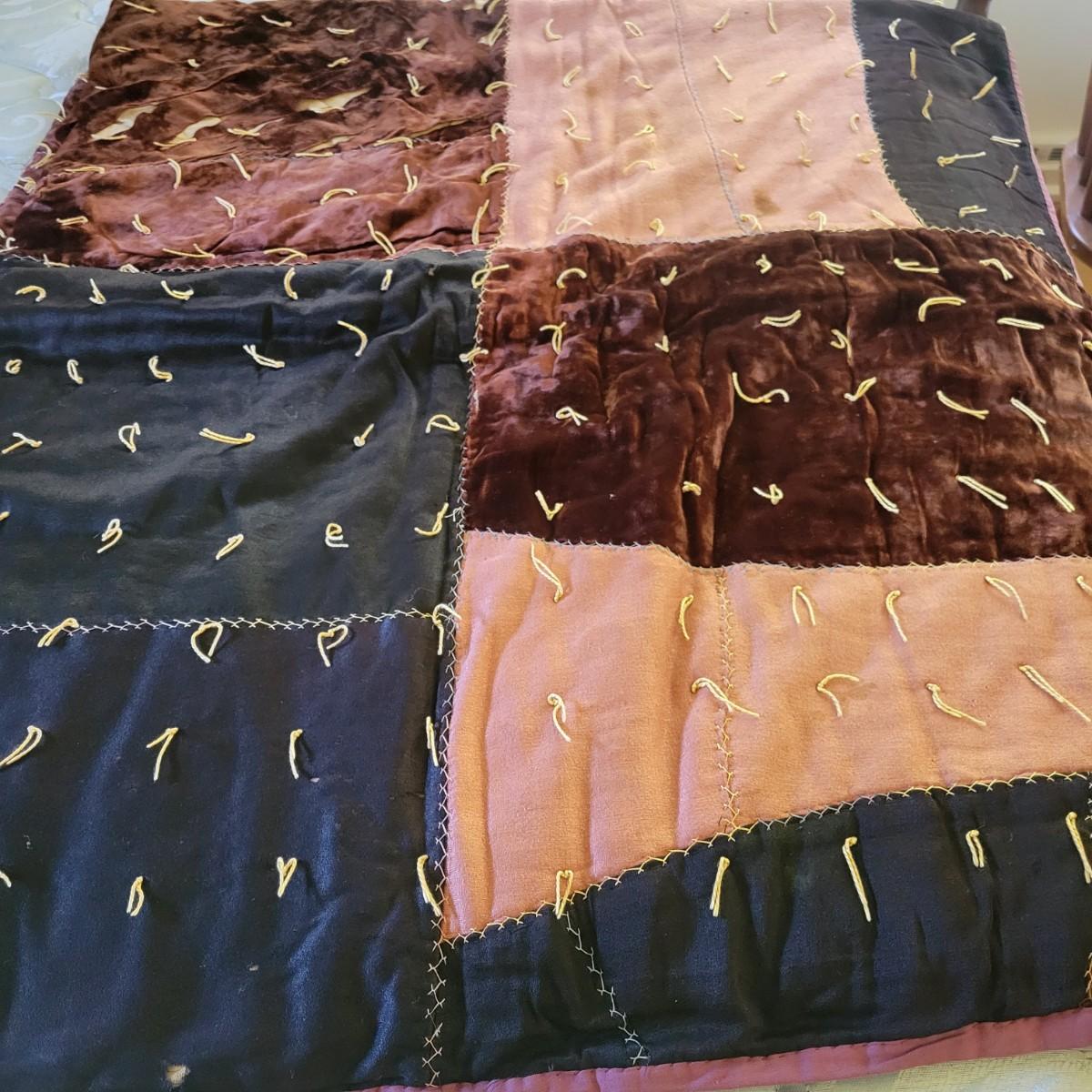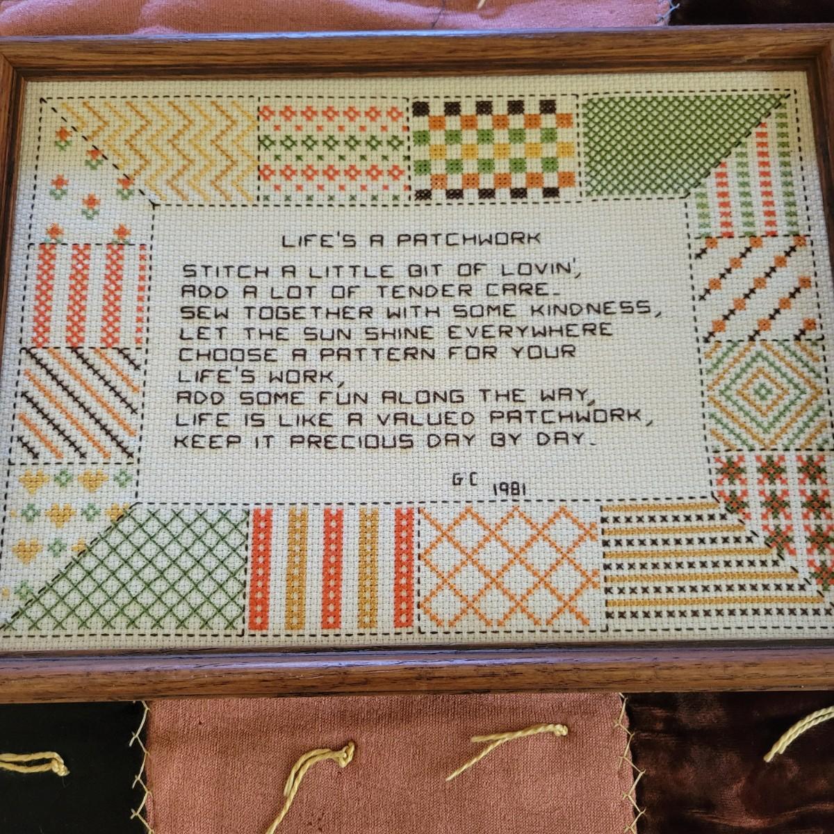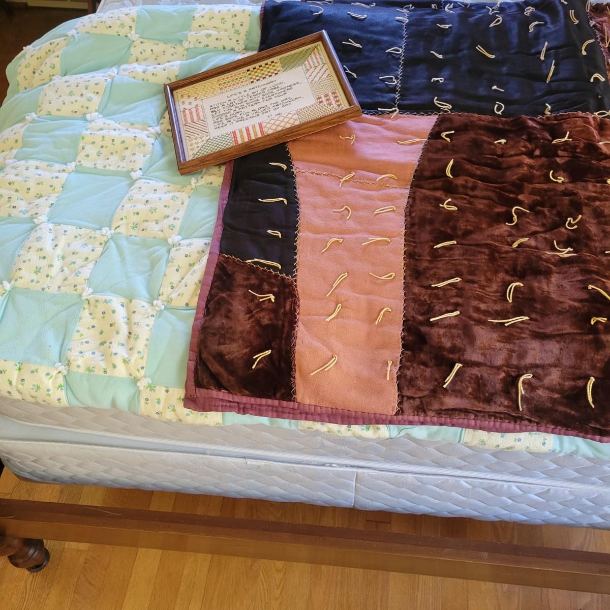 A pair of quilts and a framed needlepoint in good condition. The darker quilt does have some stains and tears in the fabric. Both quilts are handmade. The blue one is a cotton type fabric and measures approximately 64" x 86. Darker quilt is a mix of cotton and velvet type materials and measures approximately the same size as the other. Needlepoint is in a wooden frame with no glass and measures approximately 11.5" x 8.5" x 1" Local pickup only