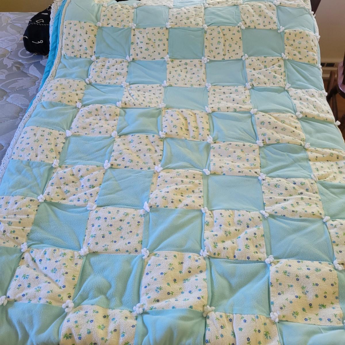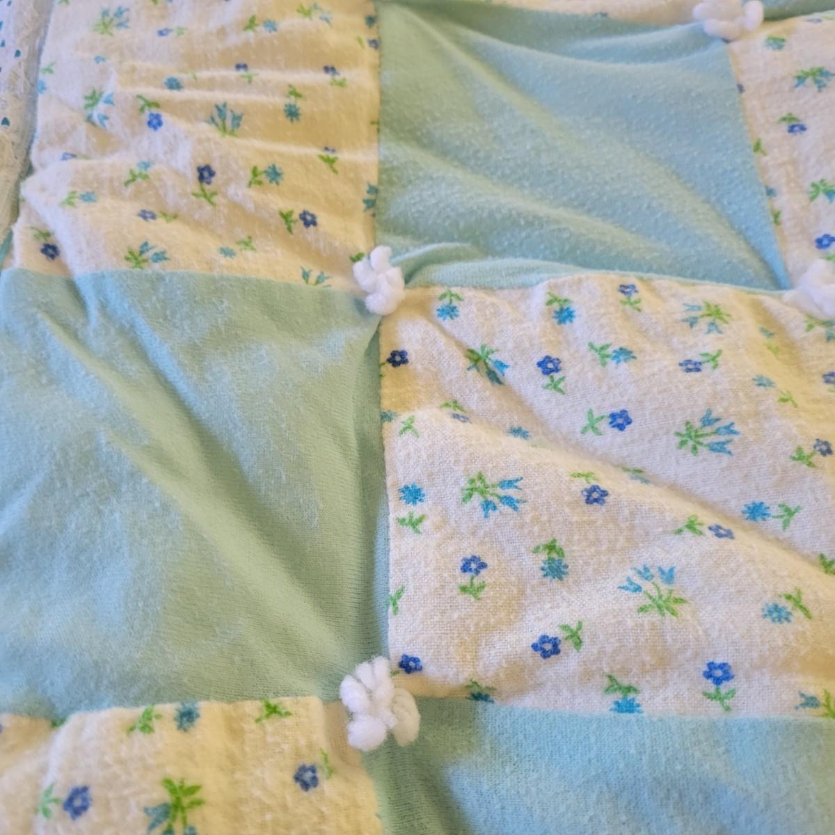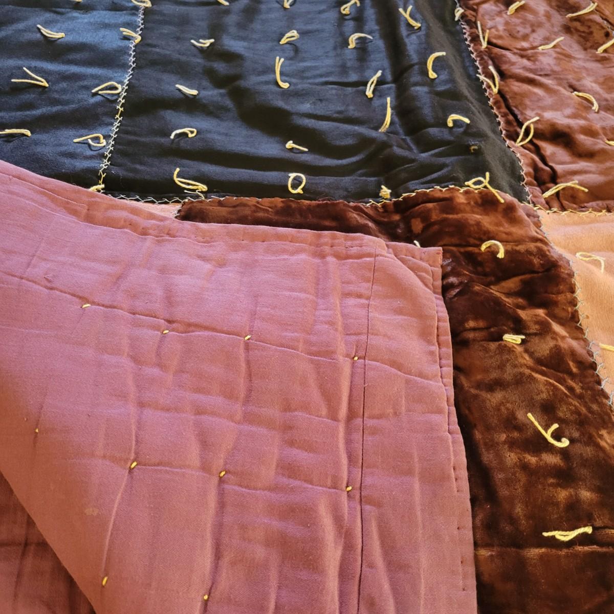 A pair of quilts and a framed needlepoint in good condition. The darker quilt does have some stains and tears in the fabric. Both quilts are handmade. The blue one is a cotton type fabric and measures approximately 64" x 86. Darker quilt is a mix of cotton and velvet type materials and measures approximately the same size as the other. Needlepoint is in a wooden frame with no glass and measures approximately 11.5" x 8.5" x 1" Local pickup only