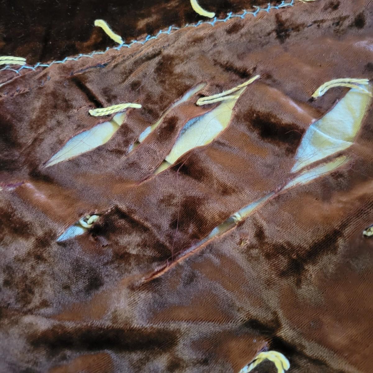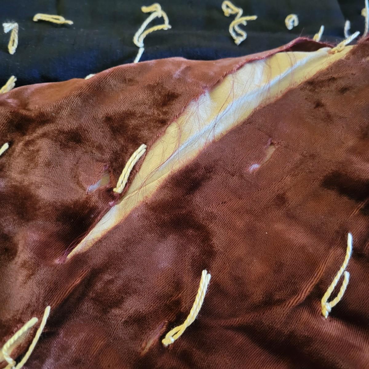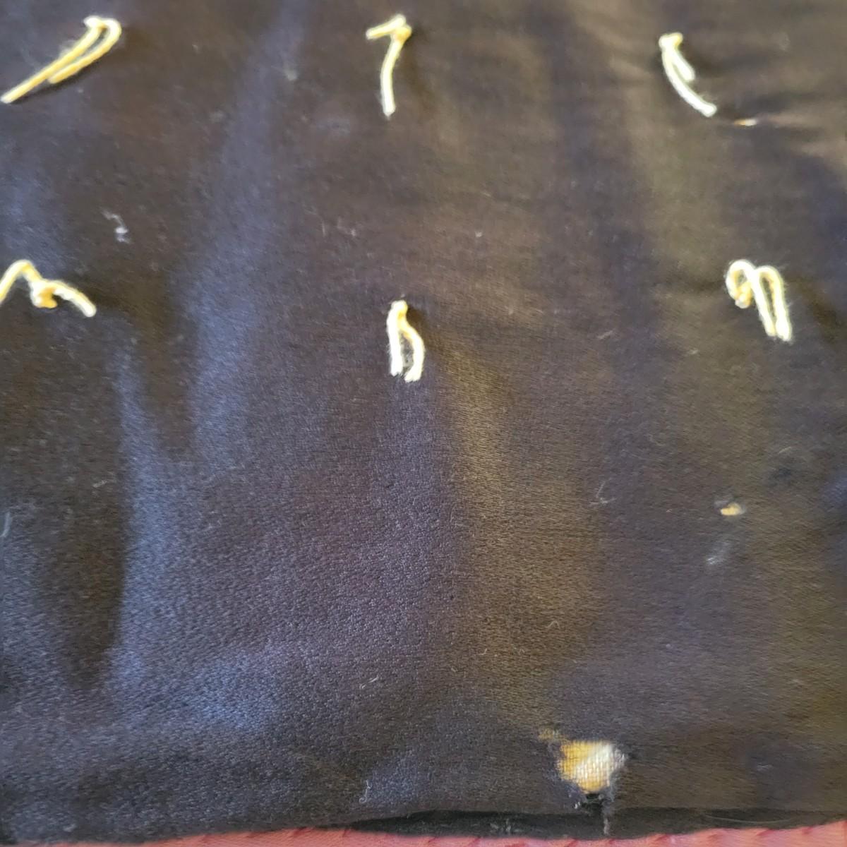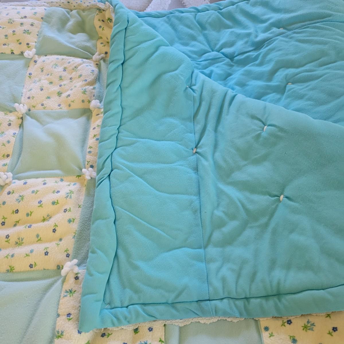 A pair of quilts and a framed needlepoint in good condition. The darker quilt does have some stains and tears in the fabric. Both quilts are handmade. The blue one is a cotton type fabric and measures approximately 64" x 86. Darker quilt is a mix of cotton and velvet type materials and measures approximately the same size as the other. Needlepoint is in a wooden frame with no glass and measures approximately 11.5" x 8.5" x 1" Local pickup only