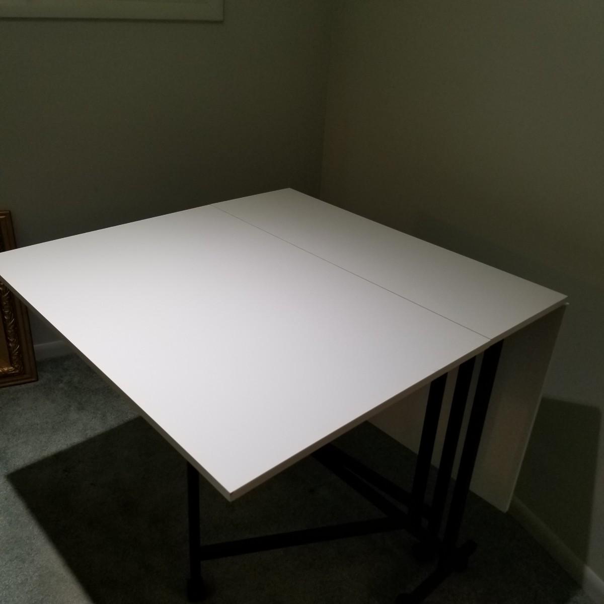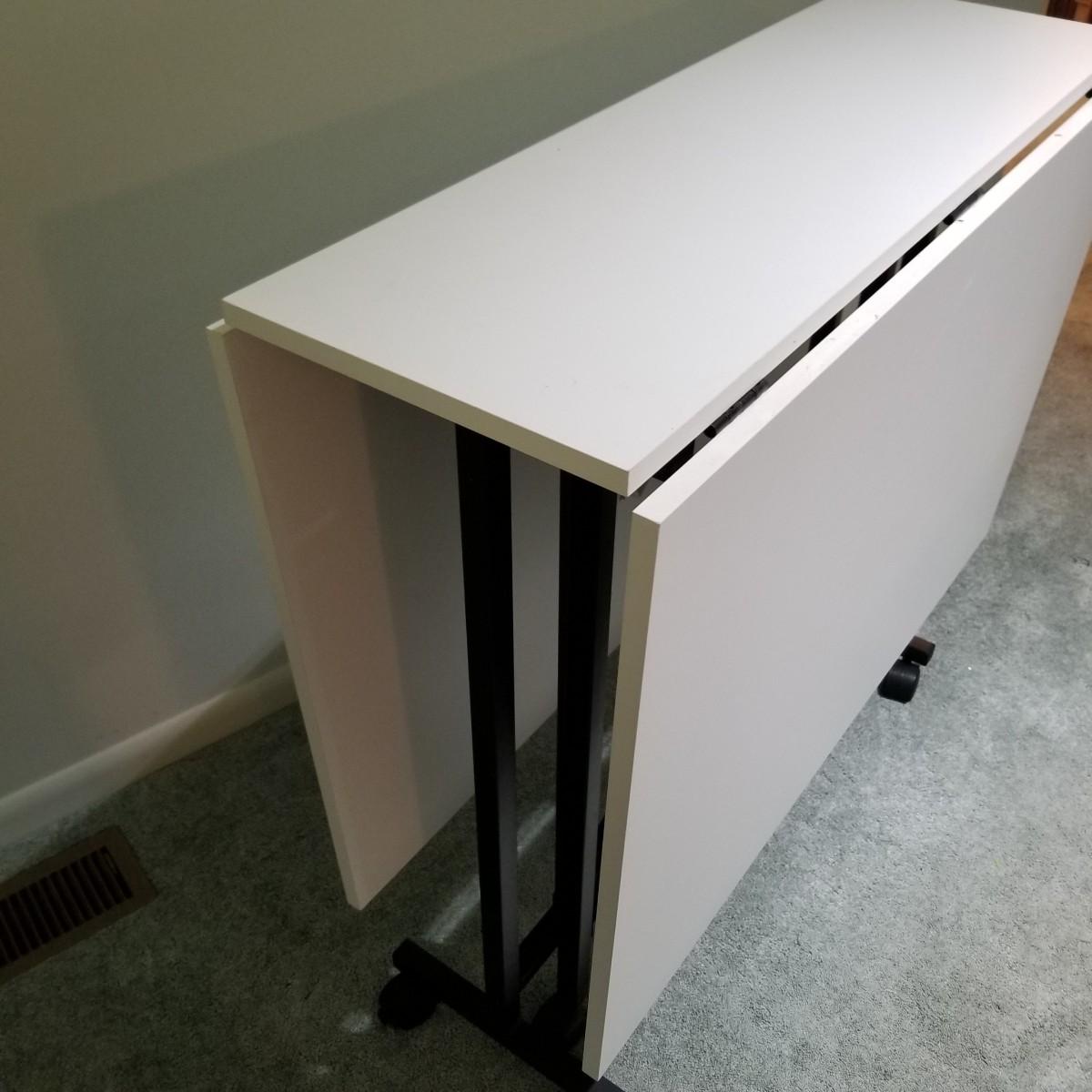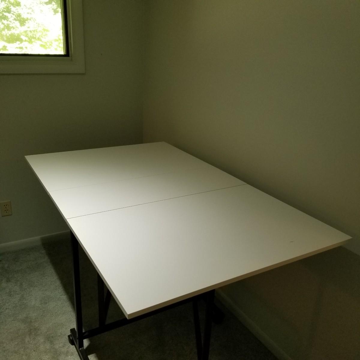 A portable table on casters for quilting or sewing use.  Smooth white laminate surface, table is 13.5"x36"x34" closed, and 36"x60"x34" opened.  Local pickup only.