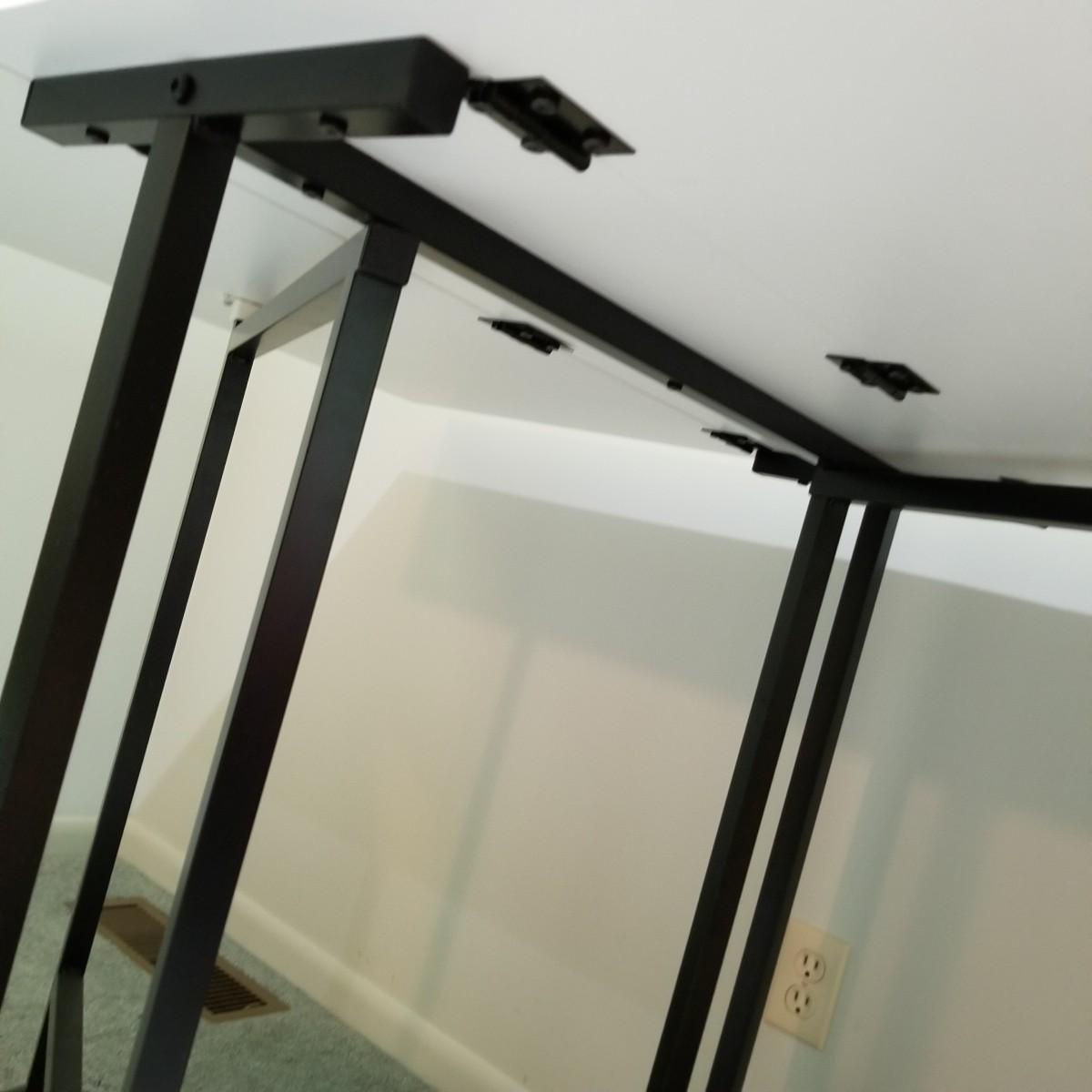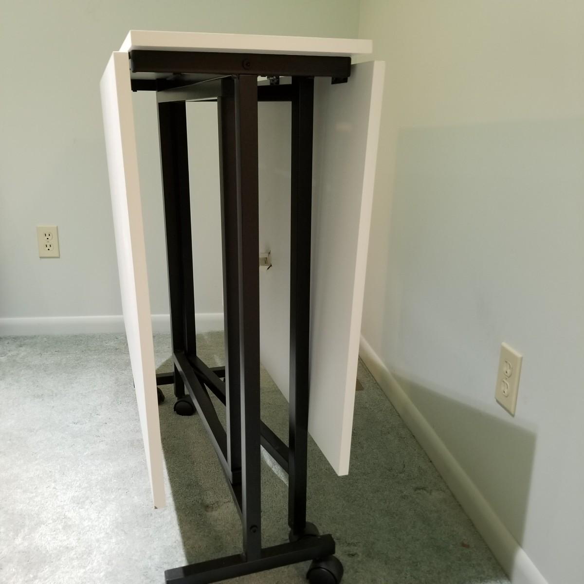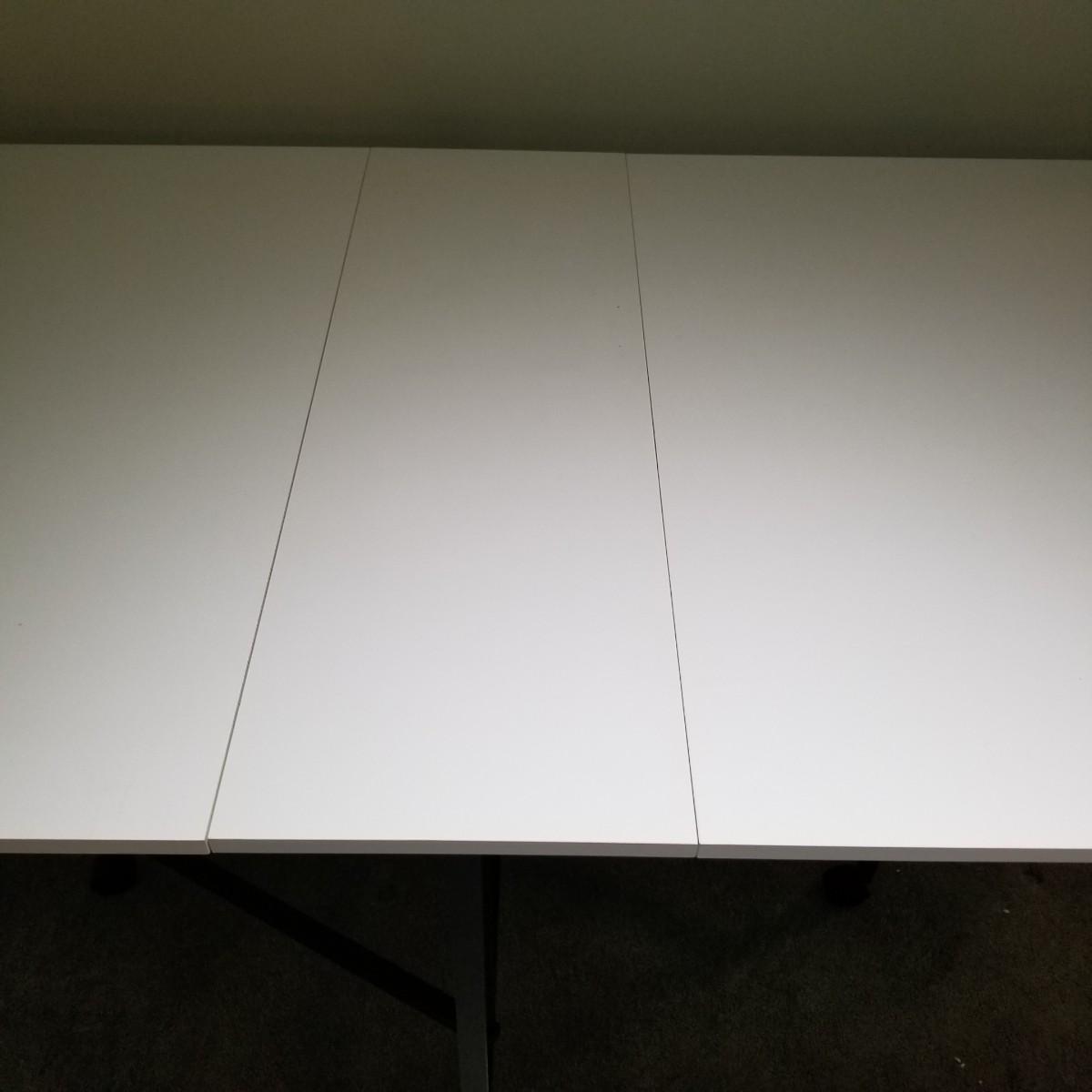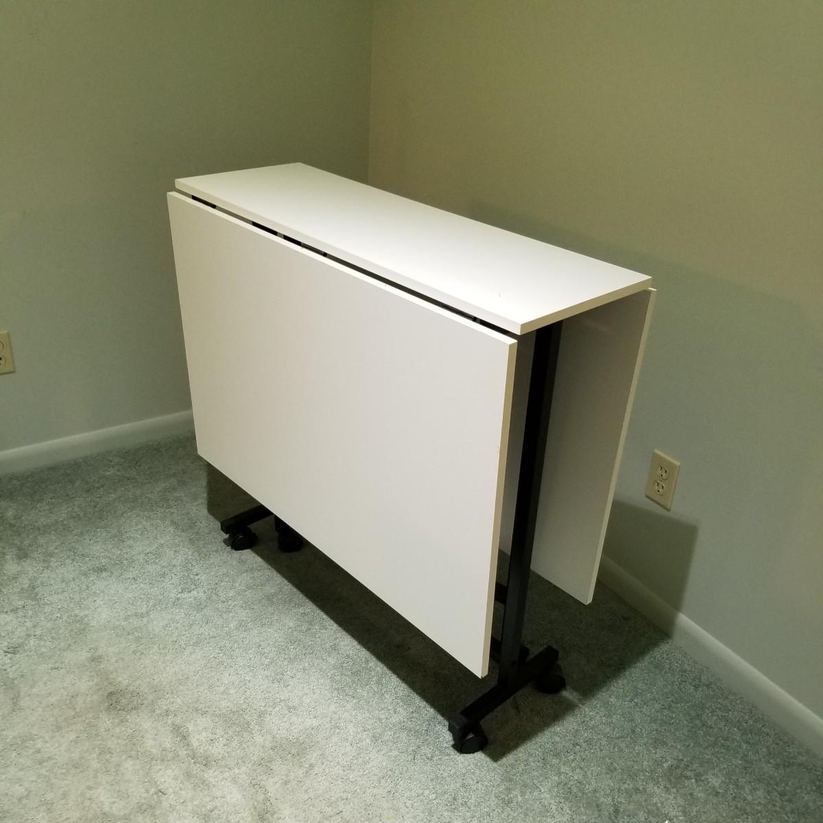 A portable table on casters for quilting or sewing use.  Smooth white laminate surface, table is 13.5"x36"x34" closed, and 36"x60"x34" opened.  Local pickup only.
