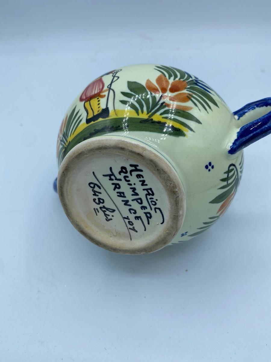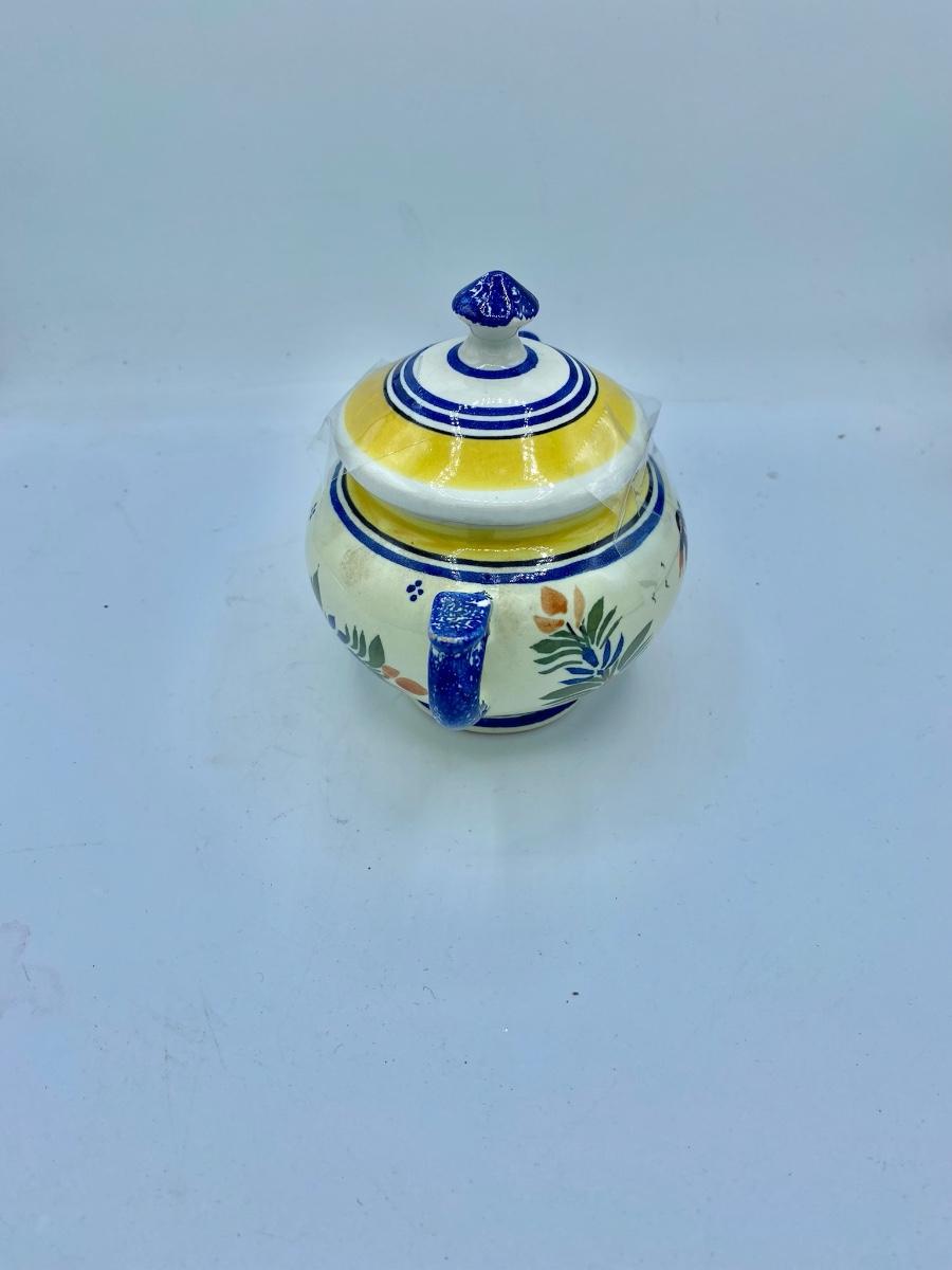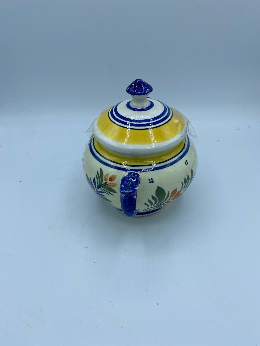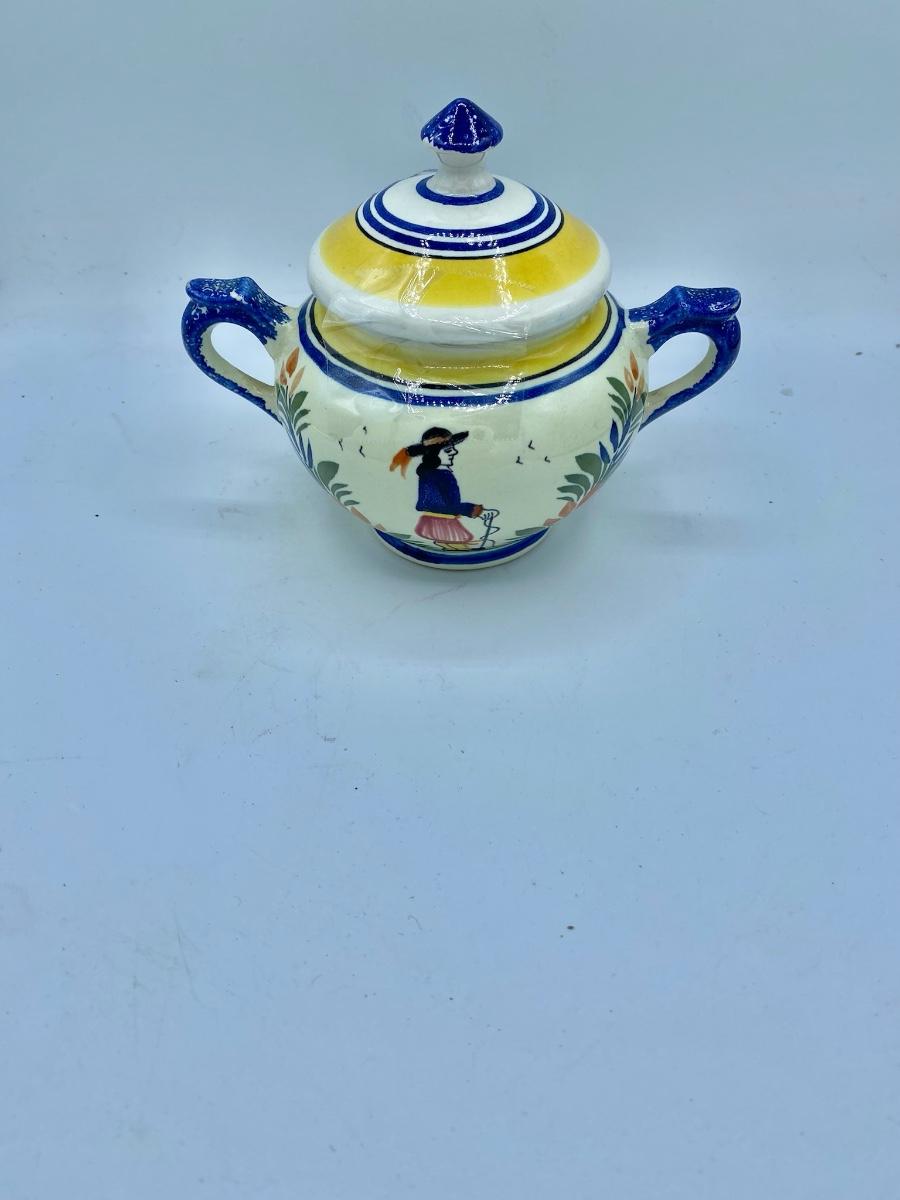 Perfect condition Heneriot Quimper France sugar bowl with lid. Appears brand NEW , no scratches, chips or broken pieces. Beautiful piece to start or add to collection. Approximately 5"Tall, aand 6.5" handle to handle.