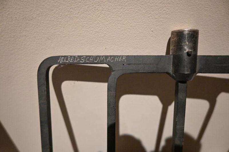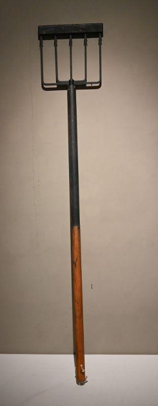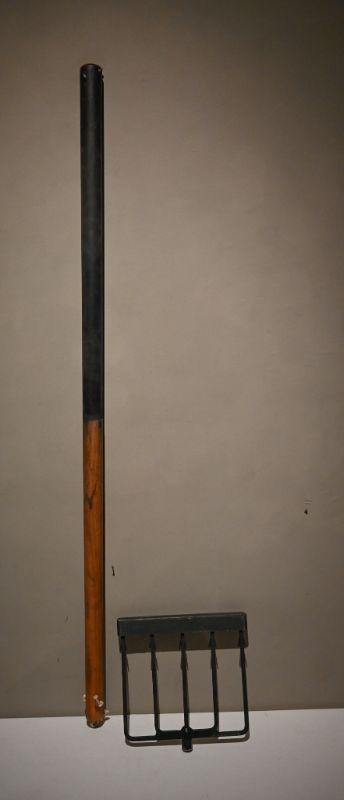A 5-pronged spear by Wisconsin fisherman Aelred Schumacher. Metal and wood. Approx. 12" x 1.5" x 61.5". Please note, the fork had come loose from it's staff, as photographed.