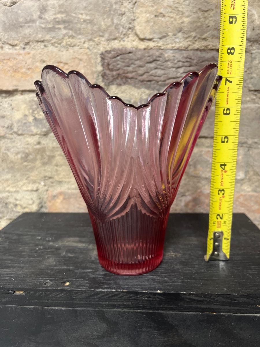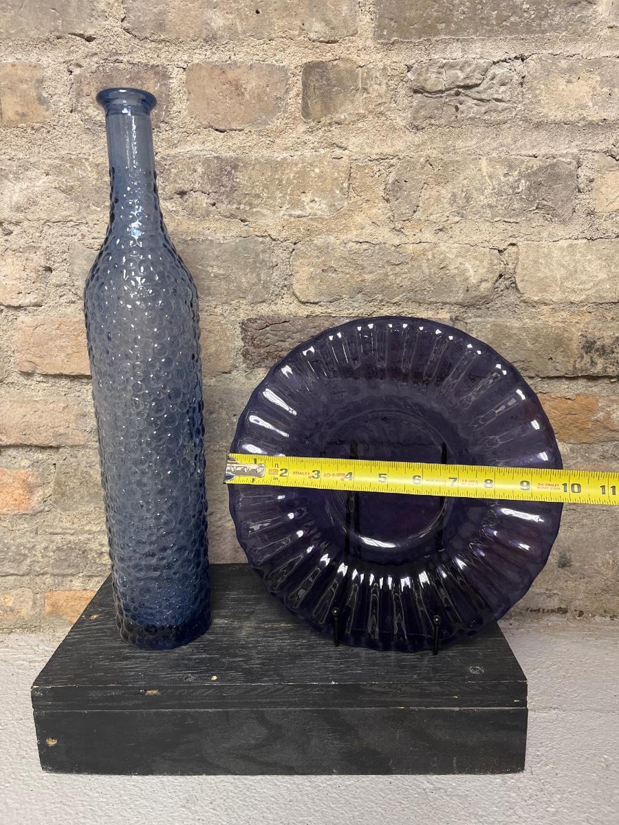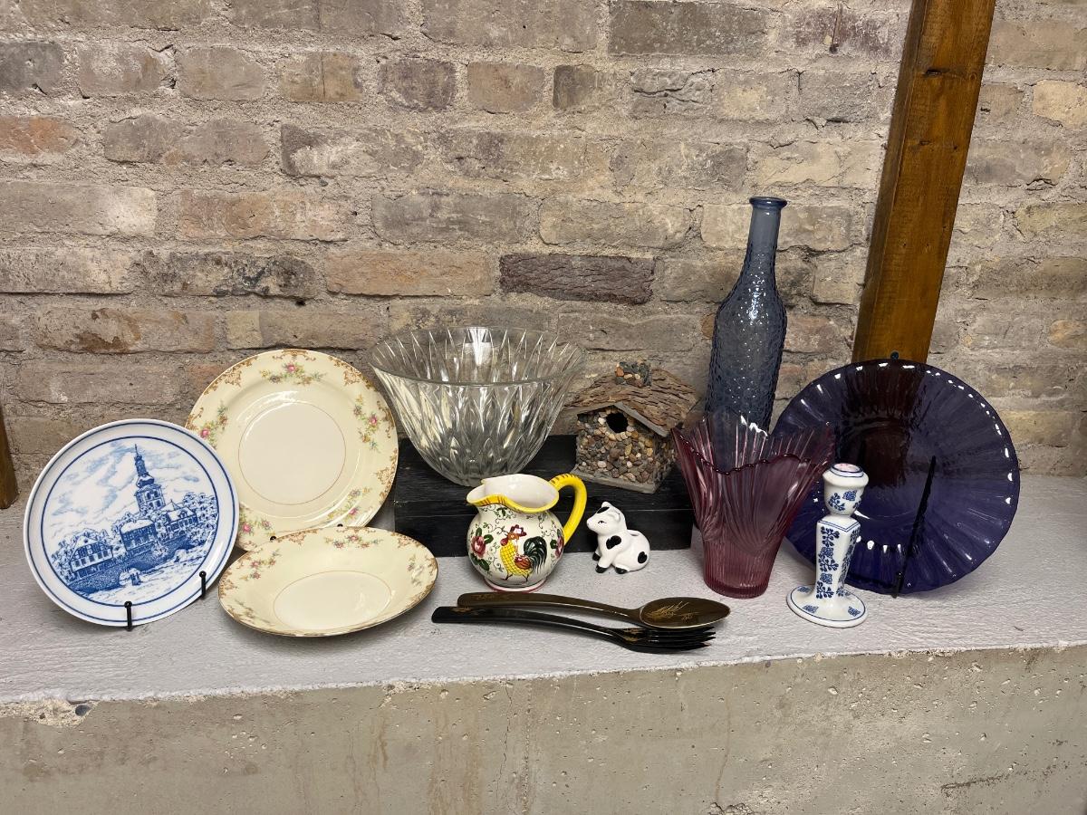 A little bit of everything here! Large crystal bowl, beautiful cranberry fluted vase, amethyst shallow bowl and bottle, Nautilus eggshell plate and bowl, enameled salad servers, singular candlestick, Japan pitcher, little cow toothpick holder, and pebble and bark birdhouse