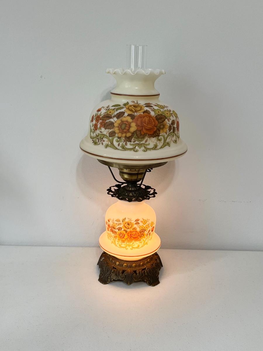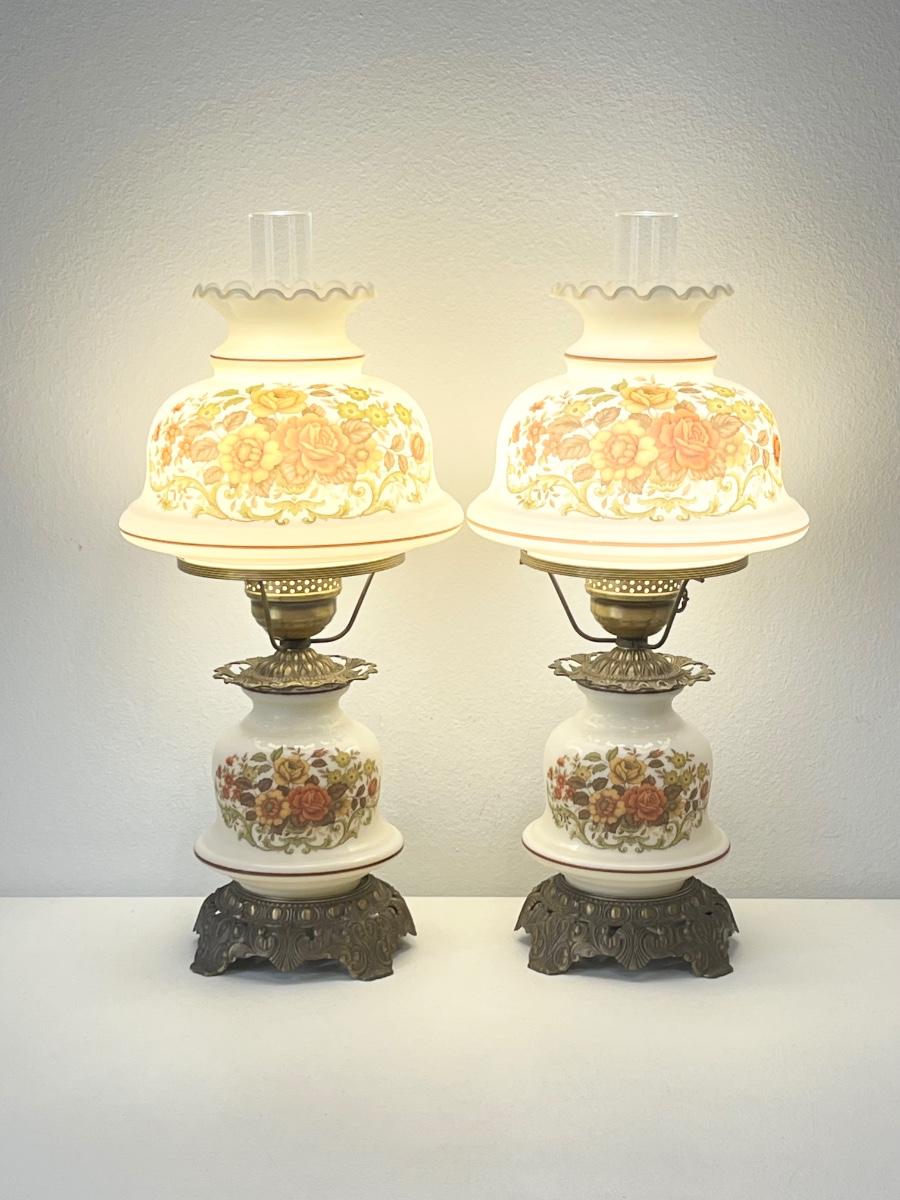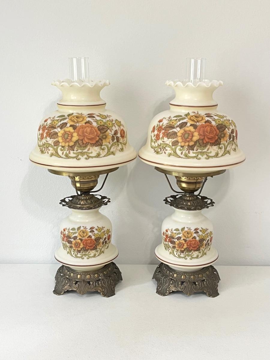 QUOIZEL INC. ~ Pair (2) Vtg. Floral Glass & Metal Hurricane Lamps ~*Read Details