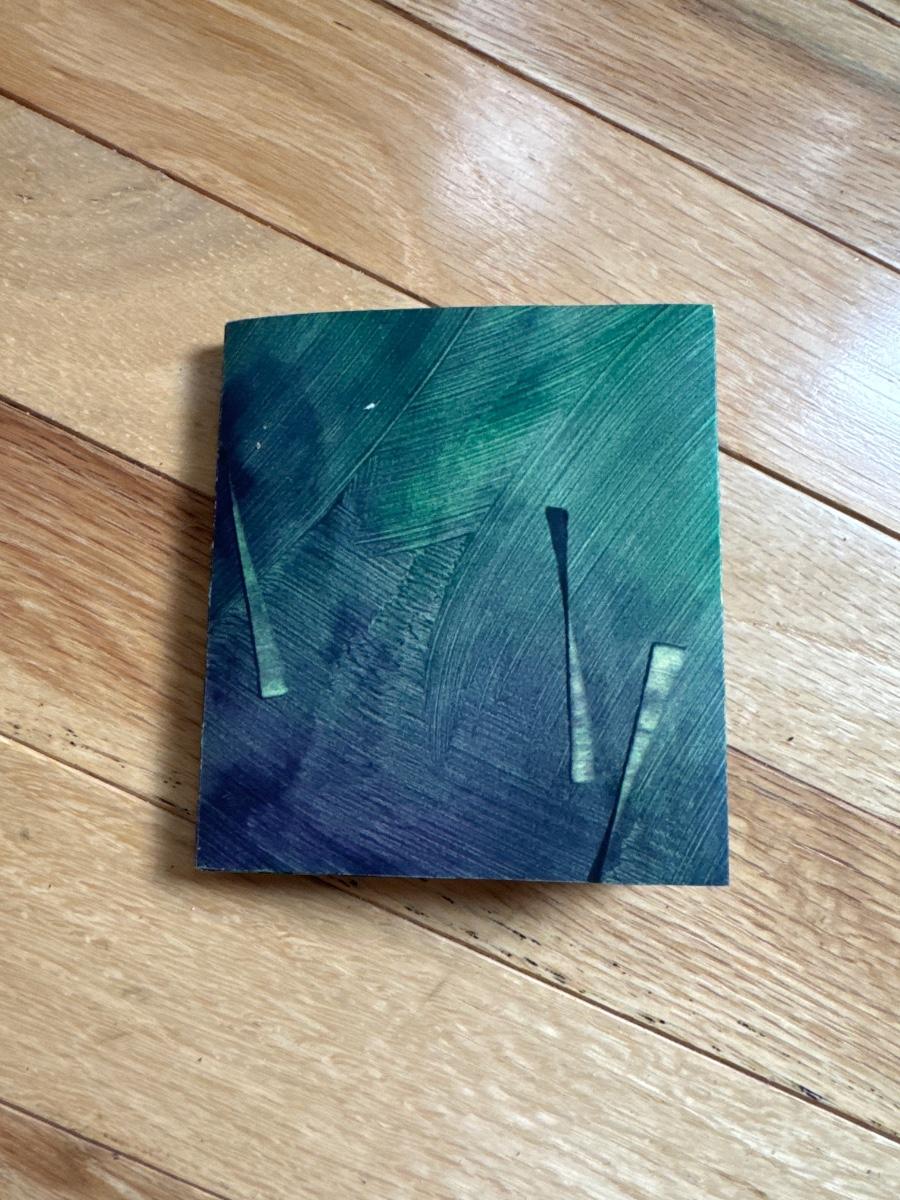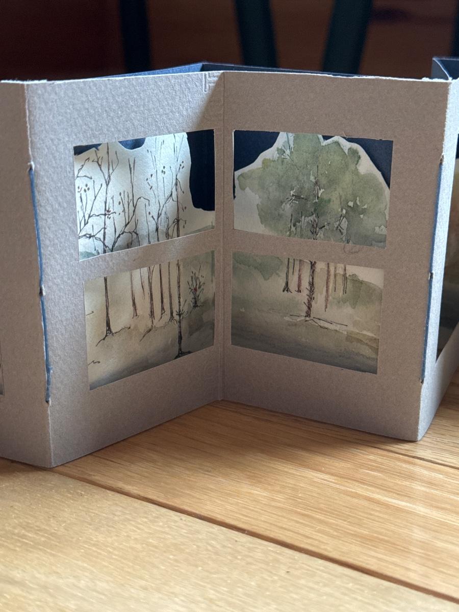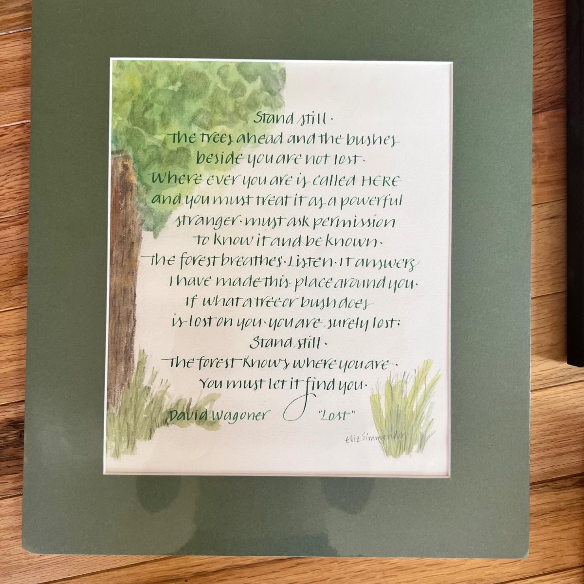 Four pieces of art and a fold up card. Two of the artworks are framed. The matted expression that begins "What would the world be..." measures 11” square. The green matted expression beginning with “Stand Still…" measures 12“ x 14“. The pinecone double matted and metal framed piece measures 14“ x 11.75” and the "trees" framed and matted piece measures 10“ x 8“ x 5/8“. The paper design card in book-form measures approximately 4“ x 4“.